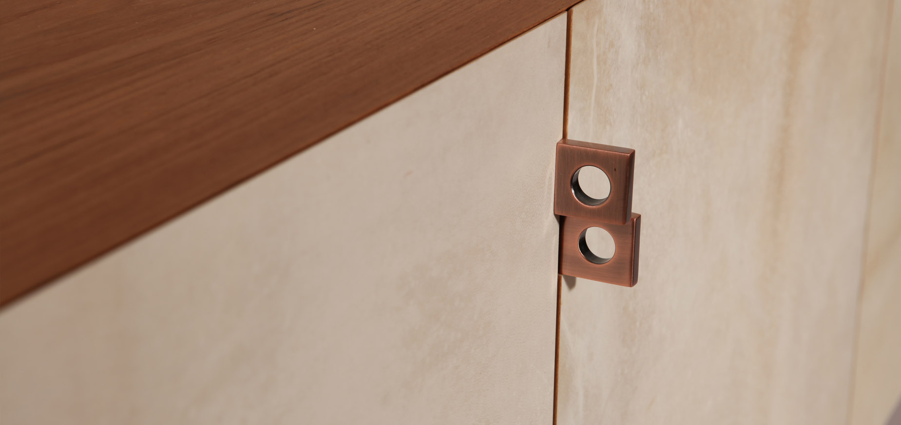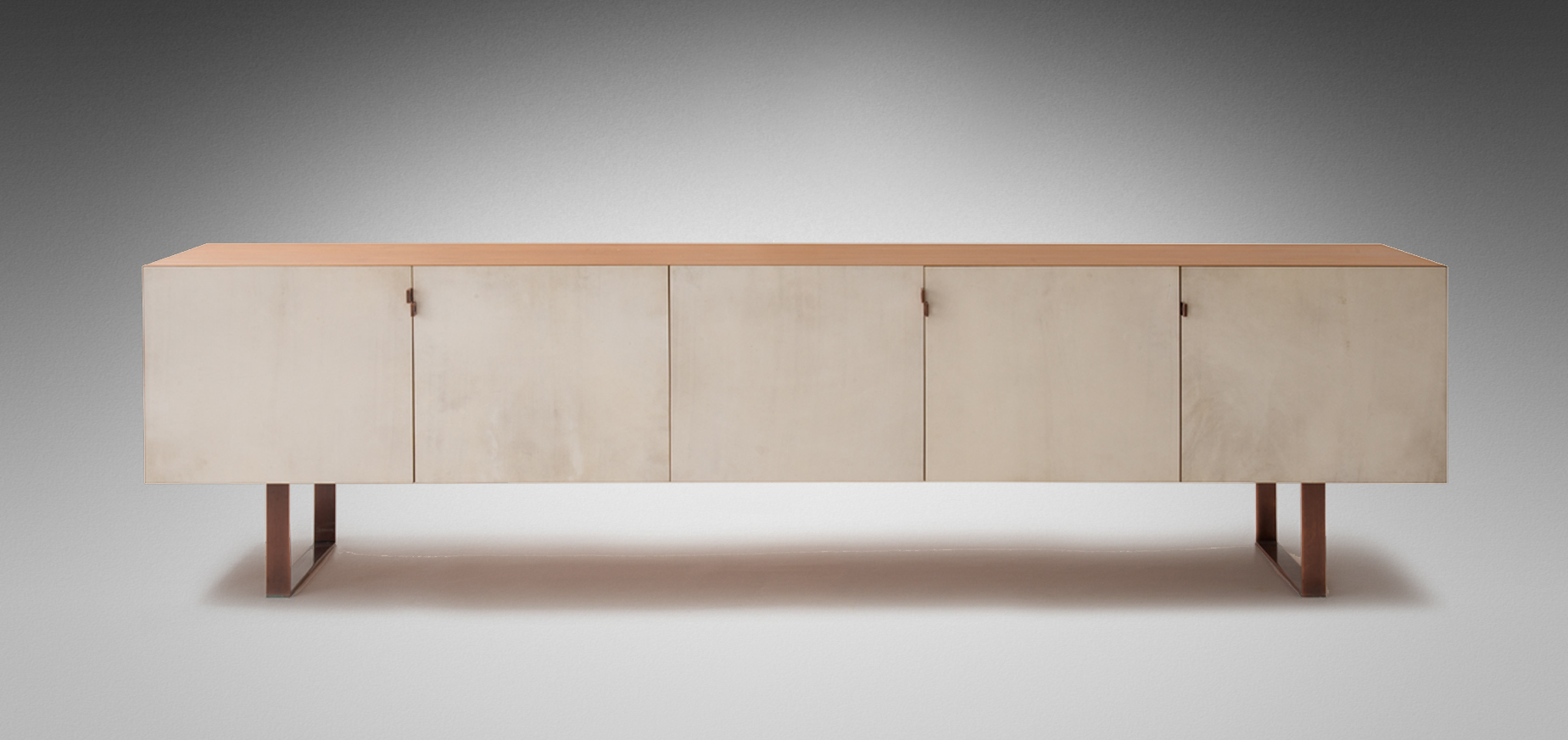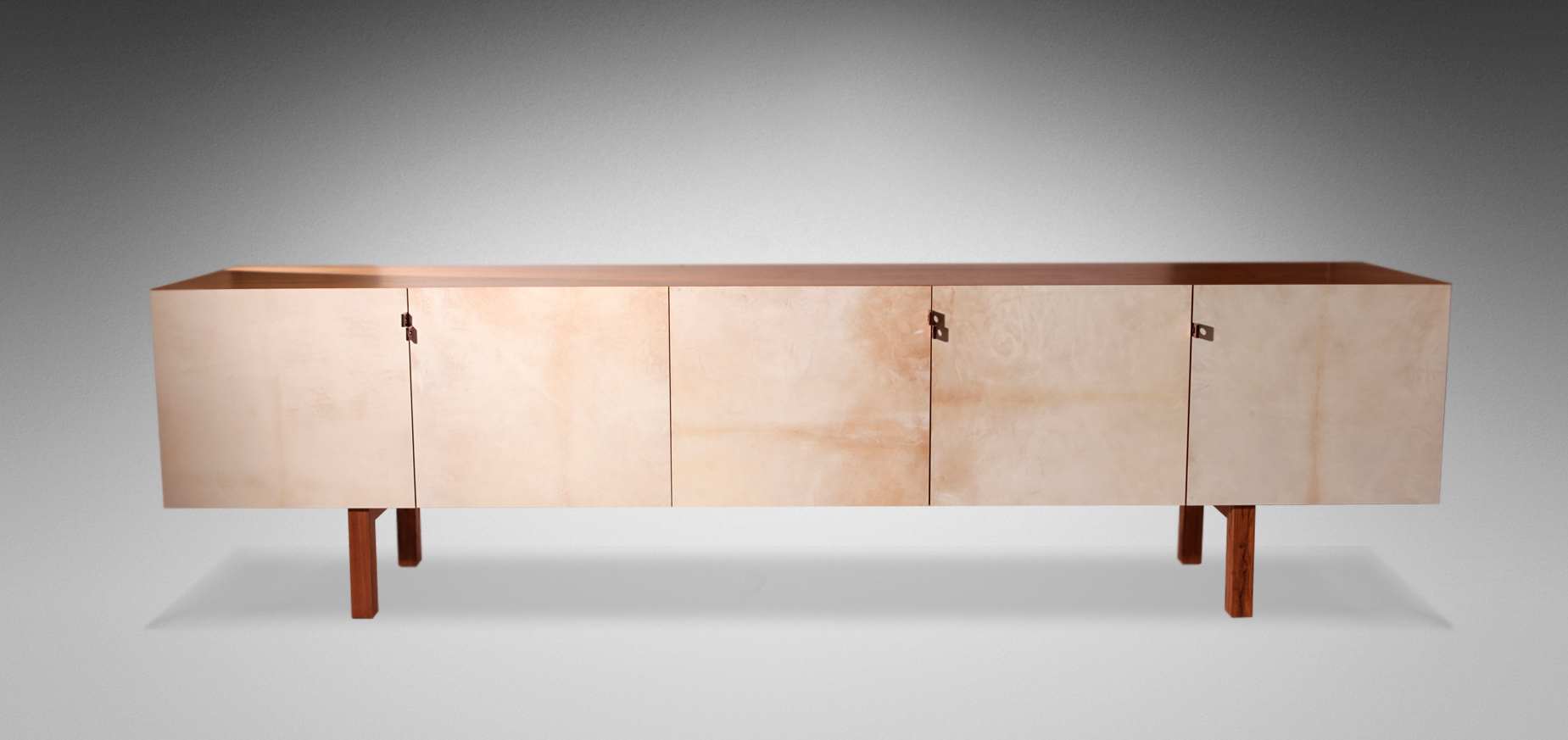 Aparador com portas em pergaminho, puxadores exclusivos em cobre envelhecido, madeira a escolher. Gavetas e prateleiras internas. Os pés do aparador podem ter como opção, a madeira ou cobre envelhecido.