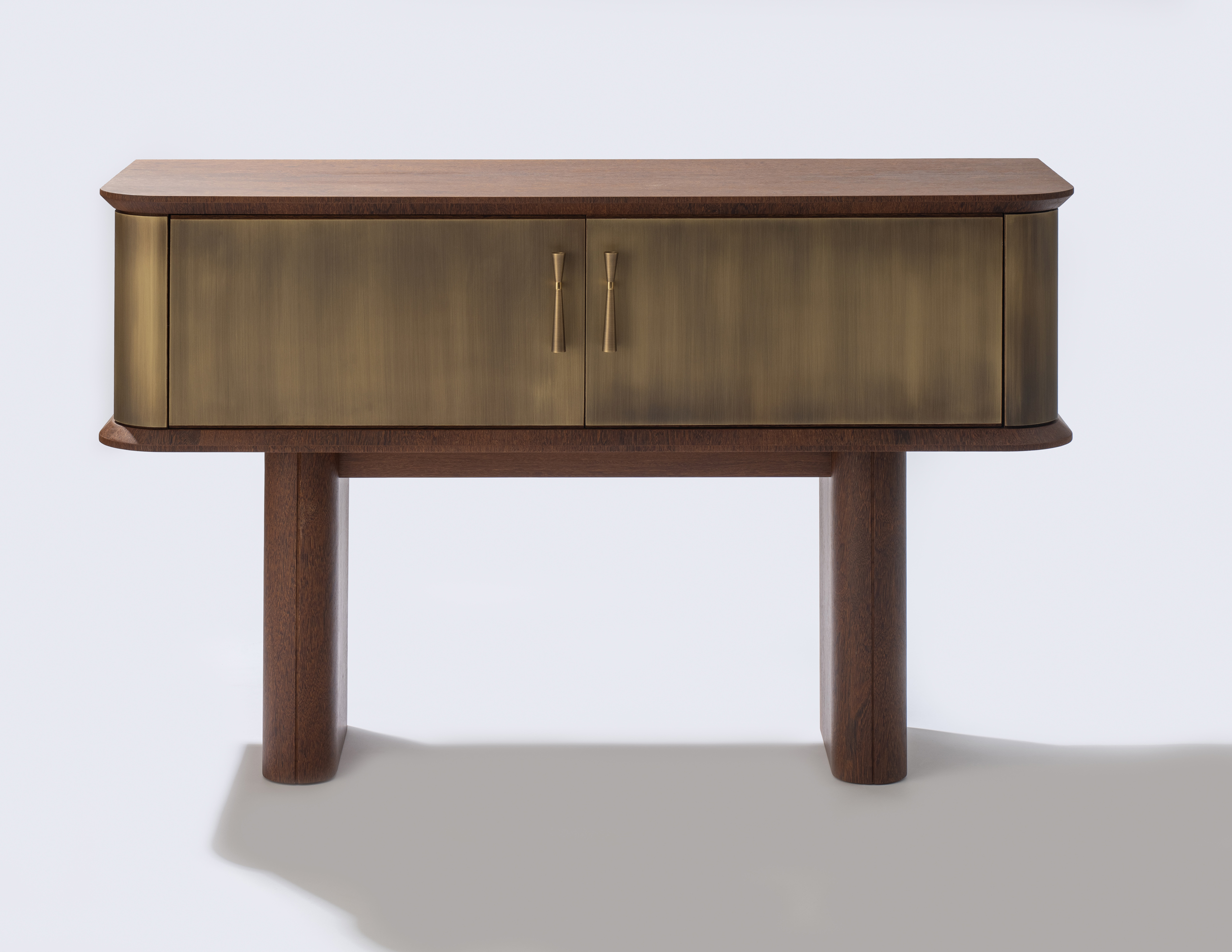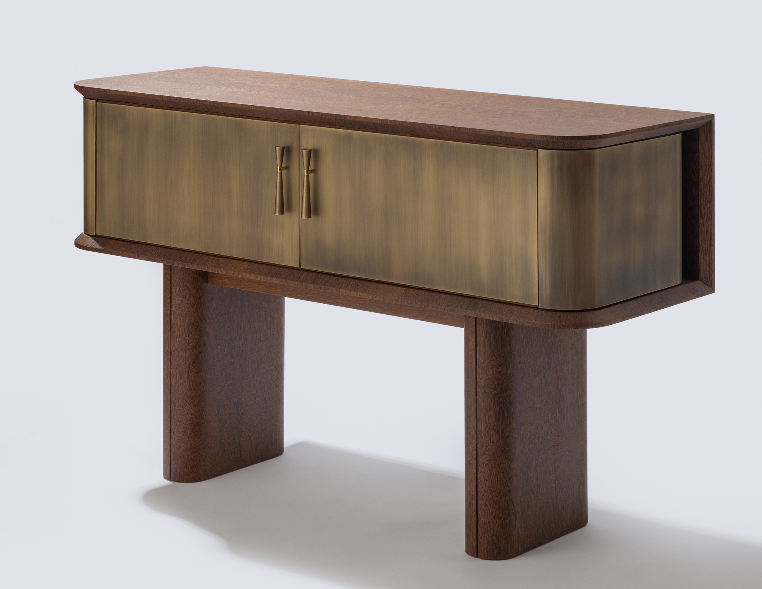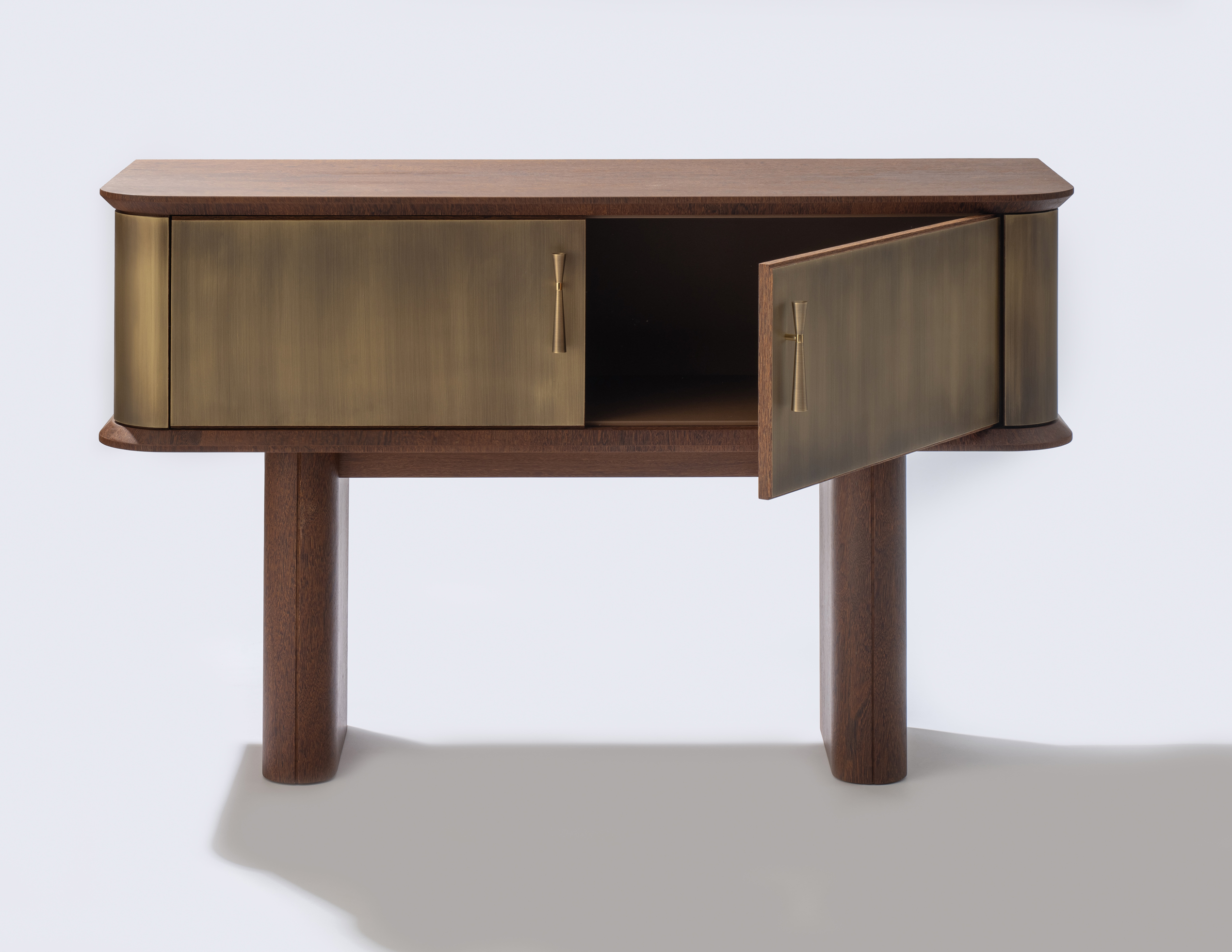 Aparador com revestimento das portas, laterais e puxadores em latão envelhecido e sua interna revestida em couro. Aparador Ebisu possui opção sem revestimento de latão em sua externa.
