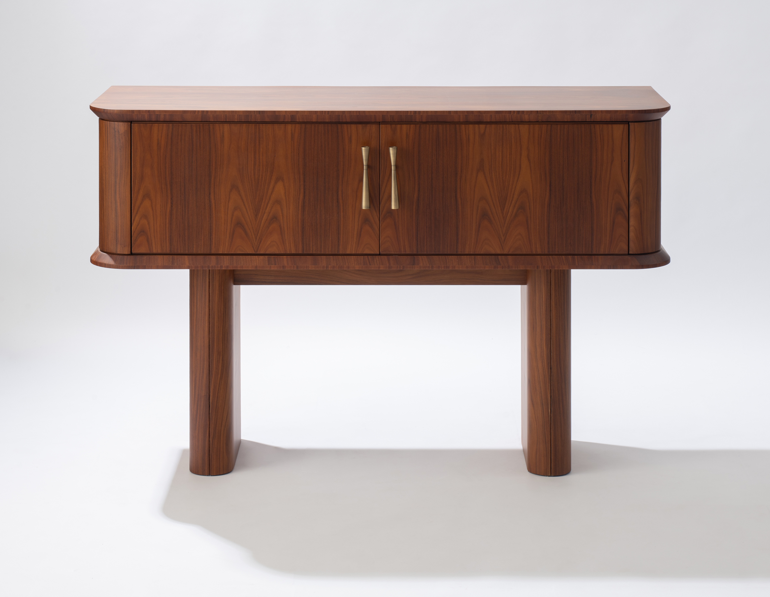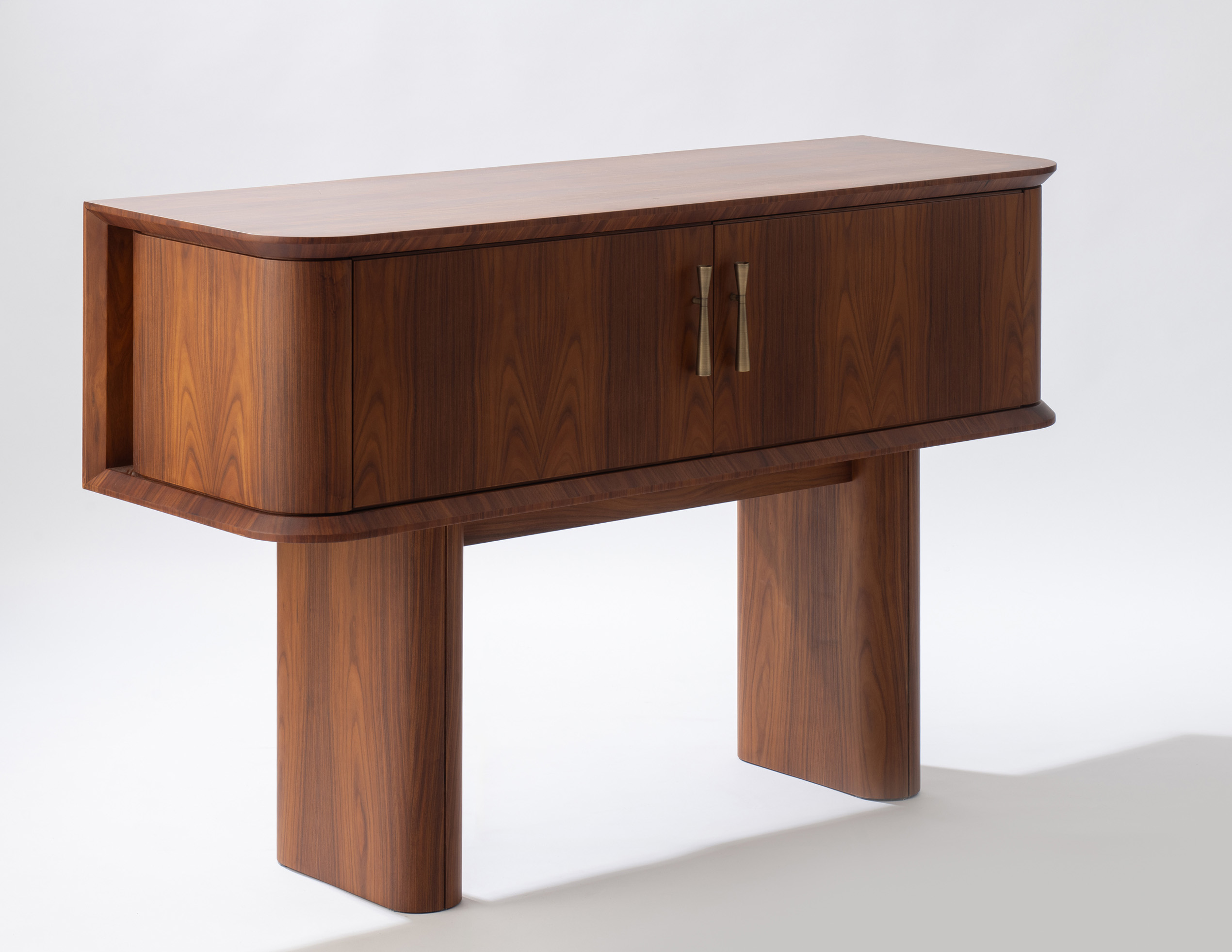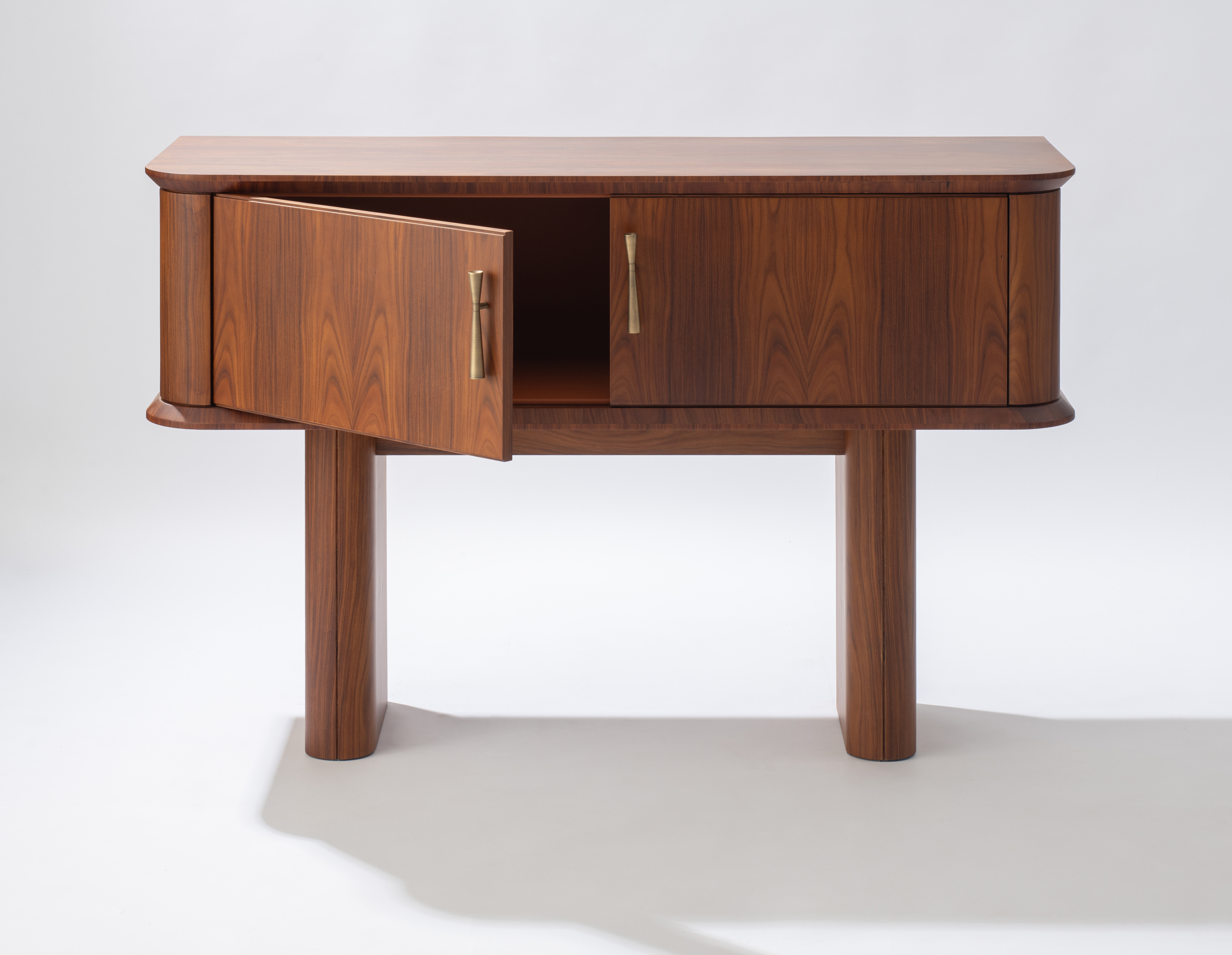 Aparador com revestimento das portas, laterais e puxadores em latão envelhecido e sua interna revestida em couro. Aparador Ebisu possui opção sem revestimento de latão em sua externa.