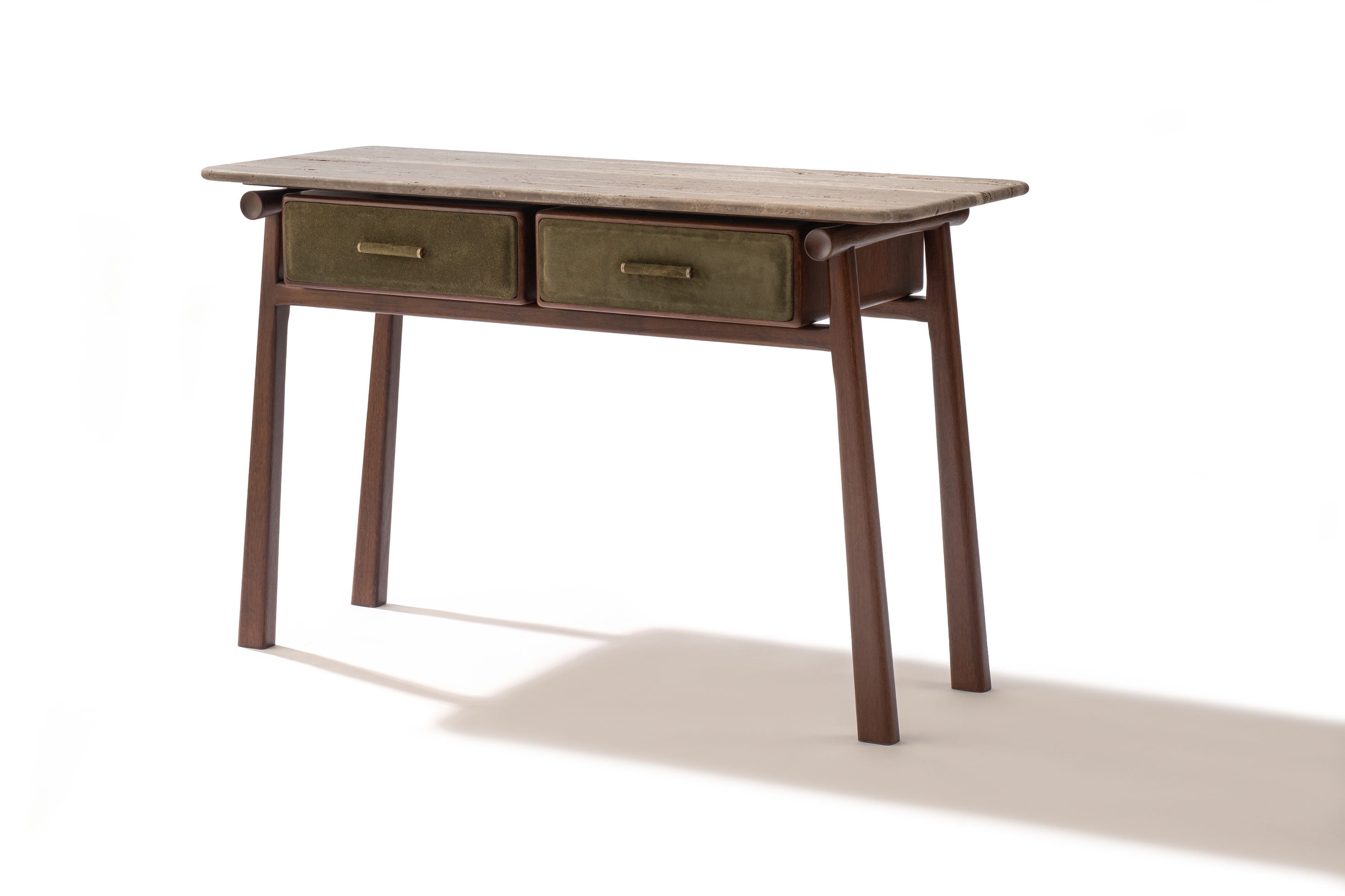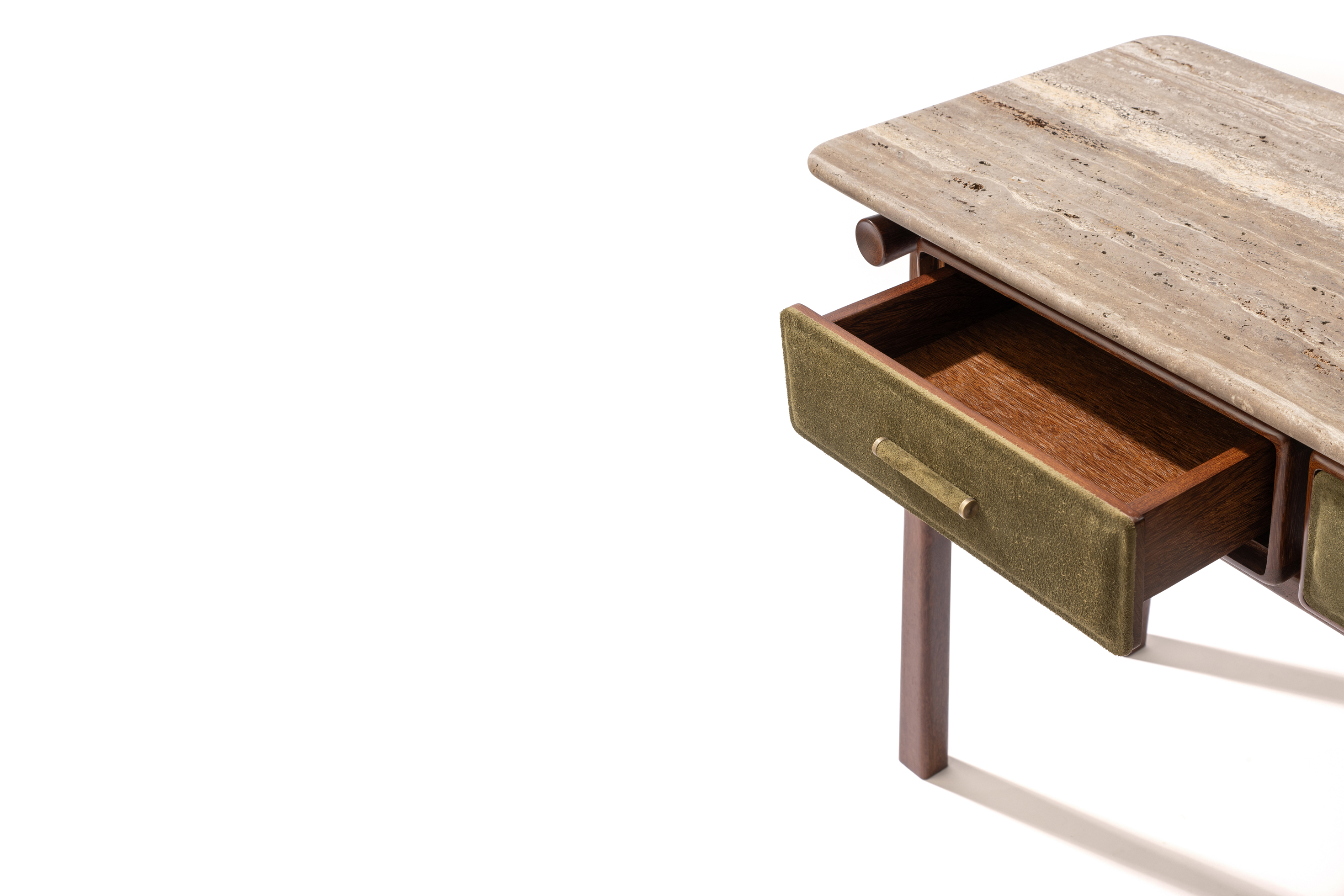 Aparador composto por tampo em mármore e estrutura em madeira maciça. A gaveta, revestida em camurça natural, recebe um delicado detalhe em latão envelhecido. Disponível também com tampo em madeira.