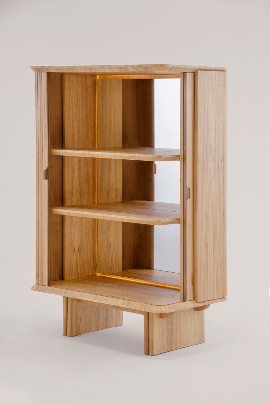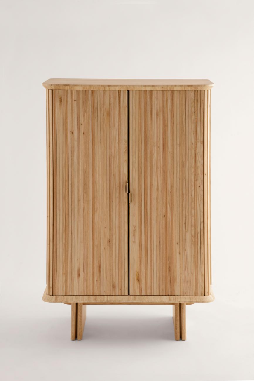 Armário produzido todo em madeira com detalhe do puxador em latão envelhecido, possui espelho e iluminação interna.