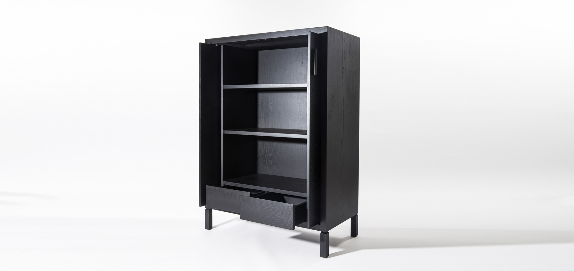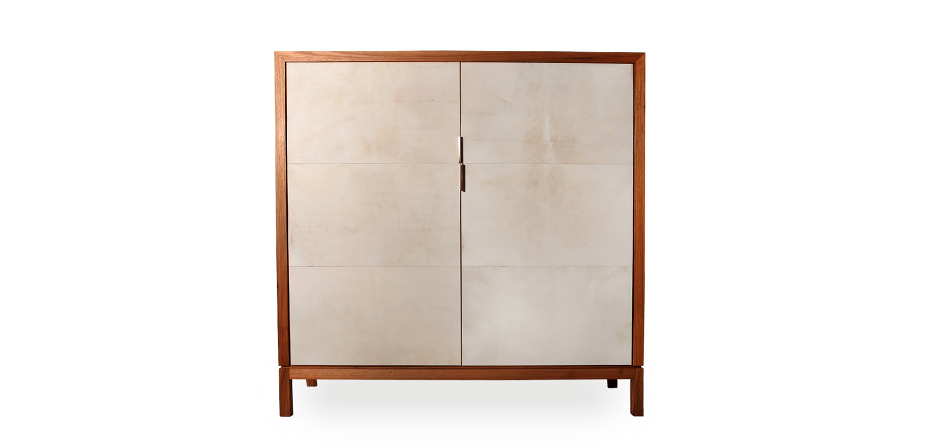 Peça vertical, com portas retráteis, gavetas, puxadores em couro natural. Revestimento das portas com opções em pergaminho ou palha confeccionada artesanalmente.