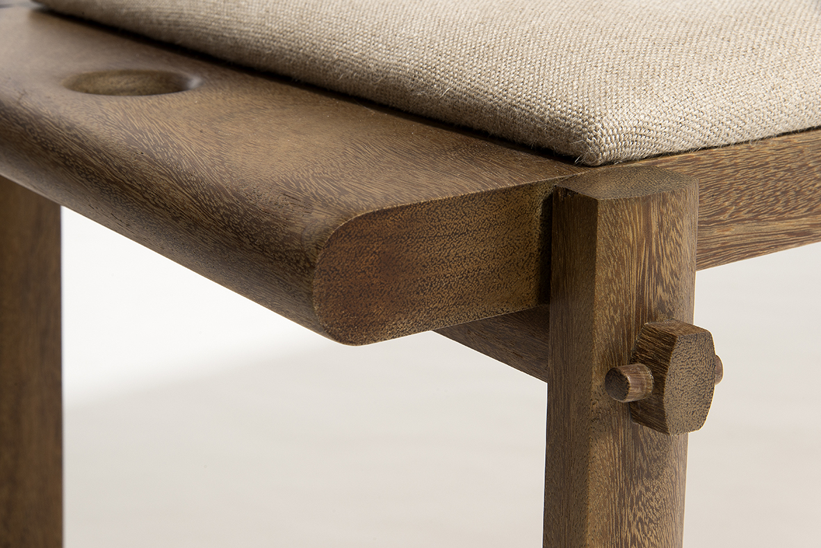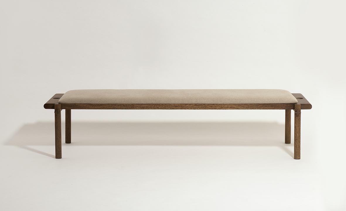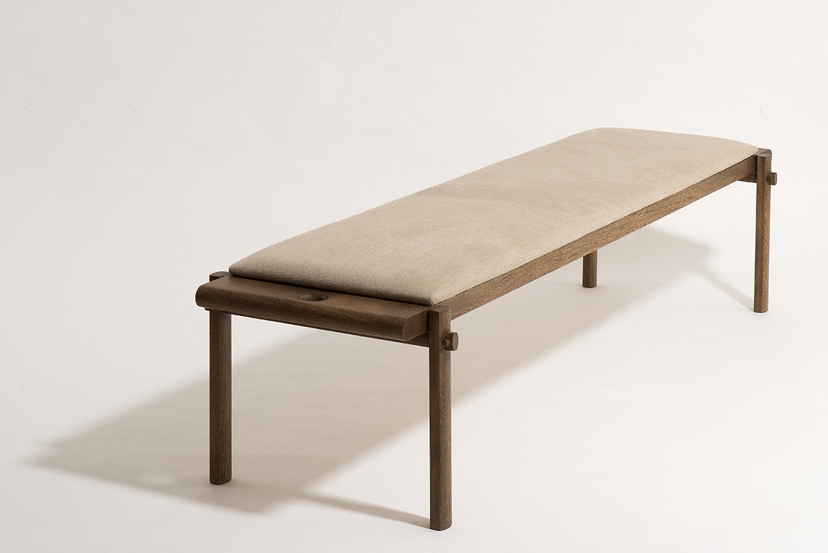 Banco Rita é produzido em madeira maciça Sucupira ou Freijó nas opções natural ou lavada, seu assento é estofado com possibilidade de ser revestido com tecido ou couro.