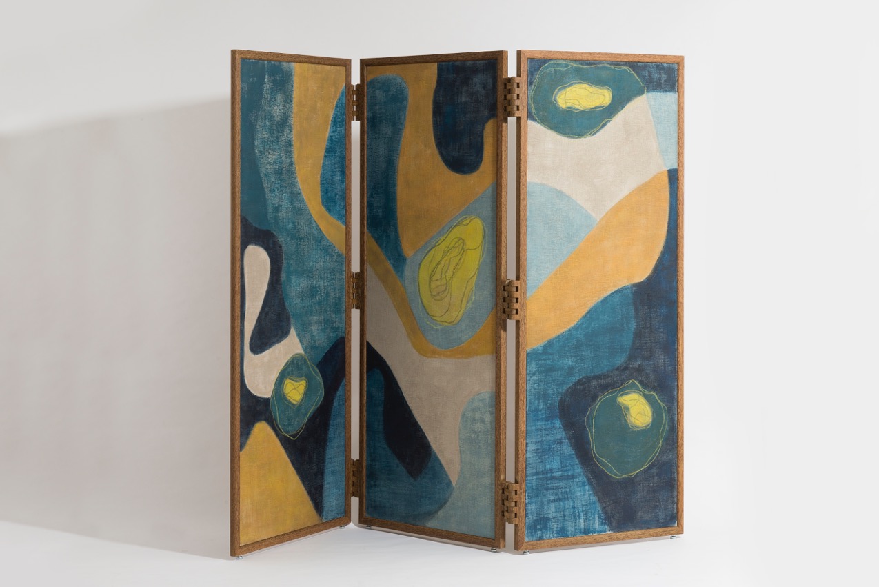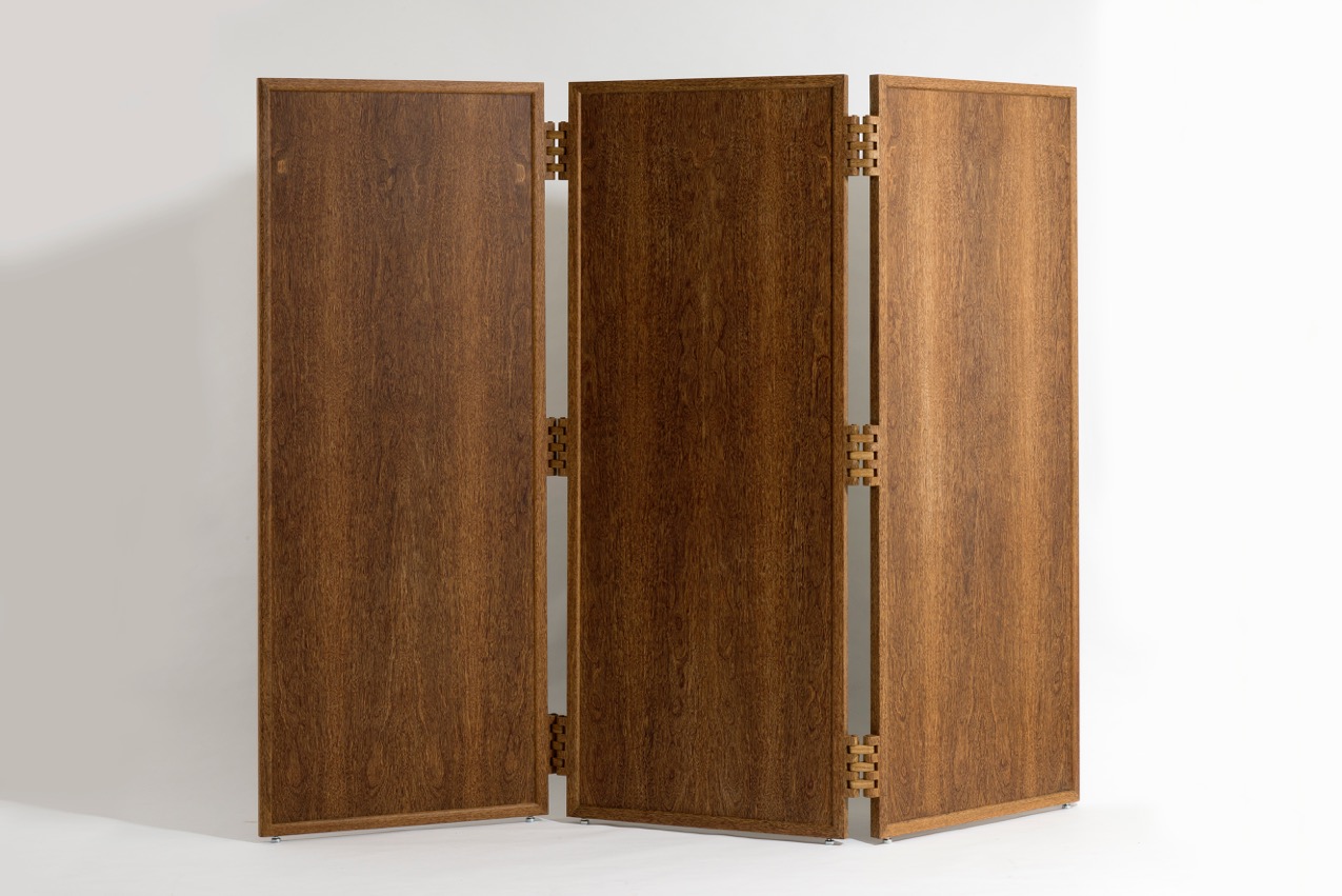 Biombo Laura pode ser produzido em sucupira e freijó com acabamentos natural ou lavado, seus painéis podem ser revestido em tecido, com pintura, pergaminho ou todo em madeira.