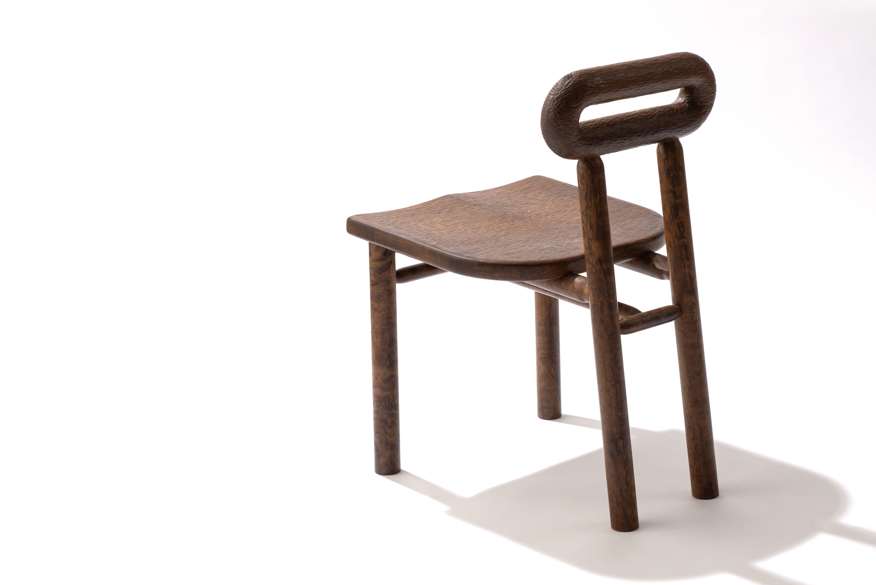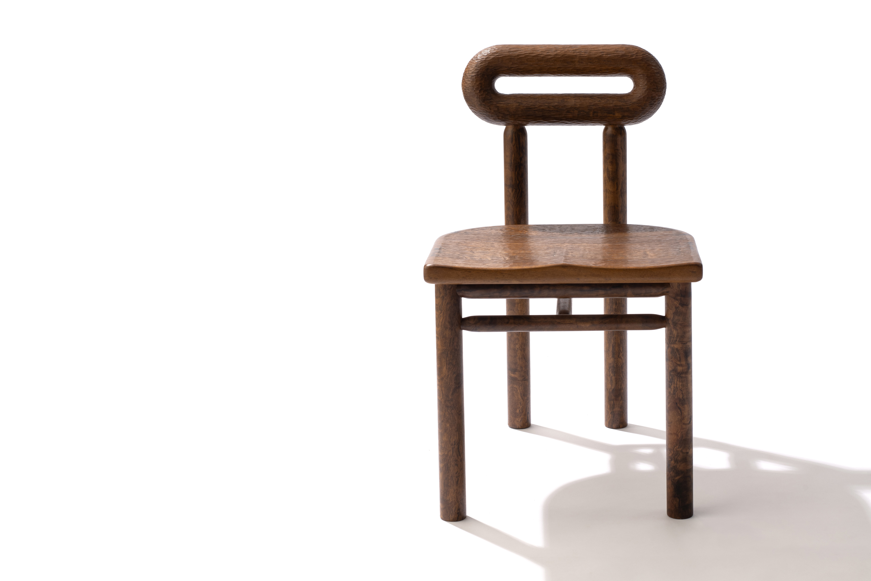 Cadeira produzida em madeira maciça, com entalhes manuais no encosto e no assento que valorizam o acabamento artesanal da peça.
