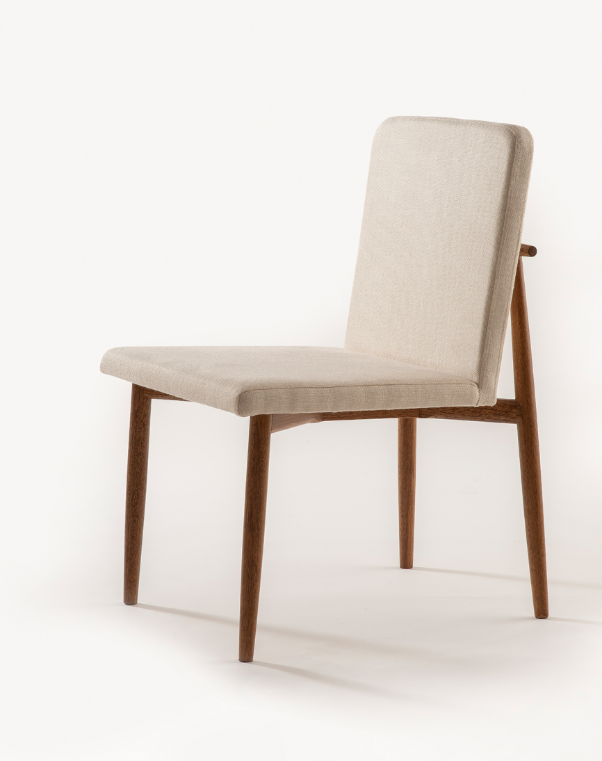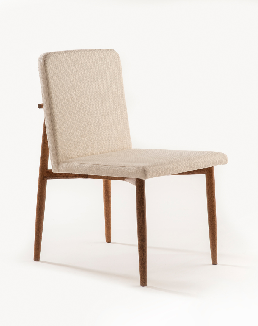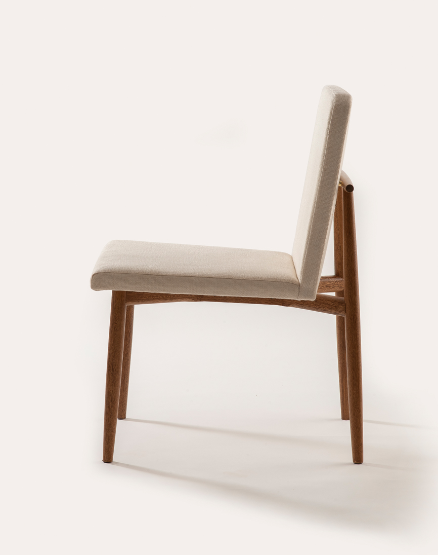 Cadeira Equilíbrio possui estrutura em madeira maciça torneada, com estofaria em linho e um delicado detalhe em latão polido.