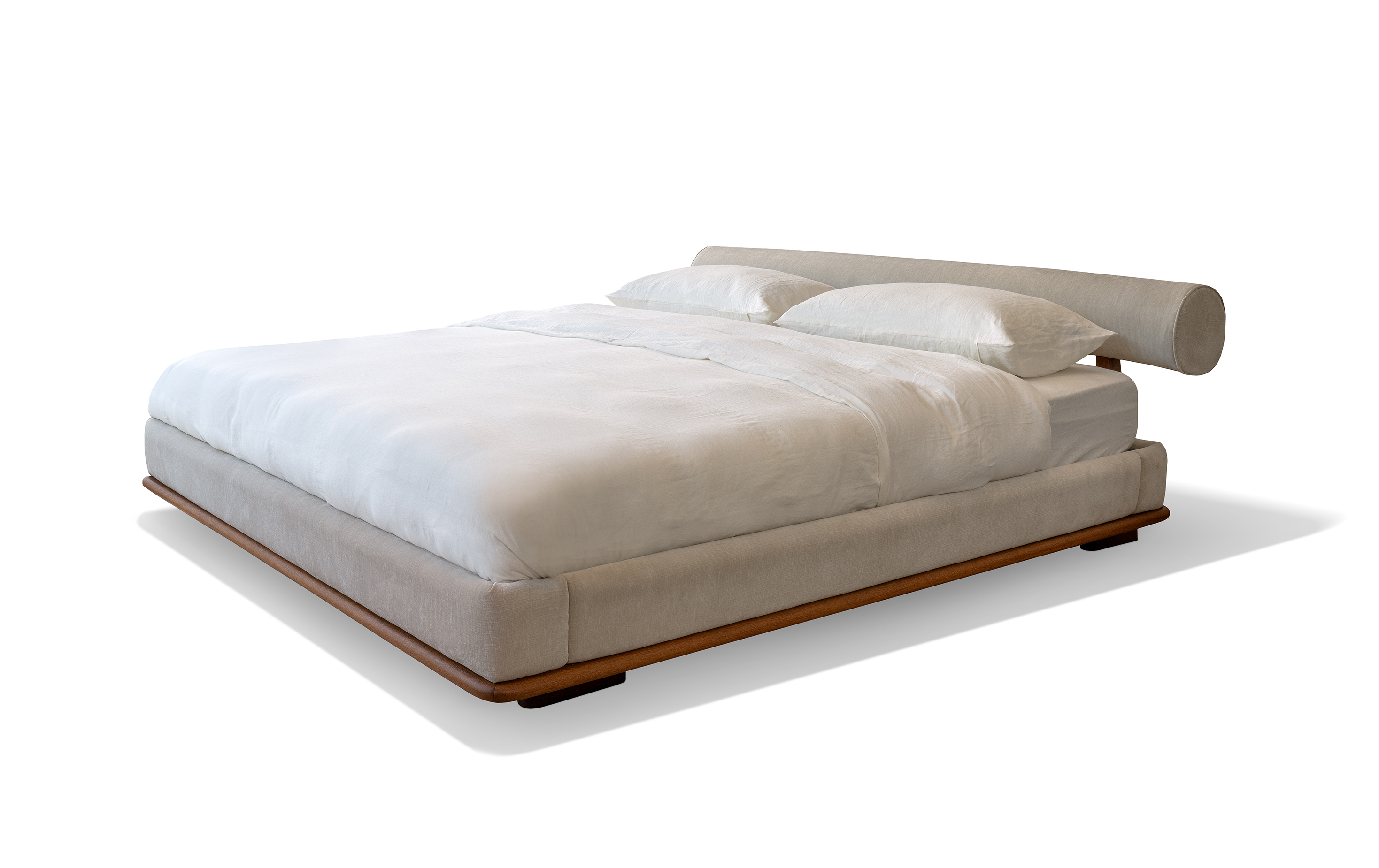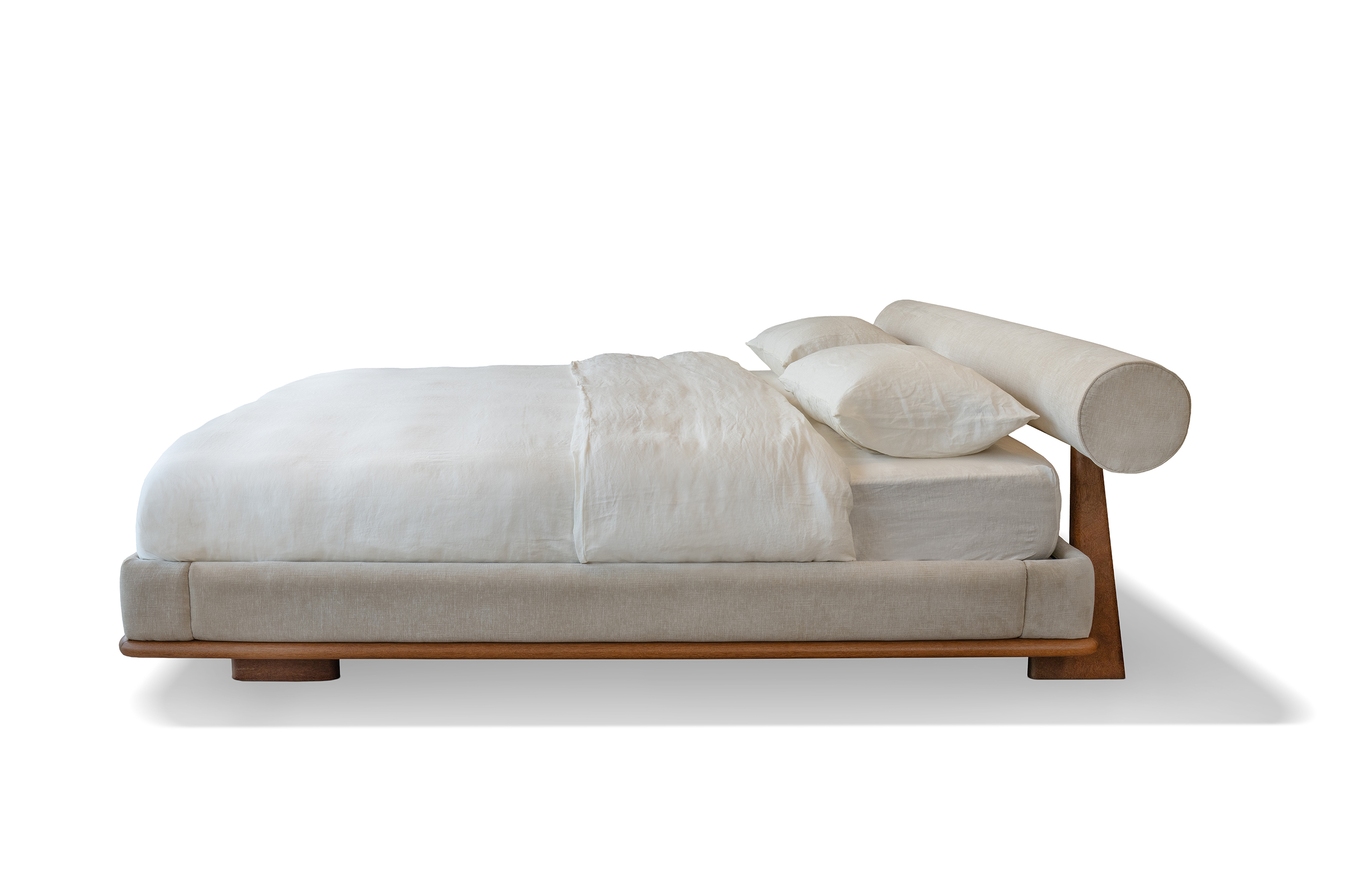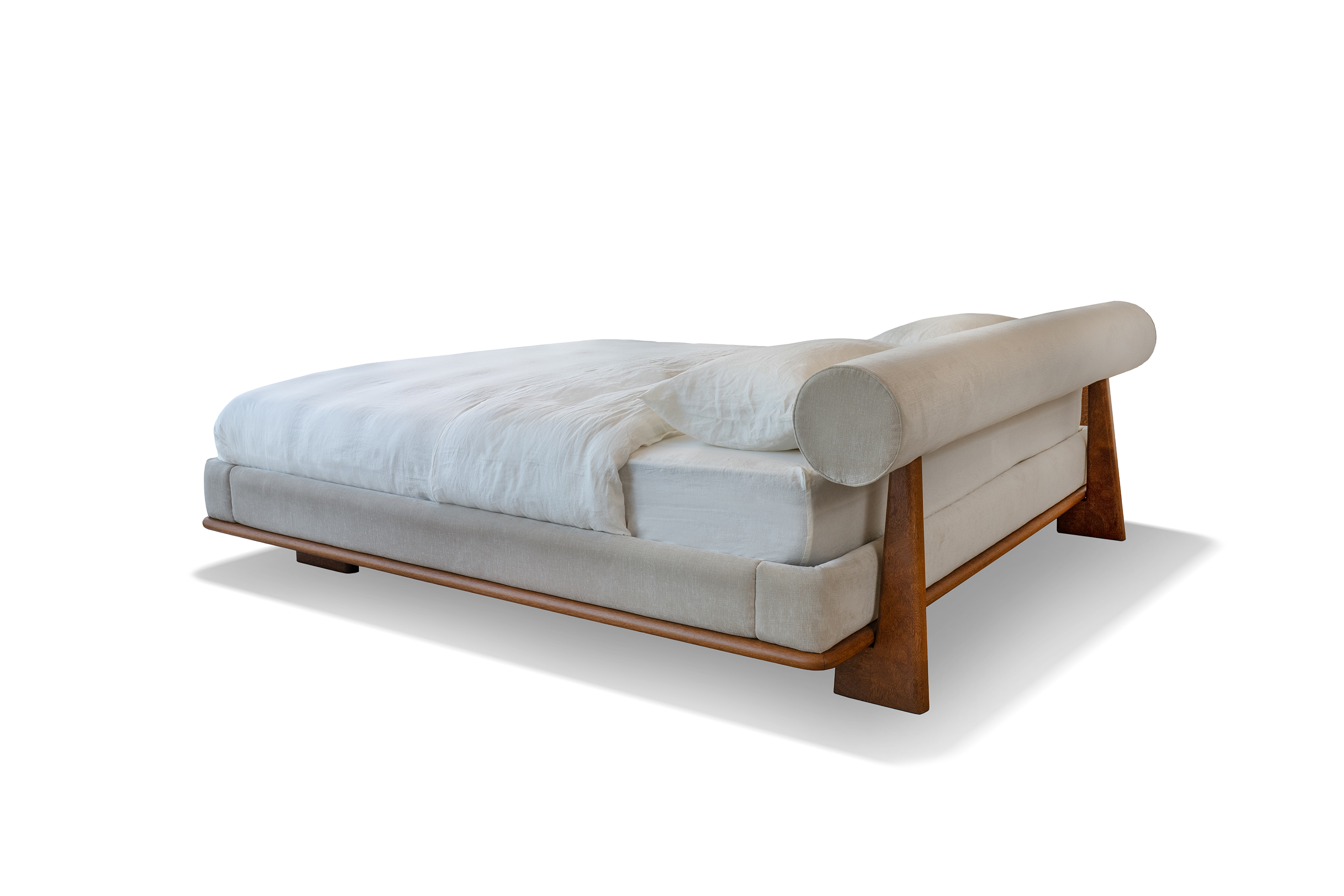 Cama Nara possui a estrutura do encosto e base em madeira maciça Sucupira, enquanto o encosto cilíndrico e estrutura laterais são revestidos em veludo.