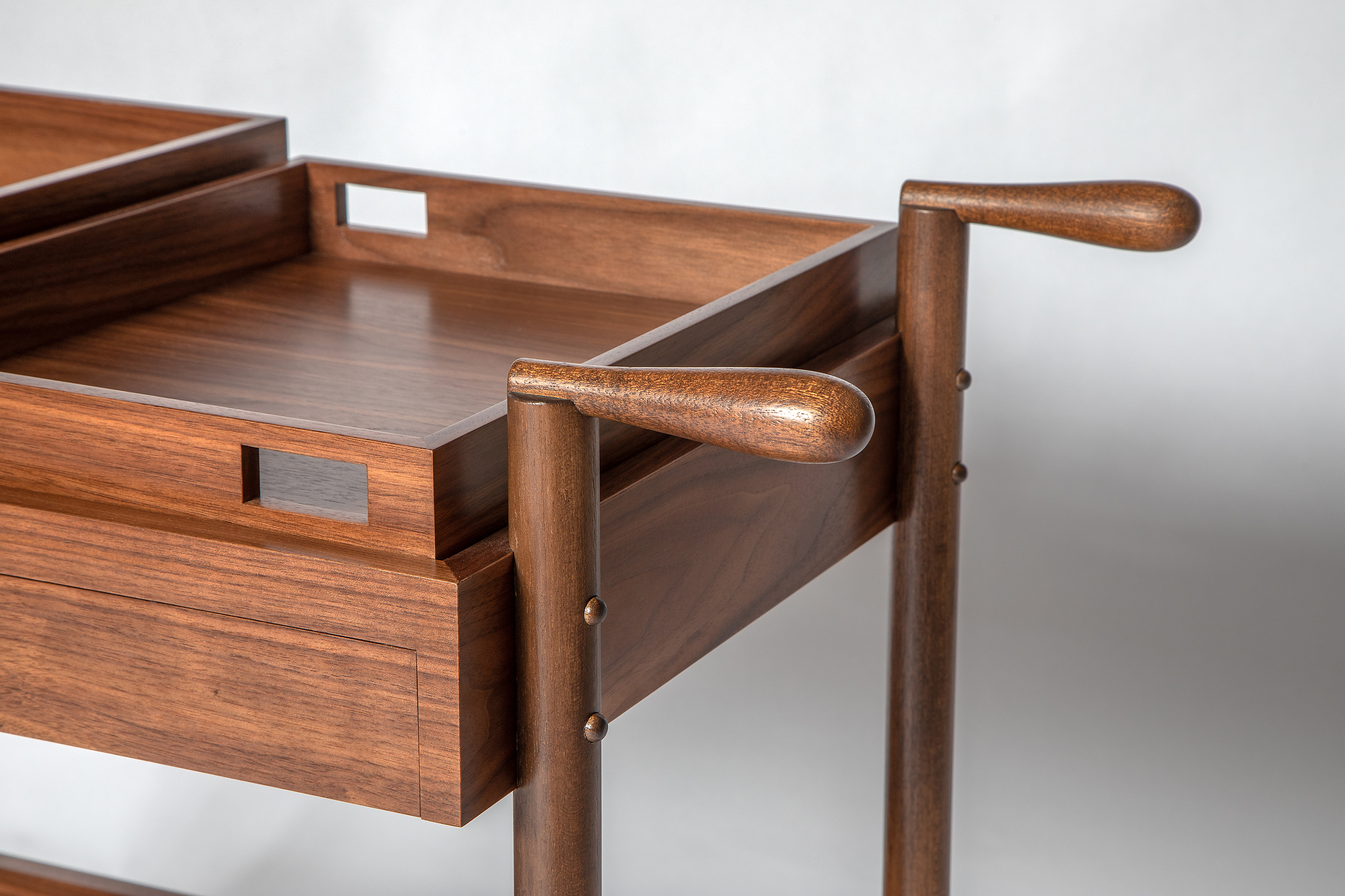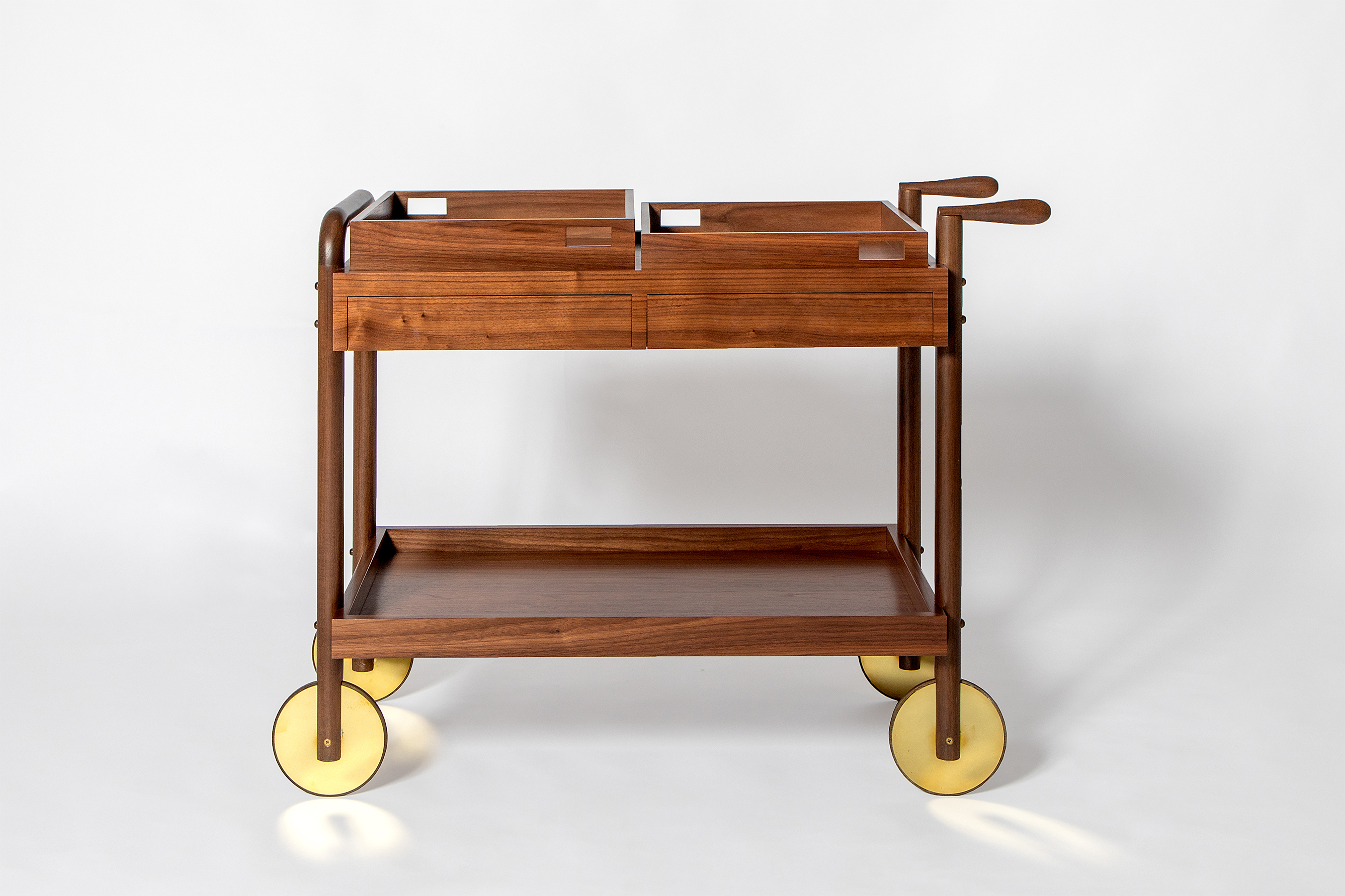 Carrinho de chá possui duas gavetas e duas bandejas, confeccionado em madeira tom Nogueira com acabamento de latão nos rodízios.