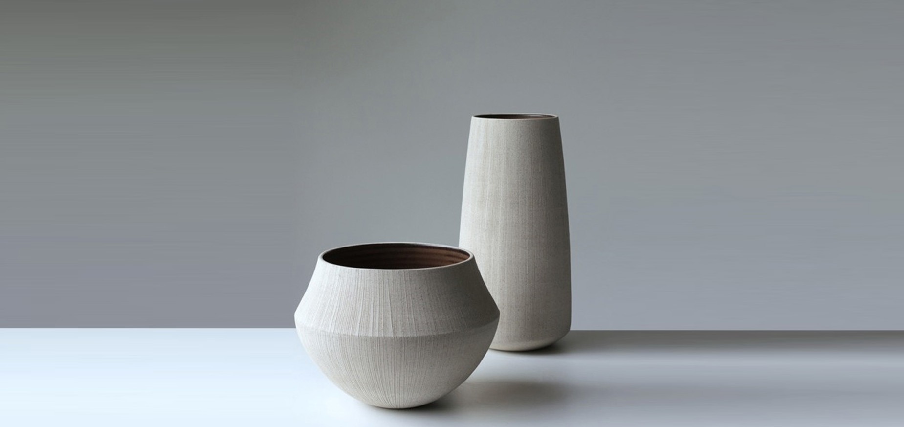 A esquerda : VASO “PIPA”AREIA COM LINHAS INCISAS e a direita :VASO CÔNICO AREIA COM LINHAS INCISAS