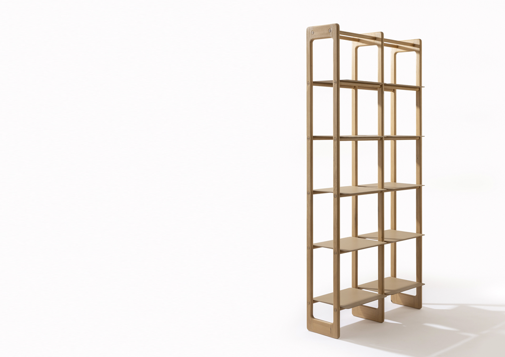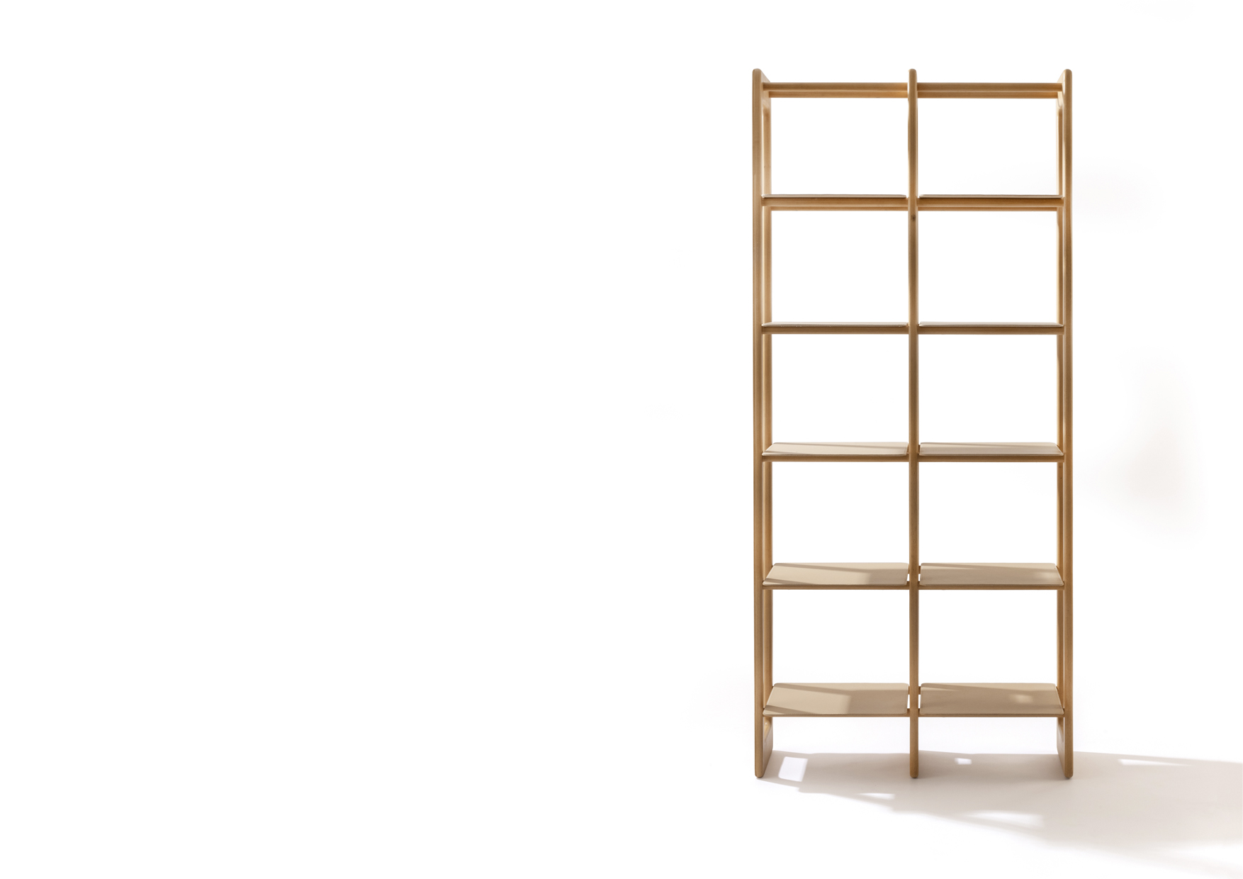 Estante produzida toda em madeira maciça e estruturada por encaixes artesanais de marcenaria, suas prateleiras são produzidas em aço com revestimento em couro natural.