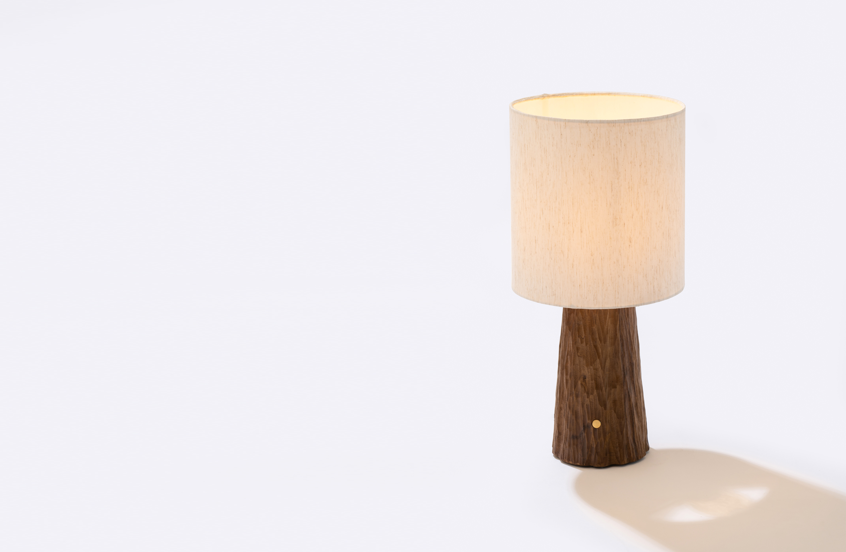 Luminária de mesa dimerizável de madeira maciça, com entalhes manuais.