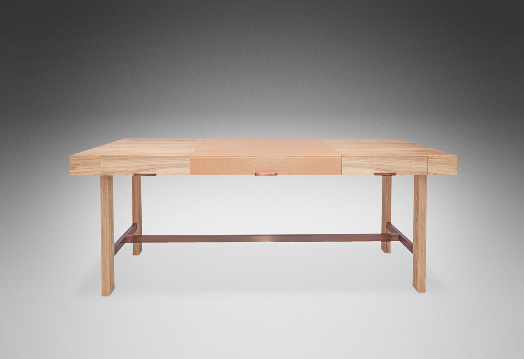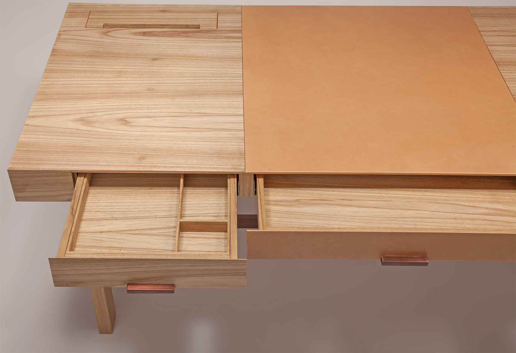 Tampo com revestimento parcial em couro. Trava e puxadores em metal. Acesso à tomadas embutidas. Opção em outras madeiras e metais.