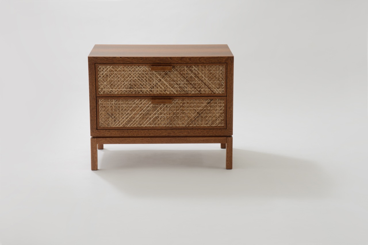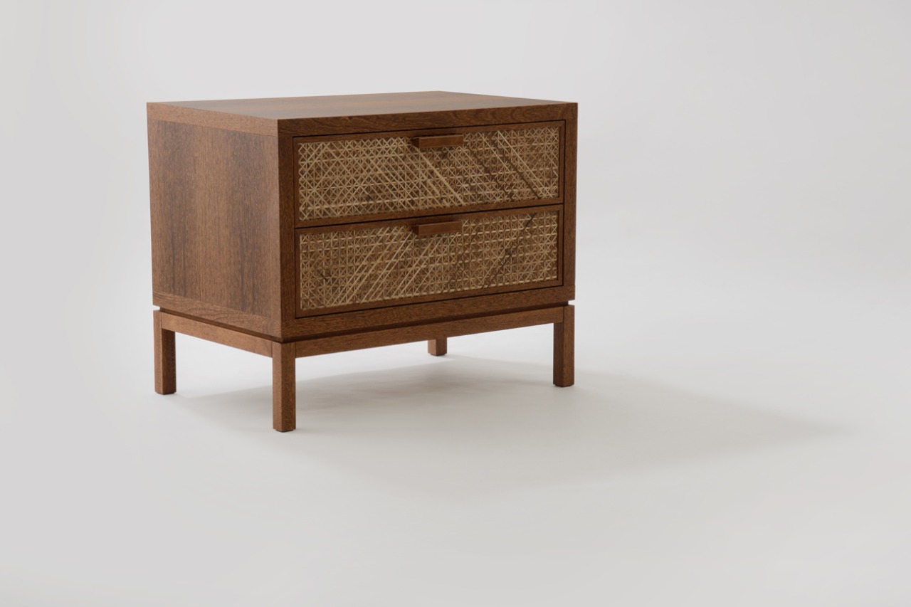 Detalhes da gaveta em palha de bananeira confeccionada de forma artesanal e puxadores especialmente desenhados em couro natural.