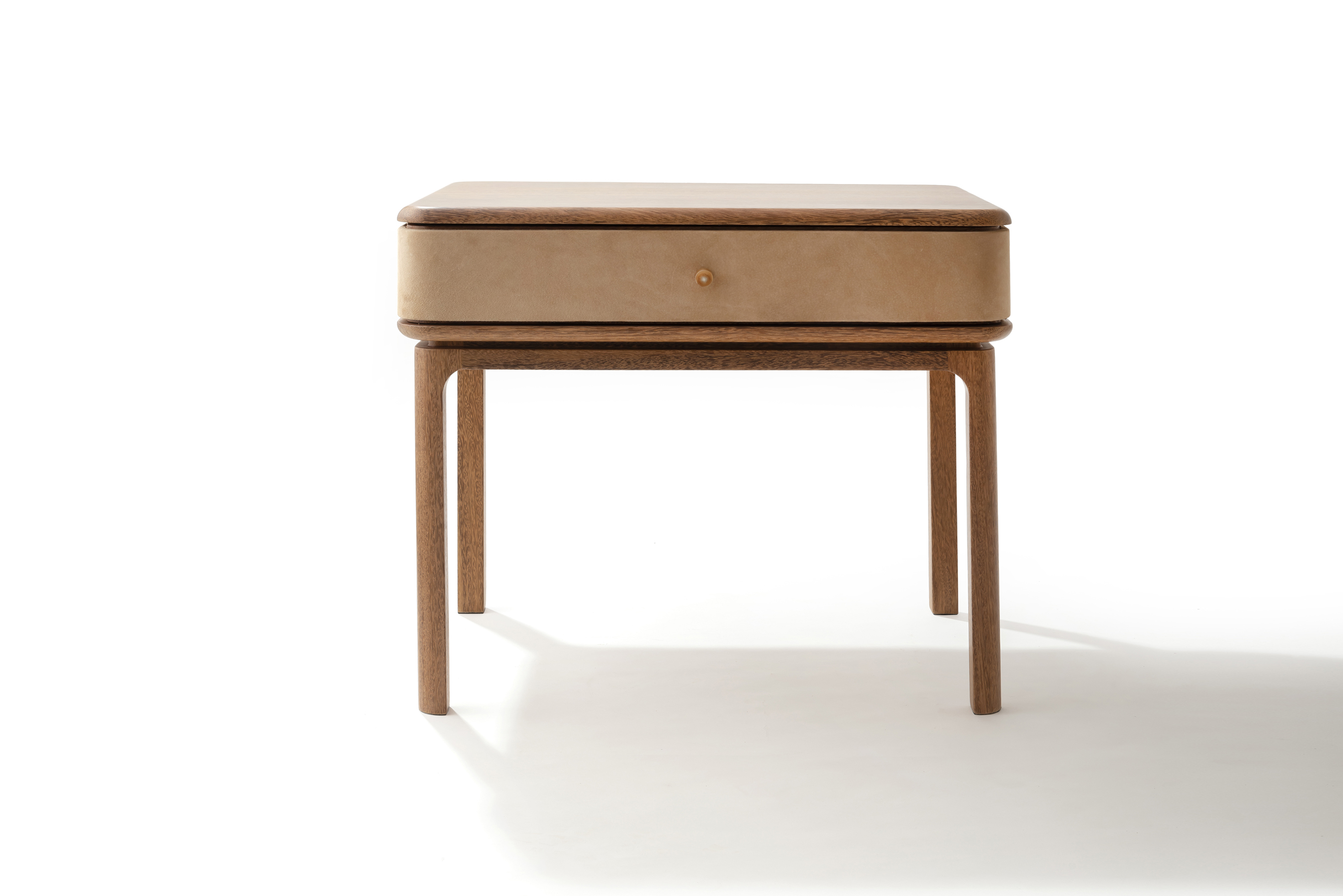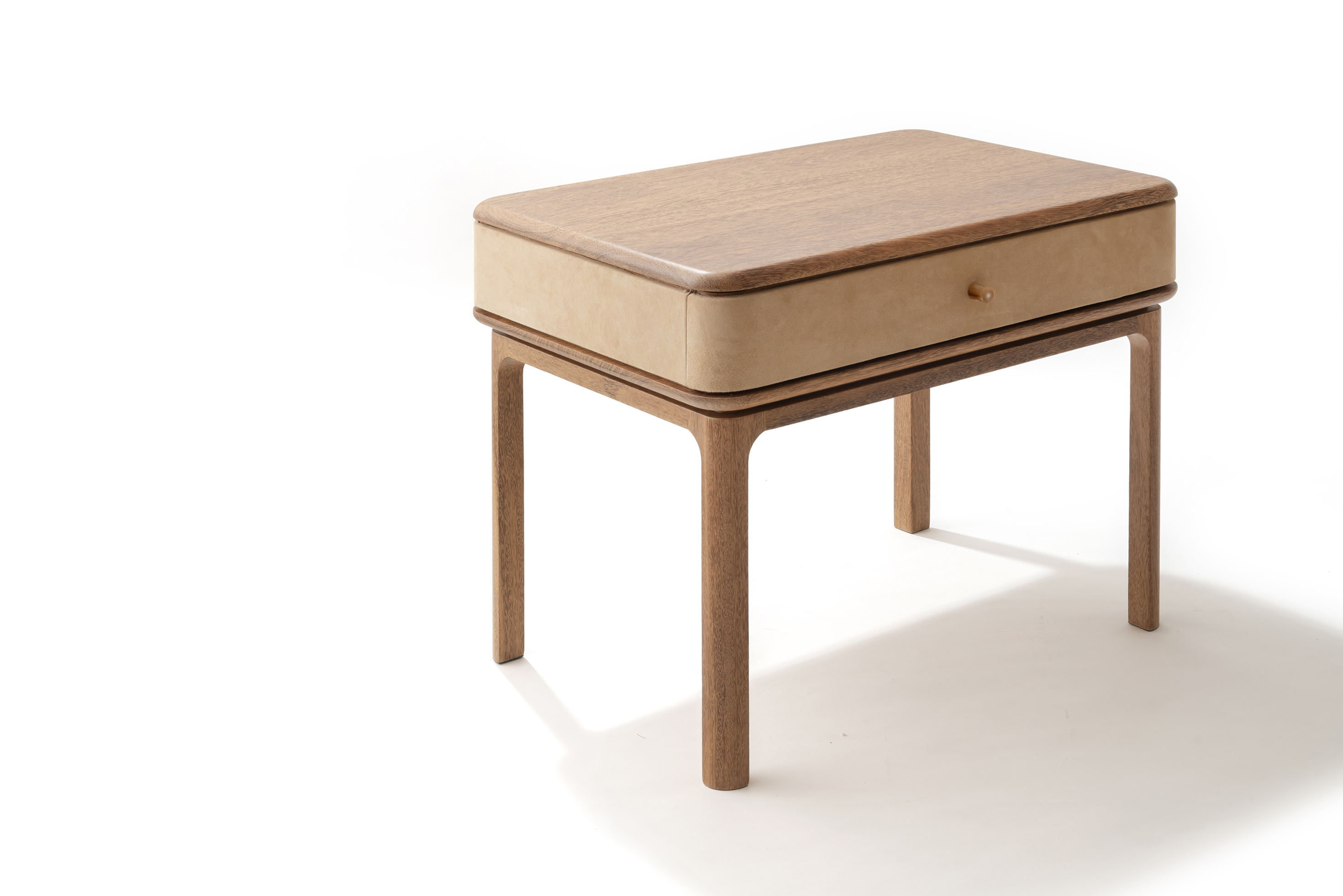 Mesa de cabeceira Donna é produzida toda em madeira maciça sucupira lavada revestida com camurça de porco.