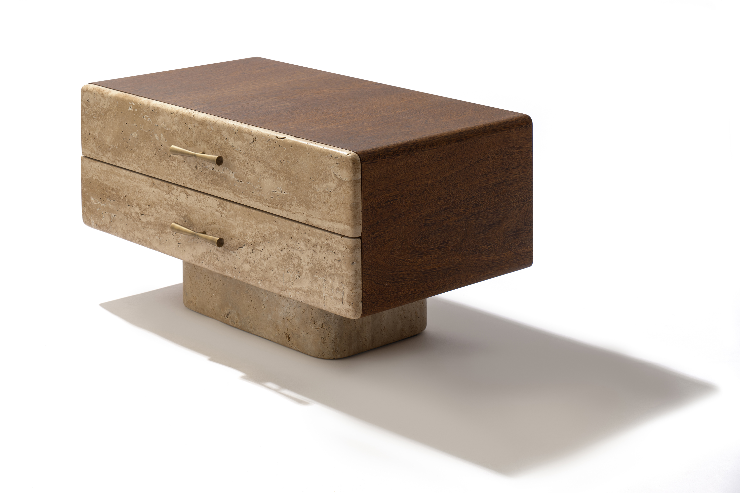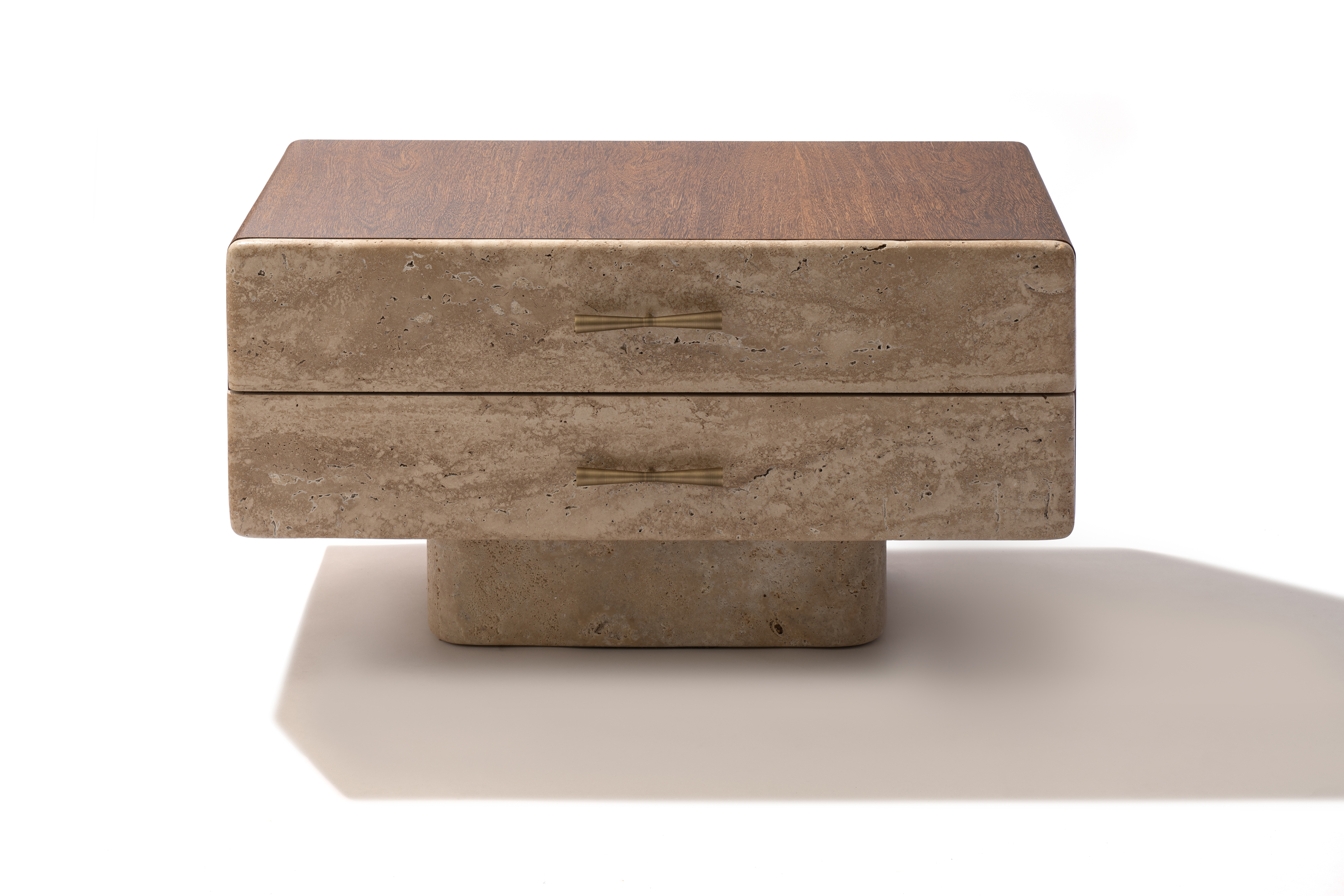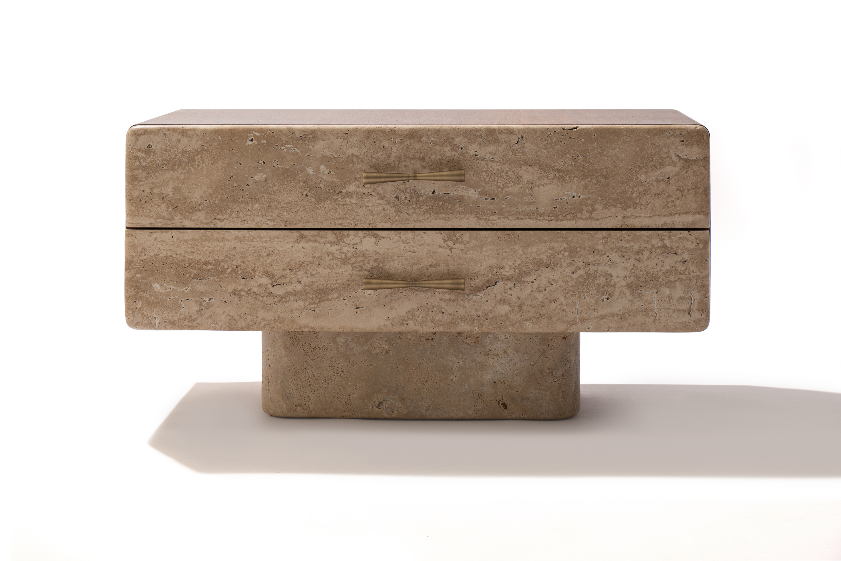 Mesa de cabeceira com gavetas e base em mármore travertino e puxadores em latão envelhecido.