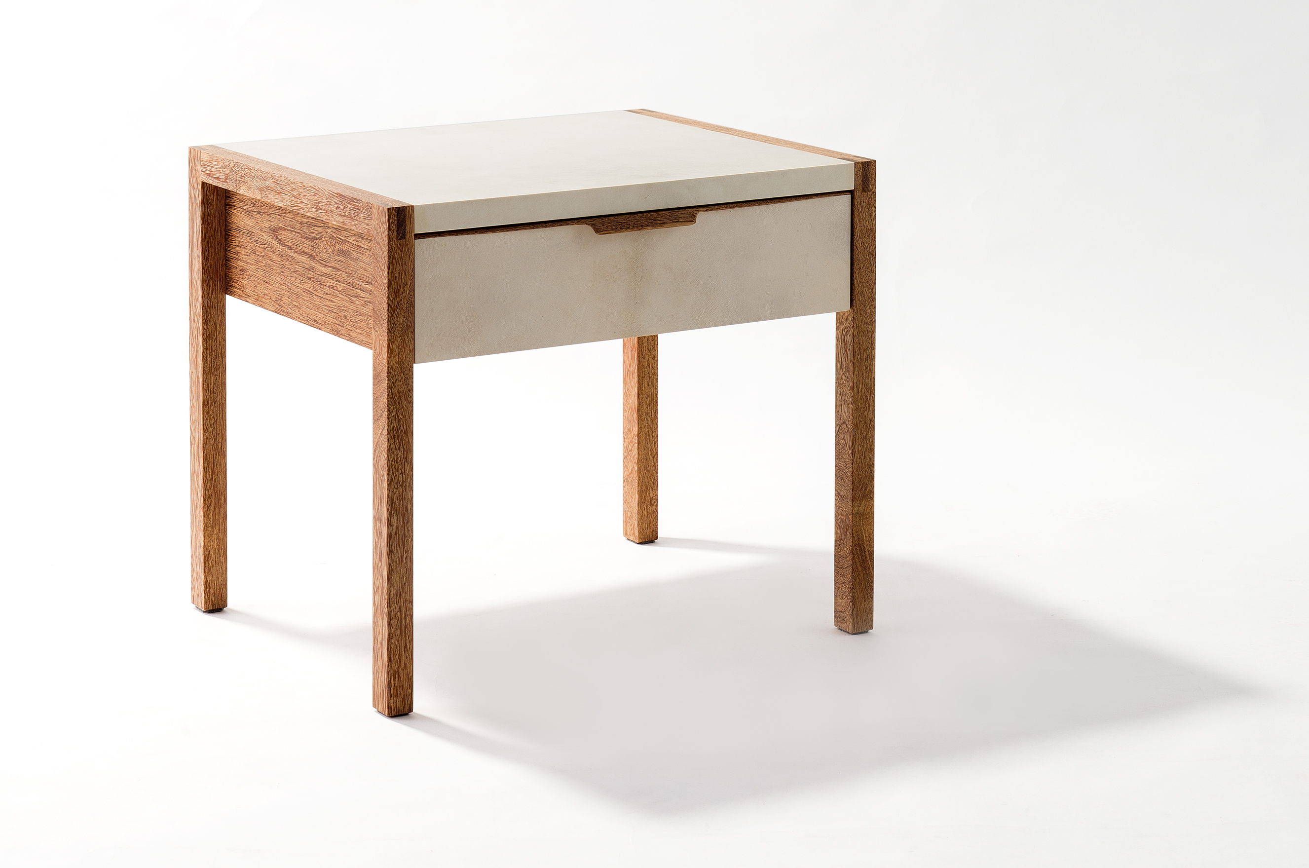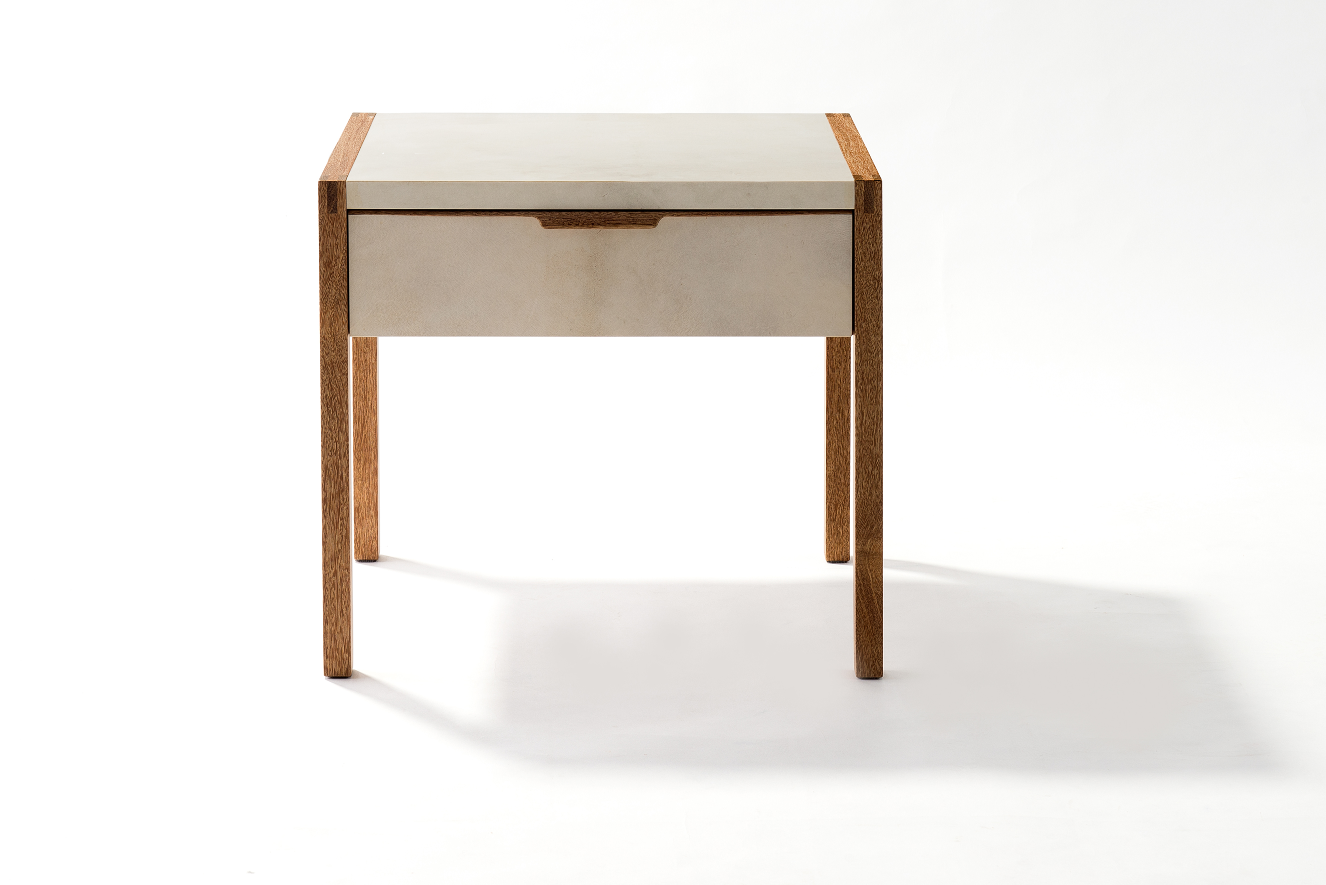 Mesa de cabeceira Trio possui puxador e estrutura em madeira e tampo e gaveta em pergaminho.