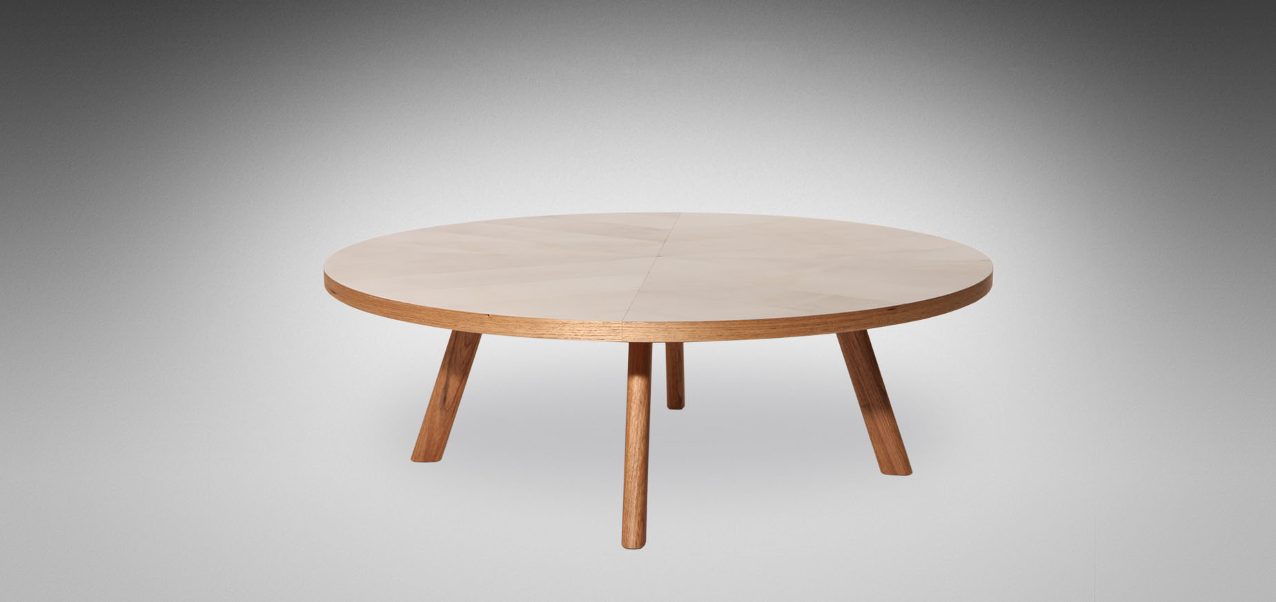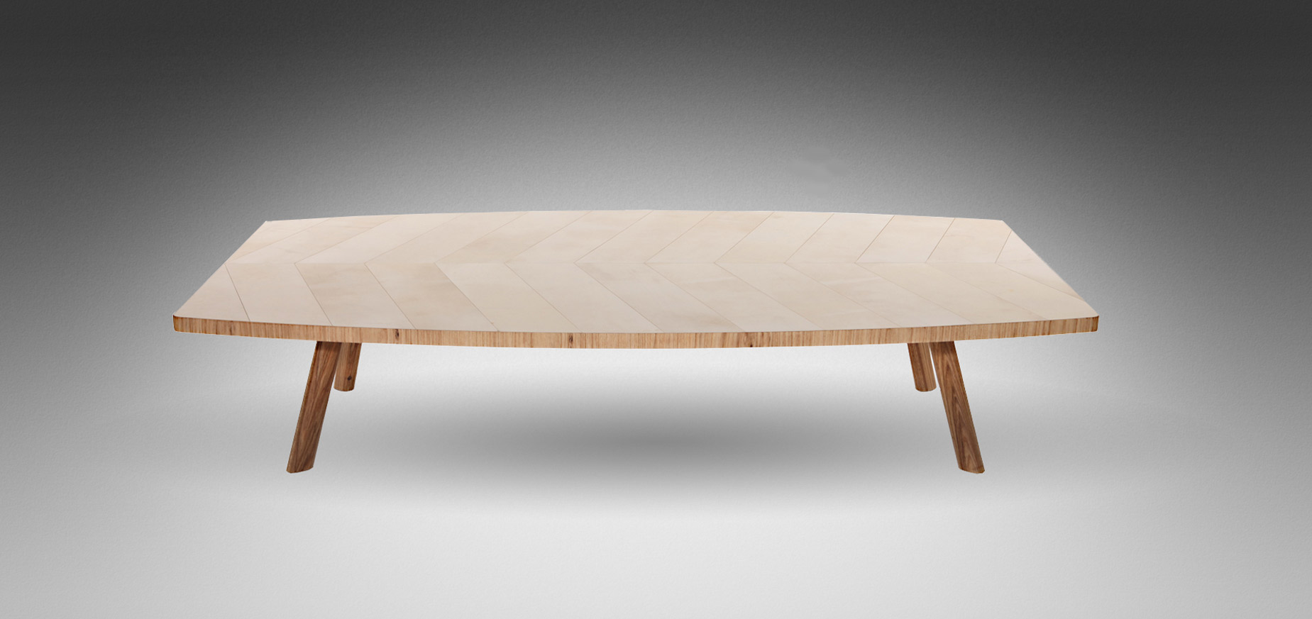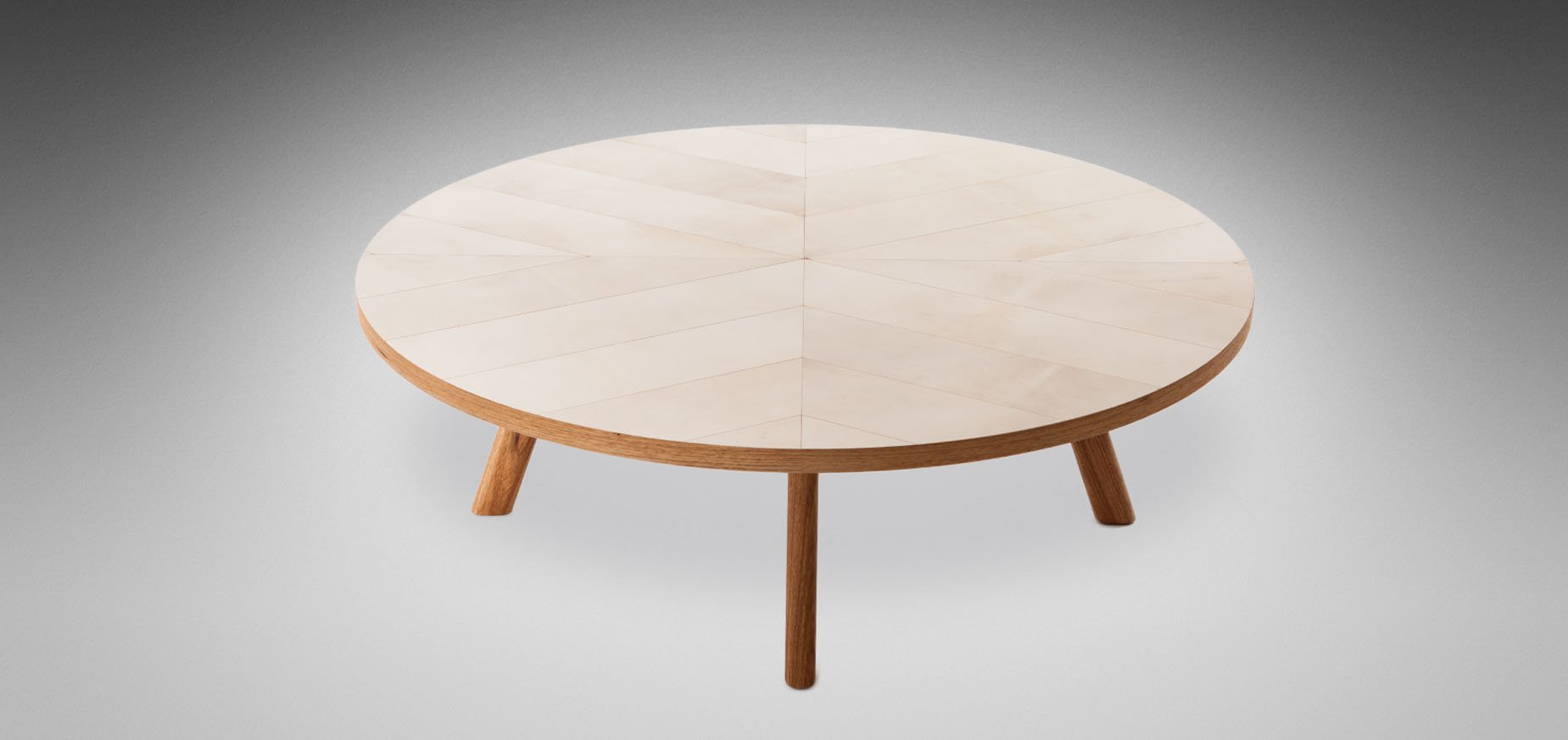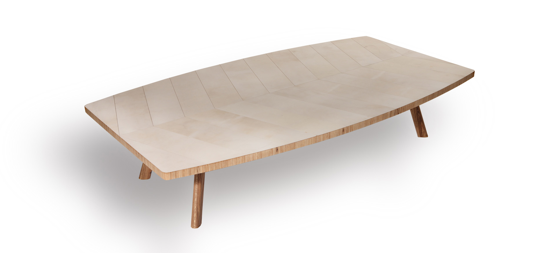 Mesa de centro com tampo revestido em pergaminho claro recortado e estrutura em freijó lavado. Poderá ser feita com pergaminho escuro ou outras madeiras sob consulta.