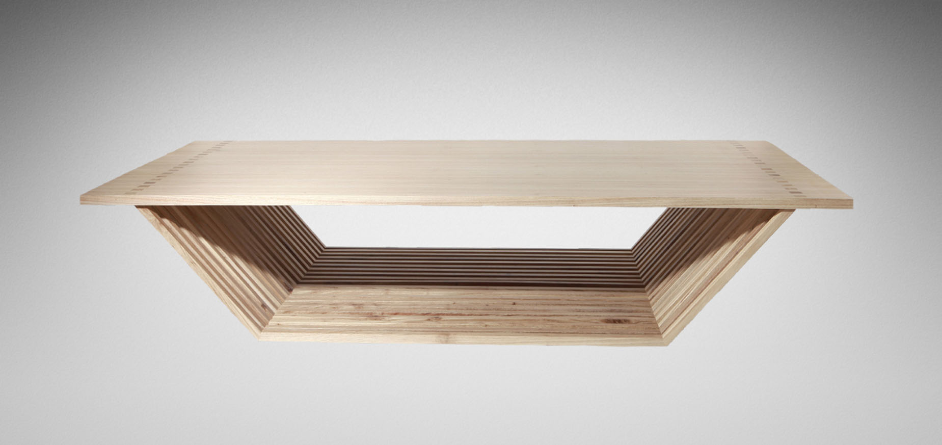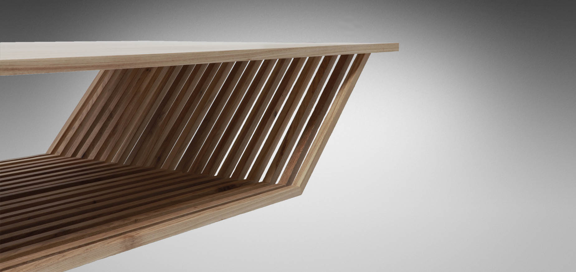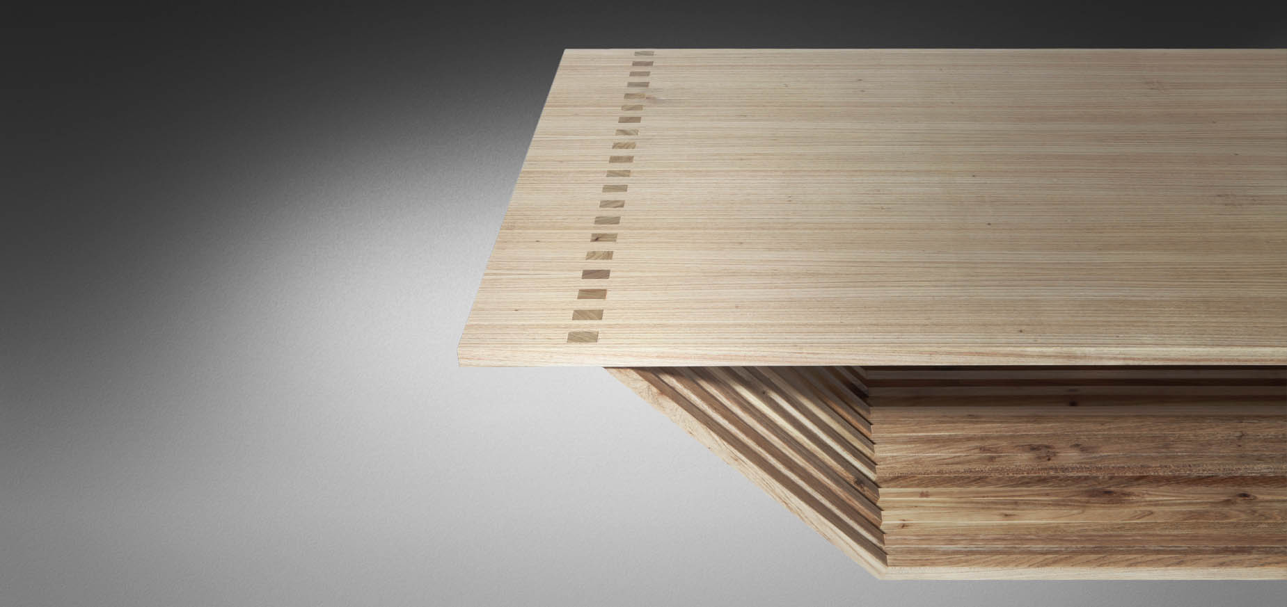 Mesa com pés maciços fazendo um trabalho de luz e sombra no piso. Detalhes marchetados no tampo.