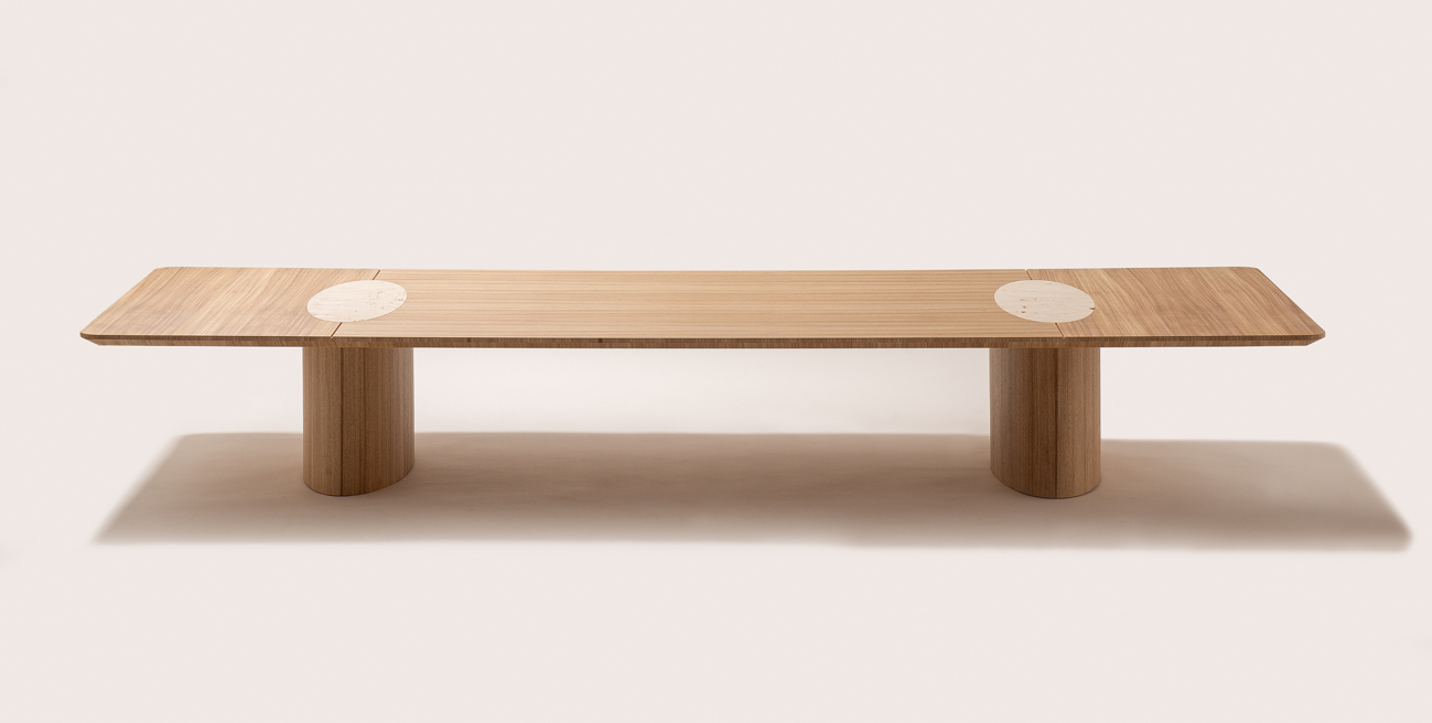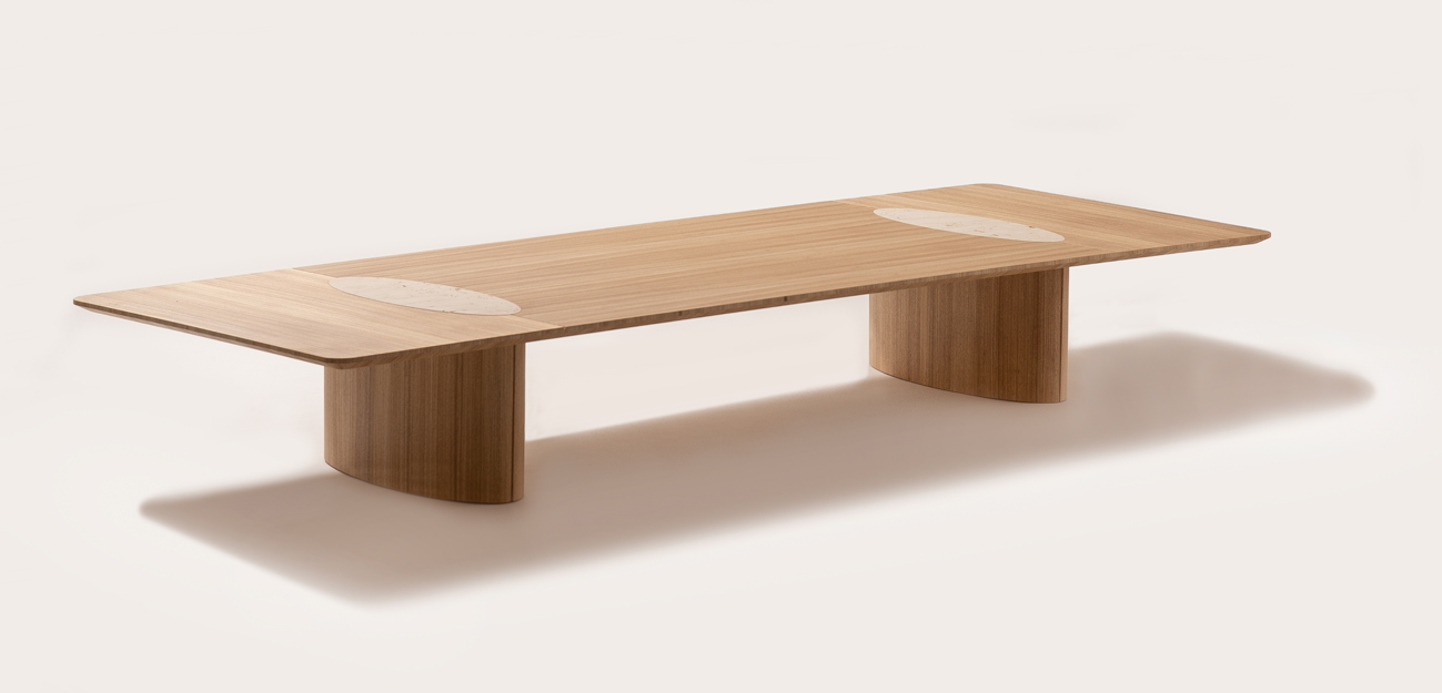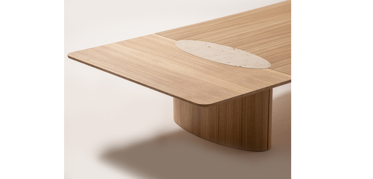 Mesa Tempo é produzida com encontro de folhas em seu tampo com detalhe elíptico em Travertino Navona cravado, a mesa pode ser produzida retangular e quadra.