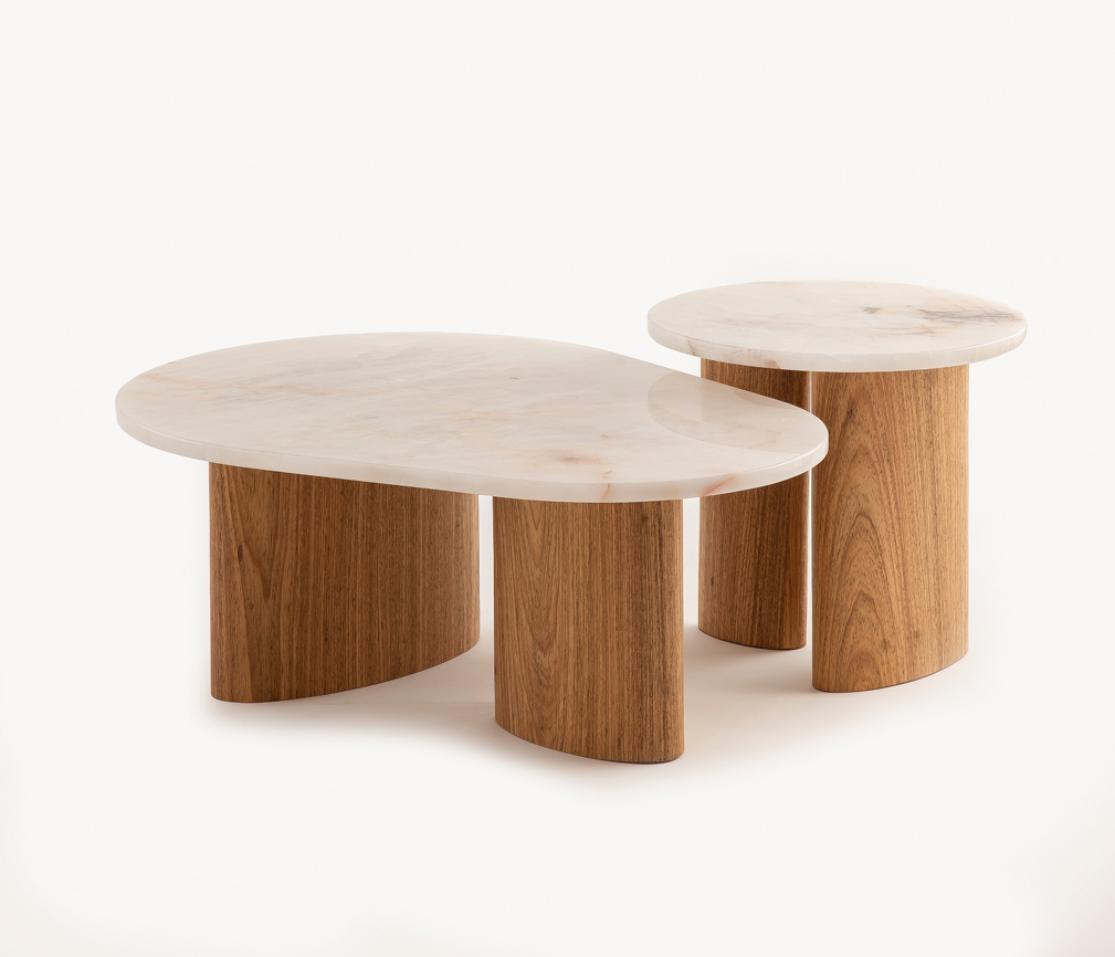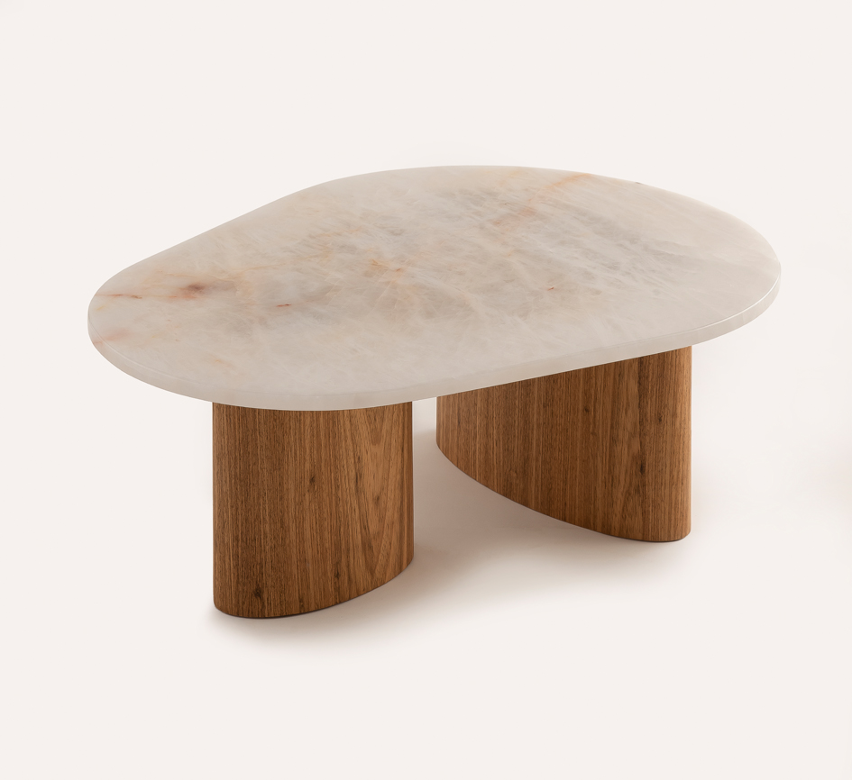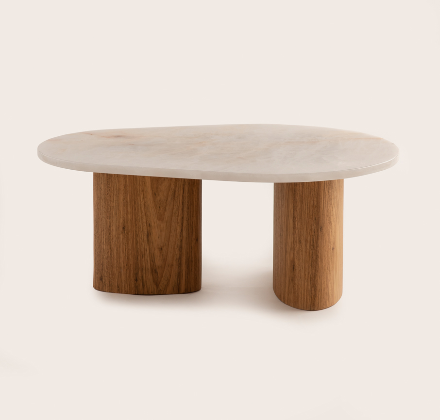 Mesa fabricada no formato orgânico ou redondo tampo em pedra Onix com base em freijó ou sucupira natural.