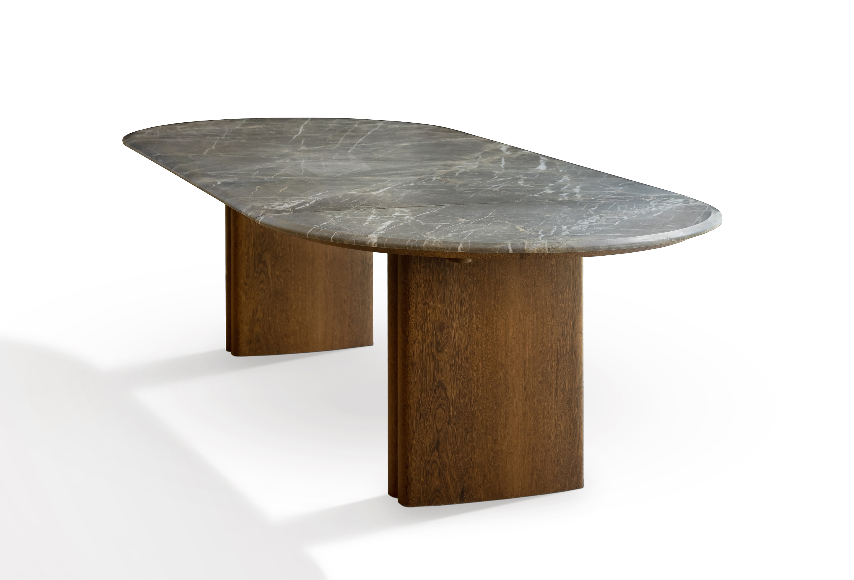 Mesa possui pés produzido em Sucupira lavada com tampo em pedra natural com leve chanfro em sua borda.