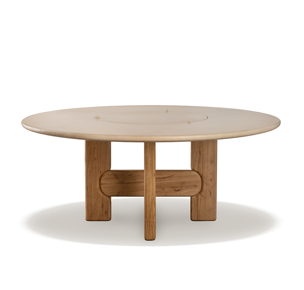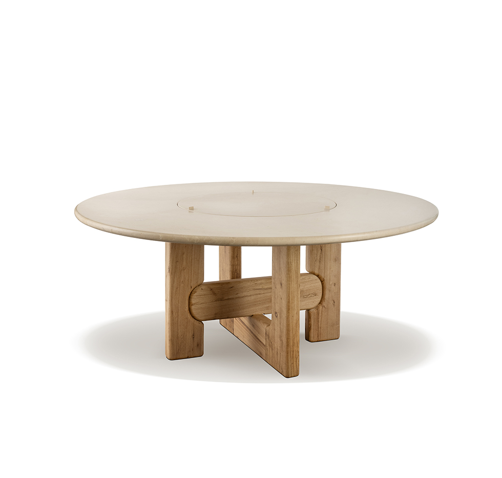 Mesa com pés maciço e tampo em mármore com prato giratório.