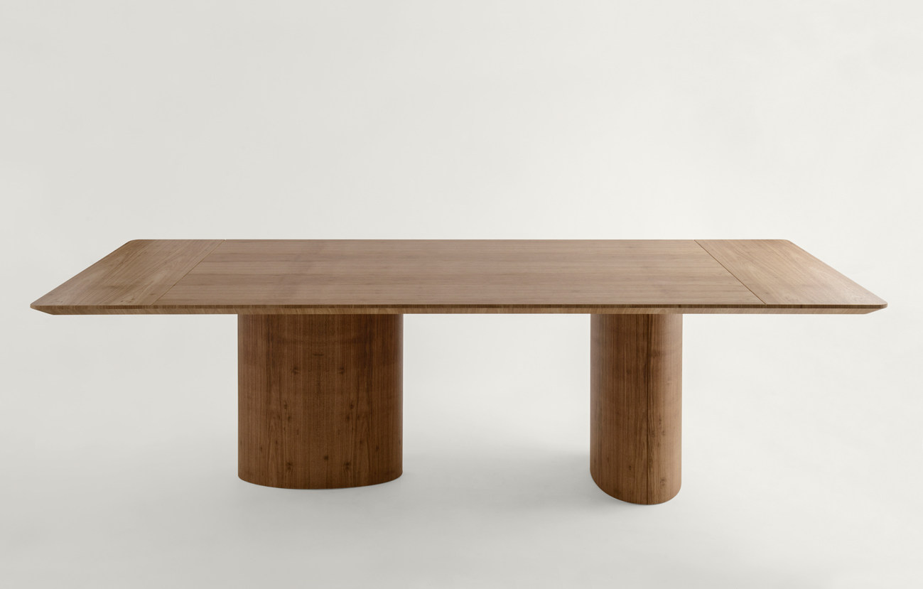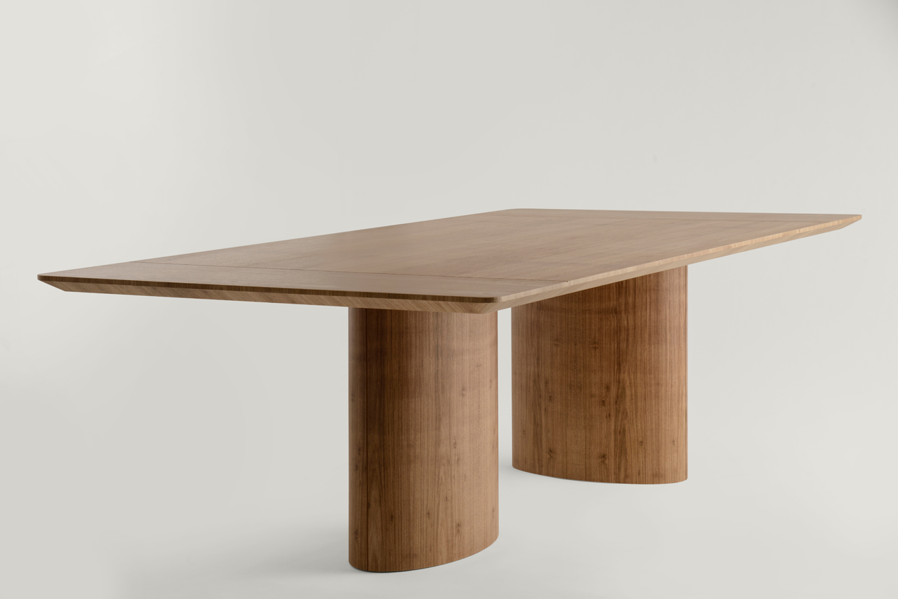 Mesa Tempo é produzida com encontro de folhas em seu tampo, seus pés em forma de elipse podem ser produzidos alinhados.