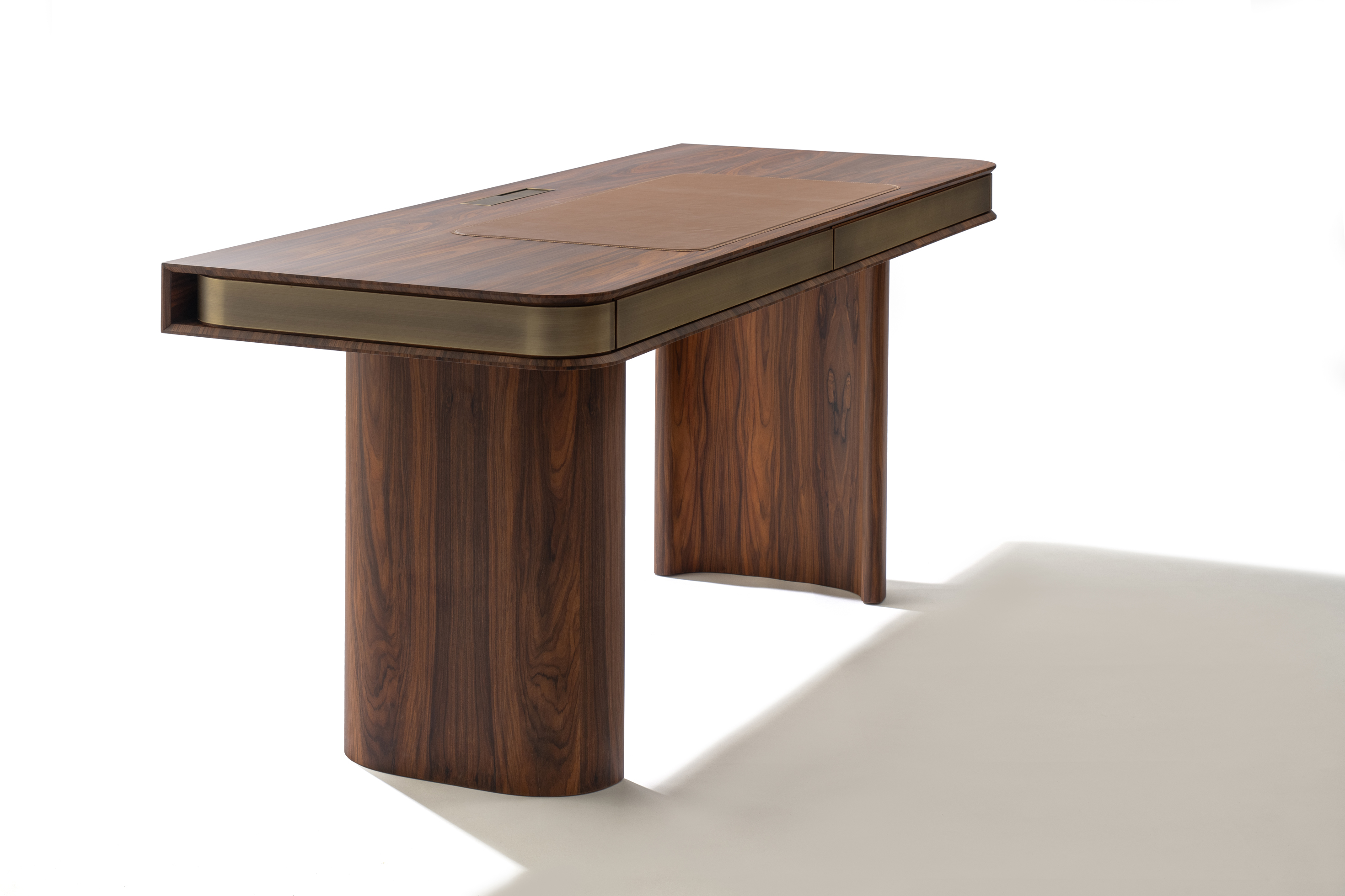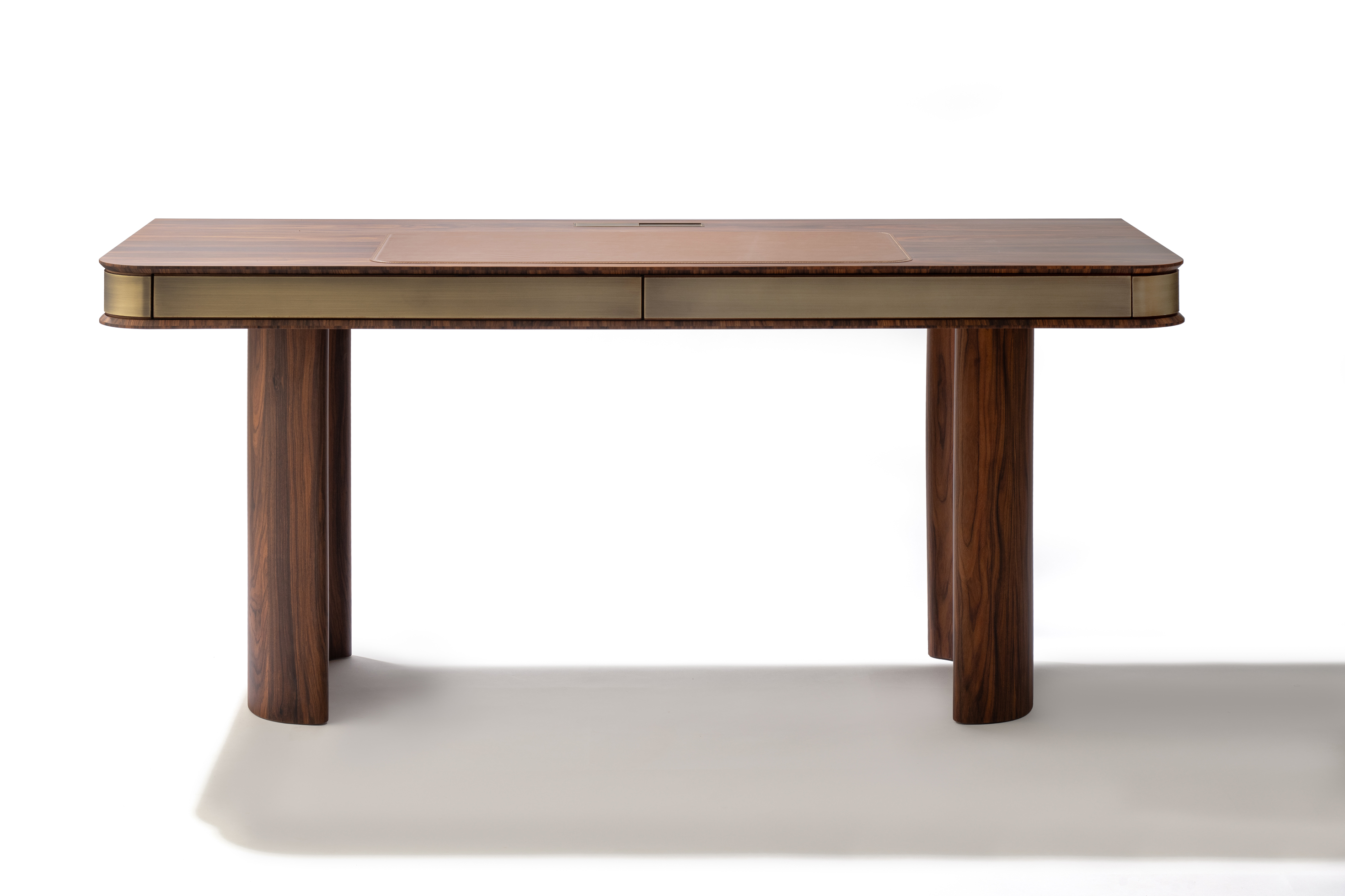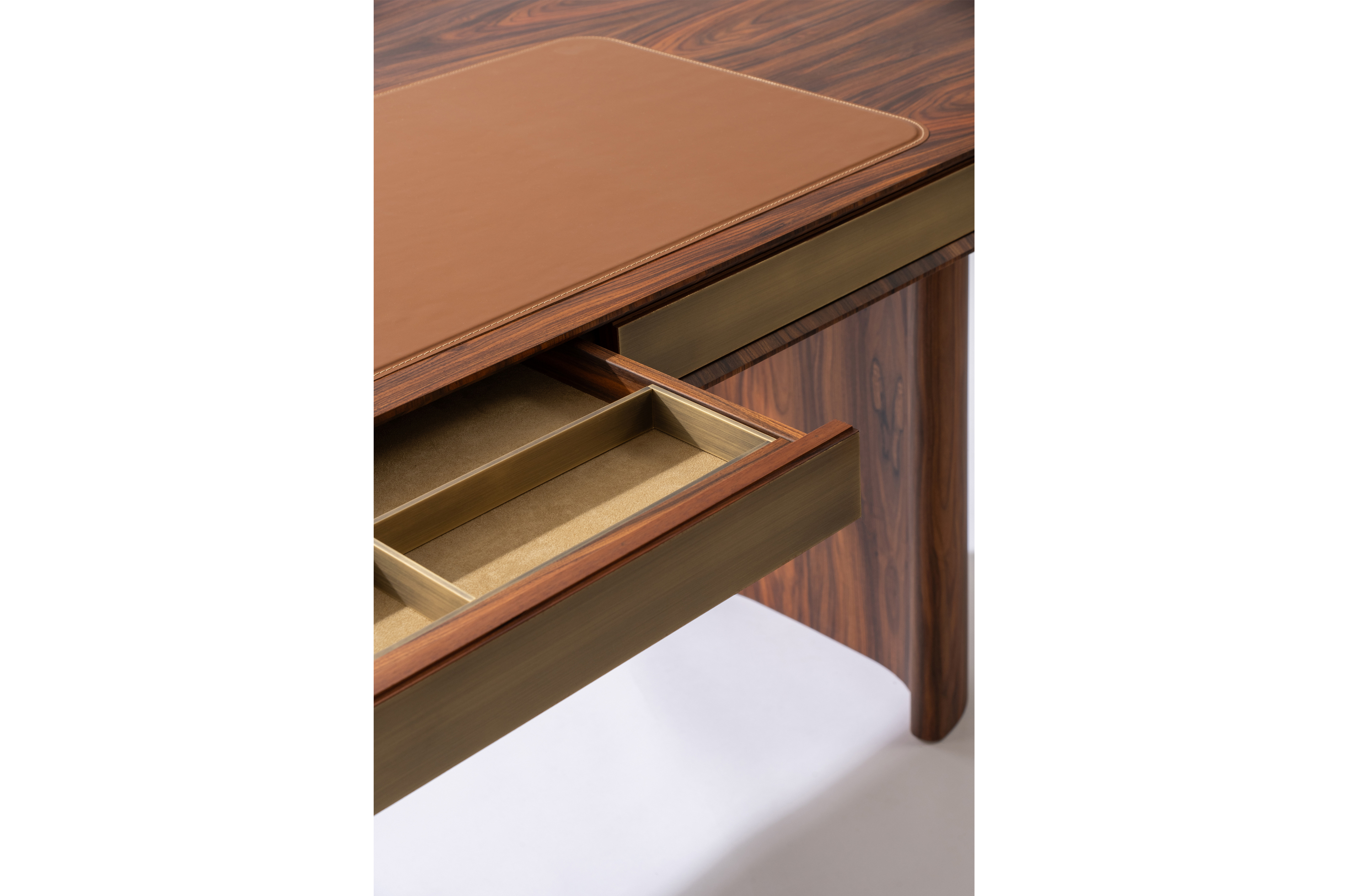 A Mesa Ebisú combina madeira natural, laterais em latão envelhecido e tampo revestido em couro natural. Conta com divisória interna em latão e caixa de tomadas embutida.