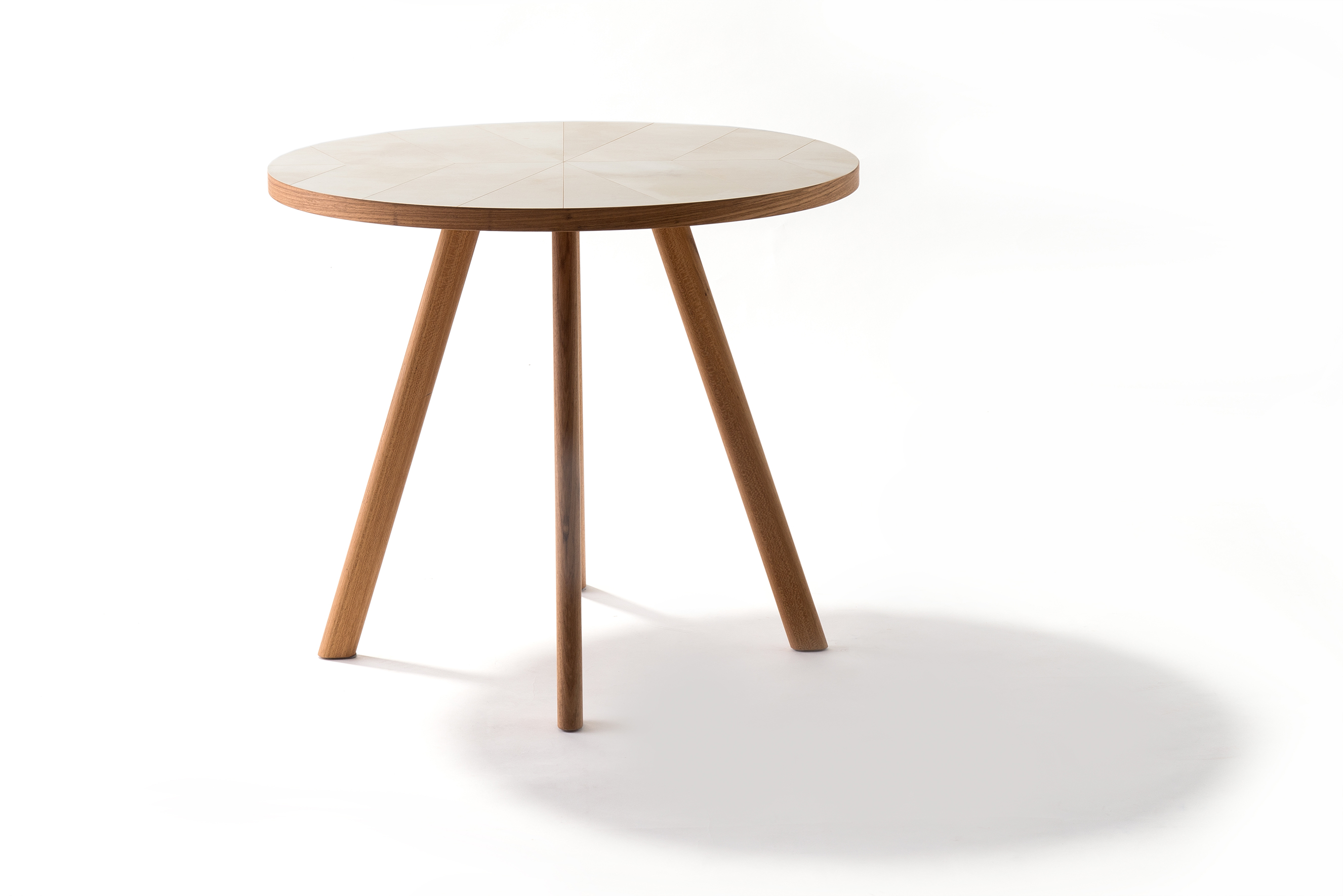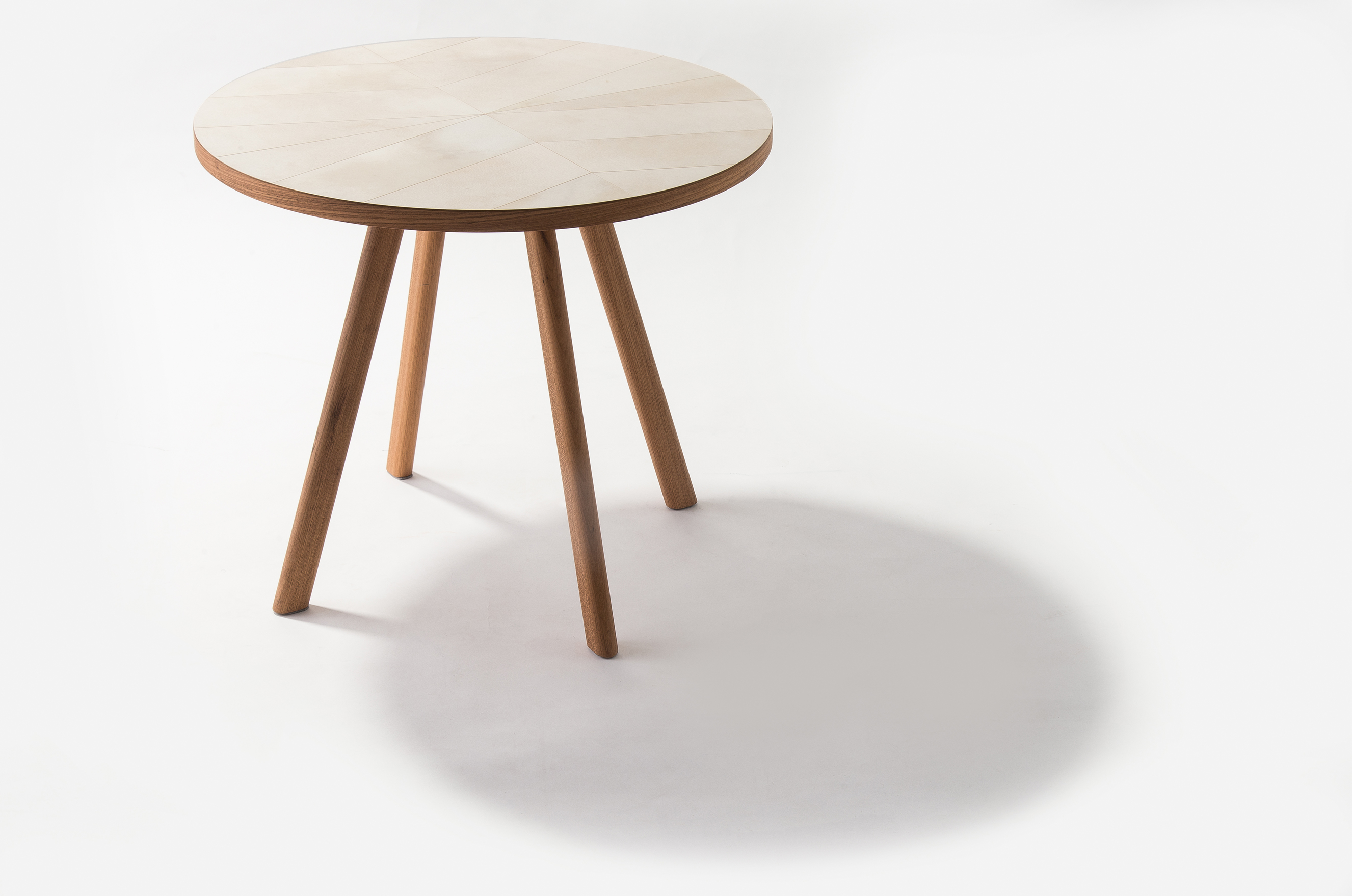 Mesa lateral com tampo revestido em pergaminho claro recortado e estrutura em madeira.