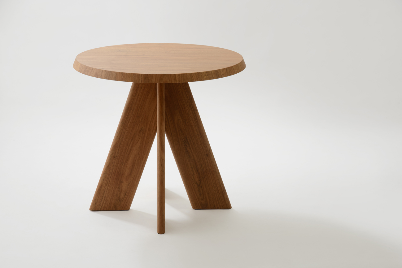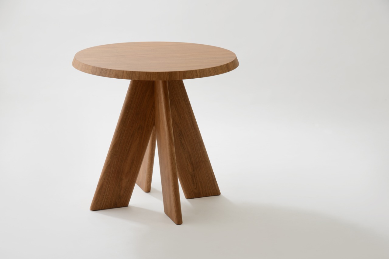 Mesa lateral Geo produzida em freijó natural, podendo ser produzida em outros acabamentos.
