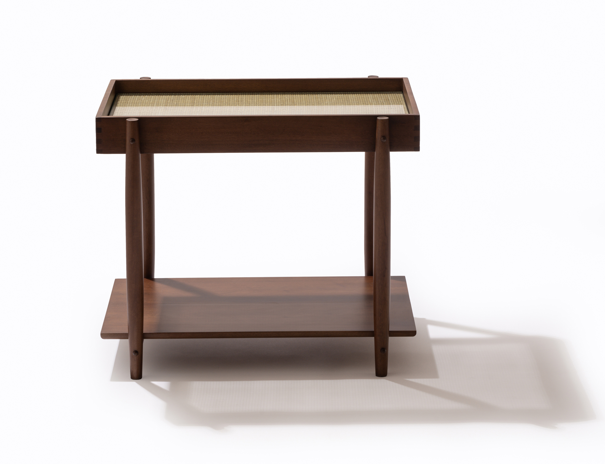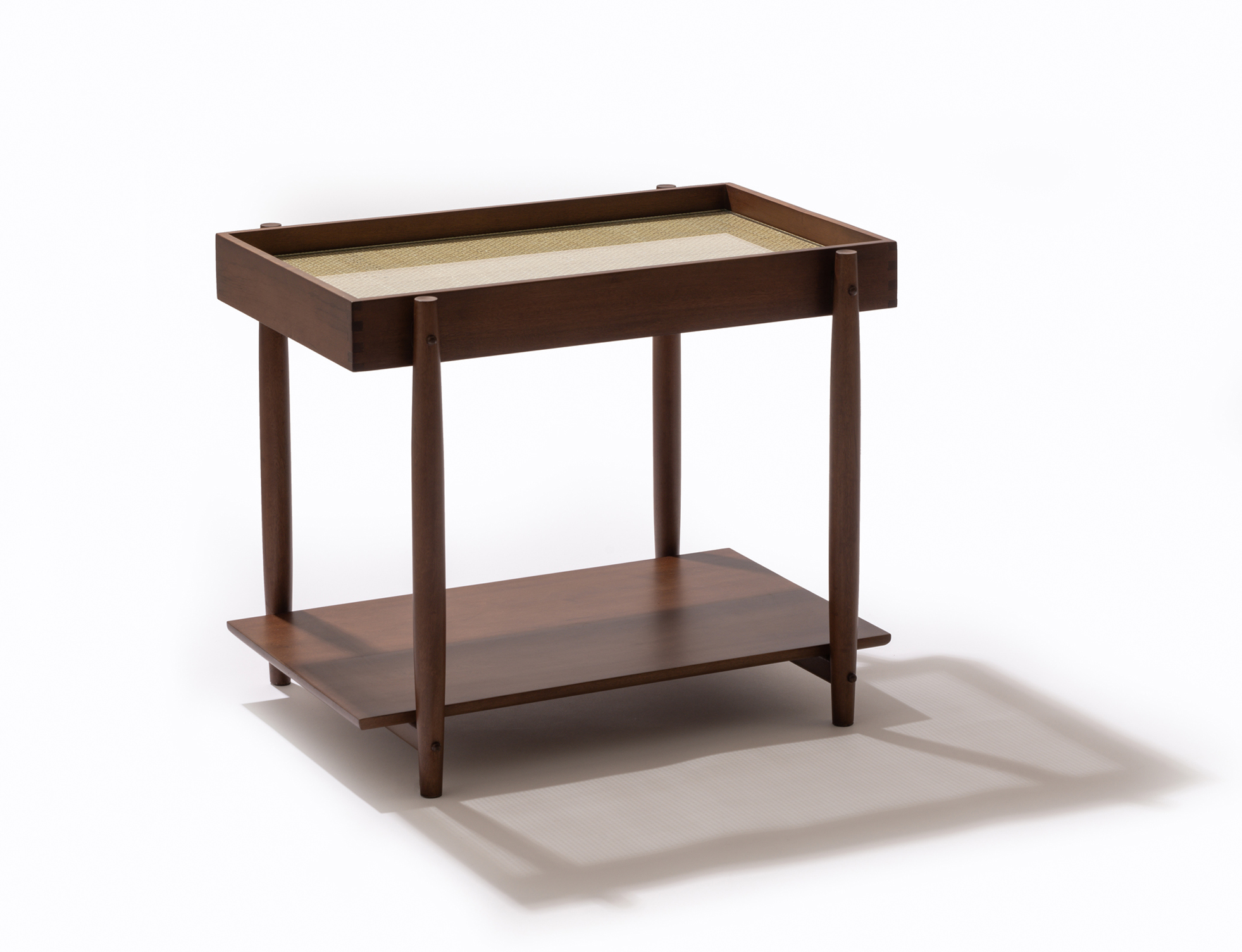 Mesa produzida em madeira maciça com detalhe da bandeja em palha natural e vidro.