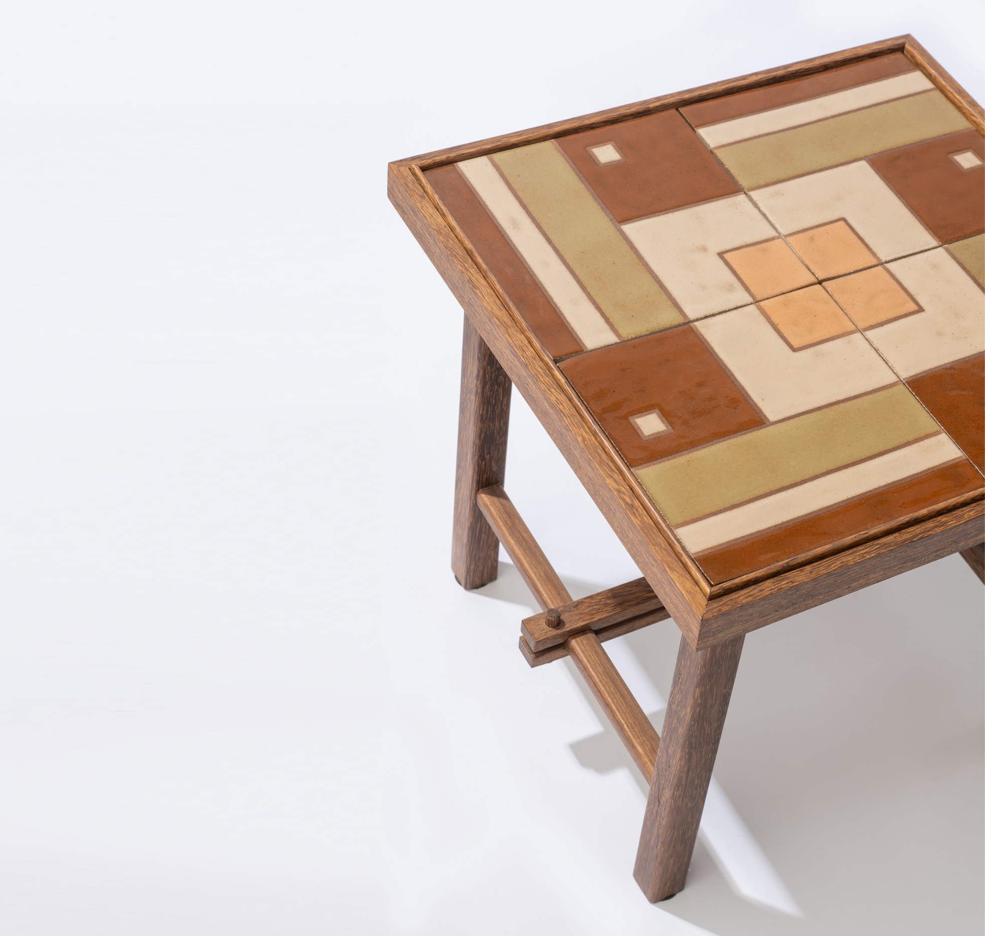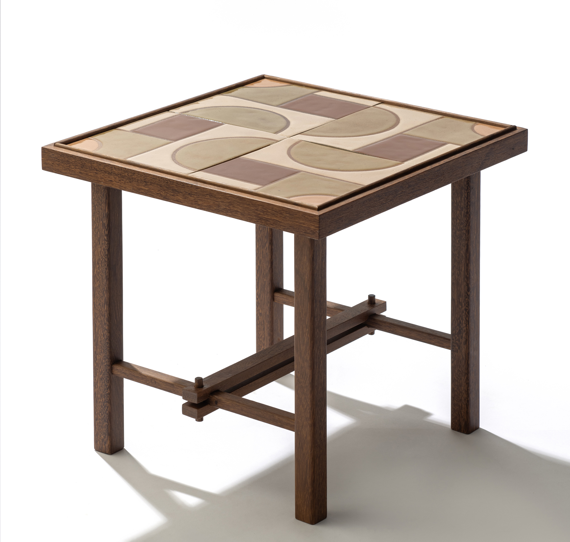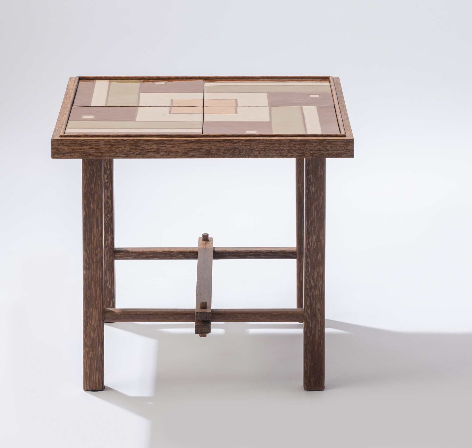 Mesa produzida em madeira maciça Sucupira, seu tampo possui uma composição de quatro cerâmicas feitas artesanalmente.