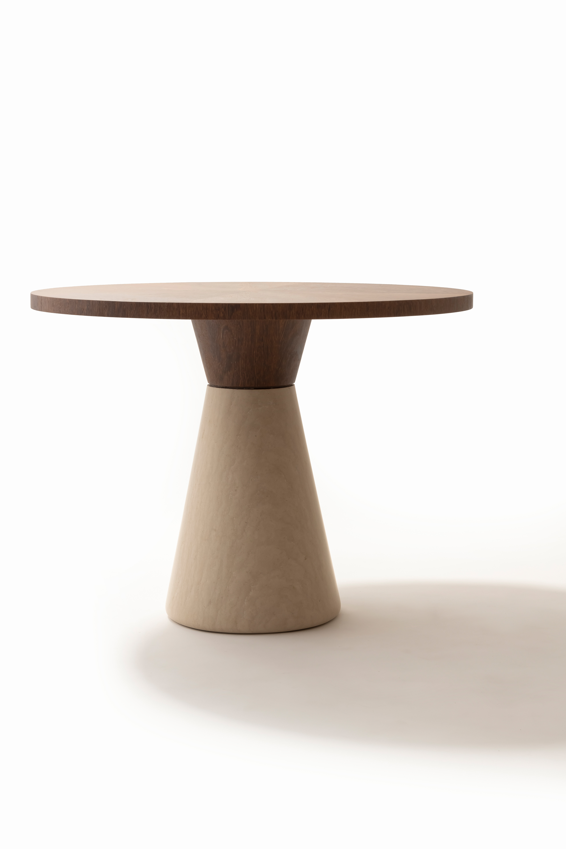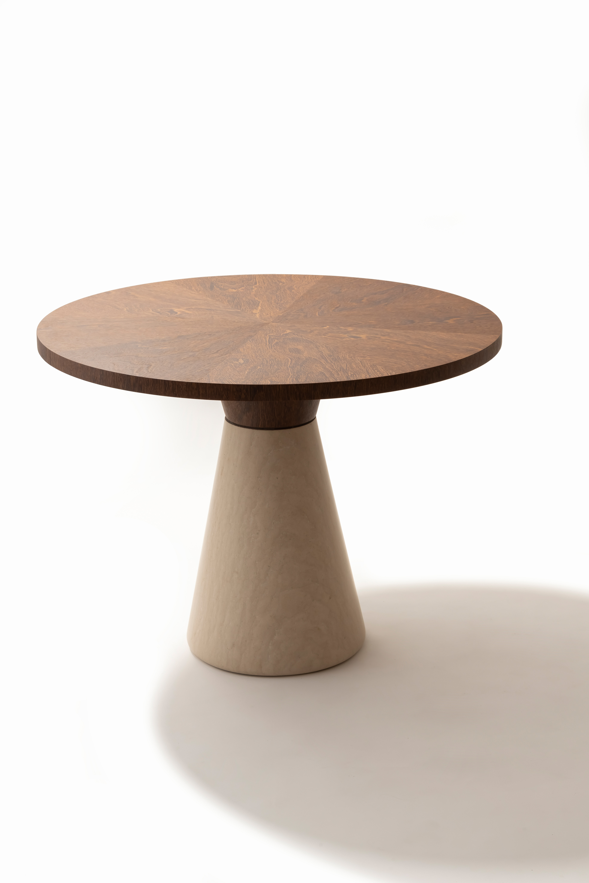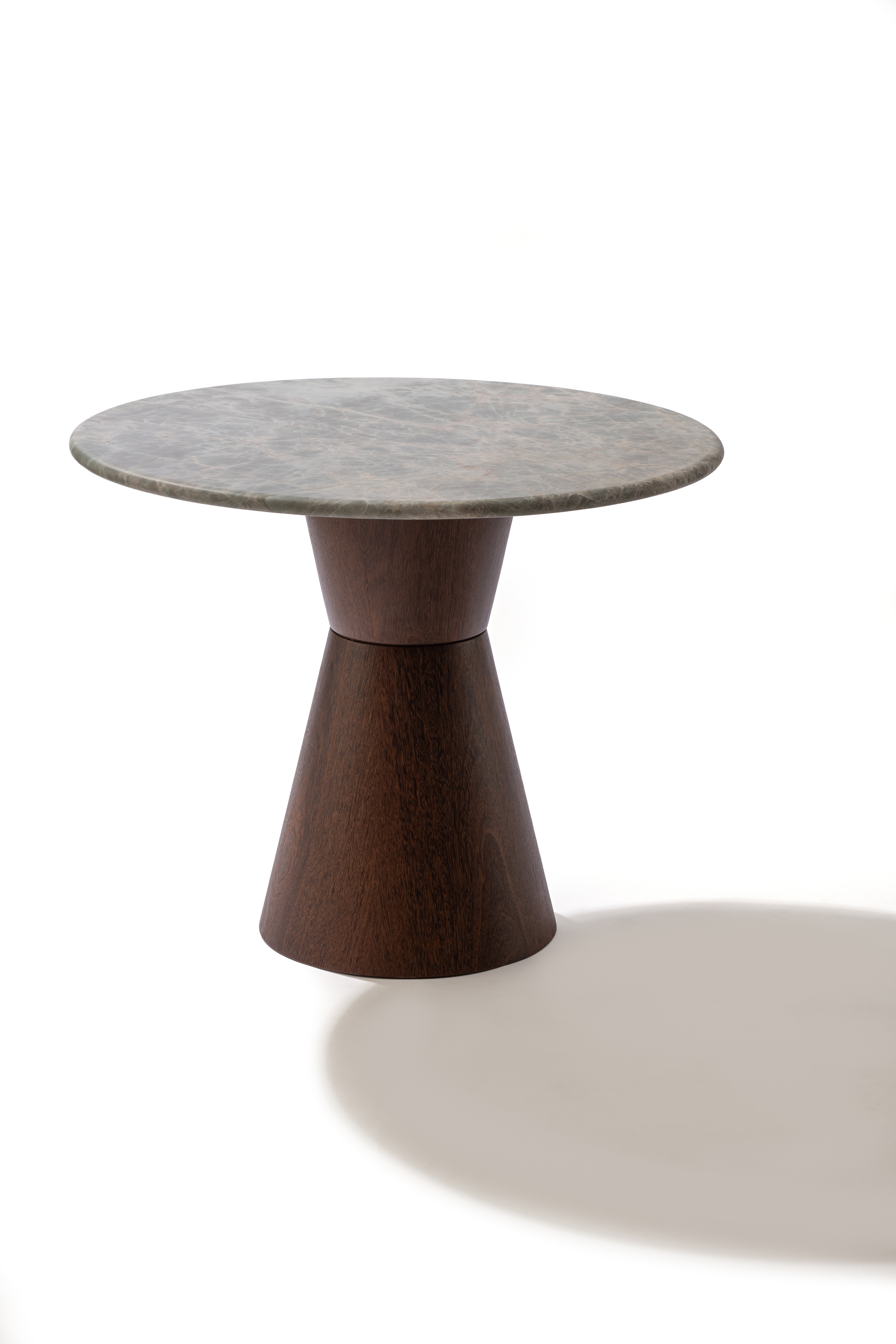 Base torneada em bloco maciço de mármore Crema Paraná levigado e tampo com encontro de folhas de Sucupira natural.