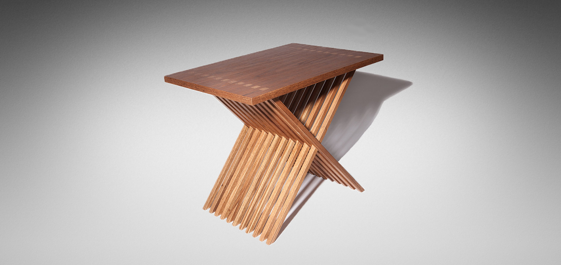 Pés em madeira maciça ,trabalho de luz e sombra na composição dos pés. tampo com o encaixe dos pés aparente.