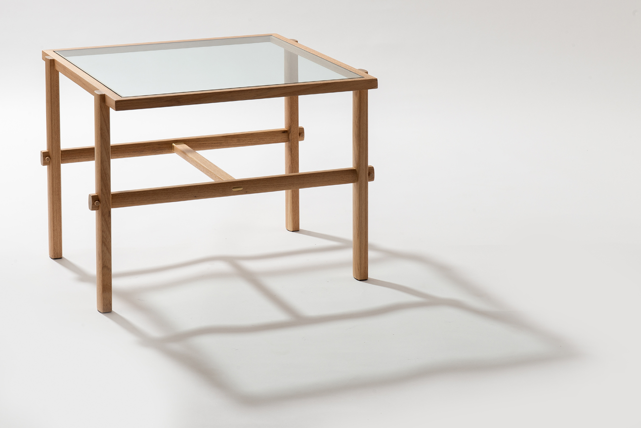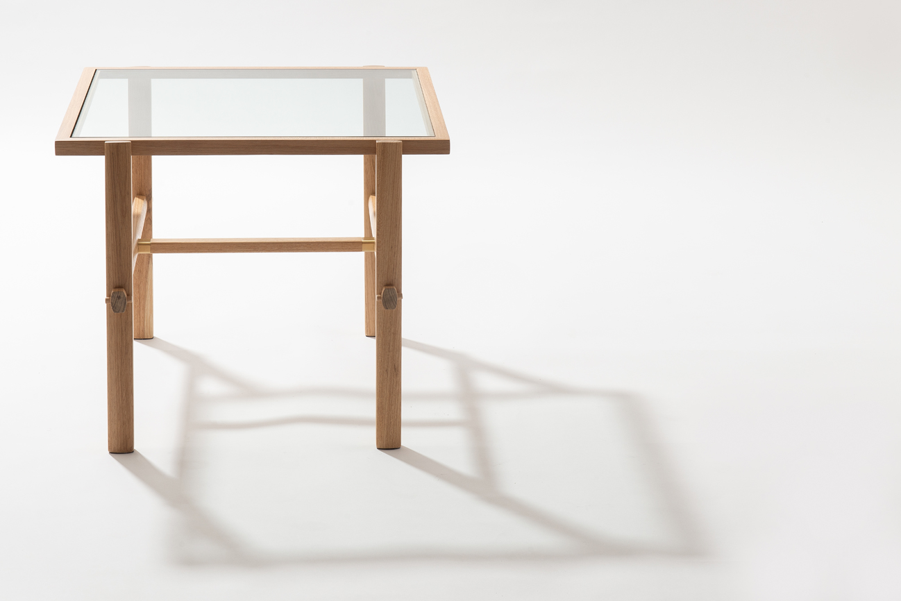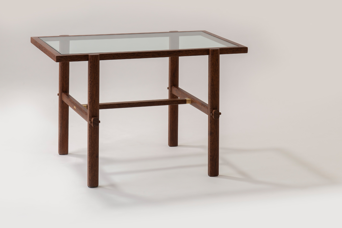 Mesa lateral Rita é produzida toda em madeira maciça, com tampo de vidro e detalhe do travamento em latão escovado.