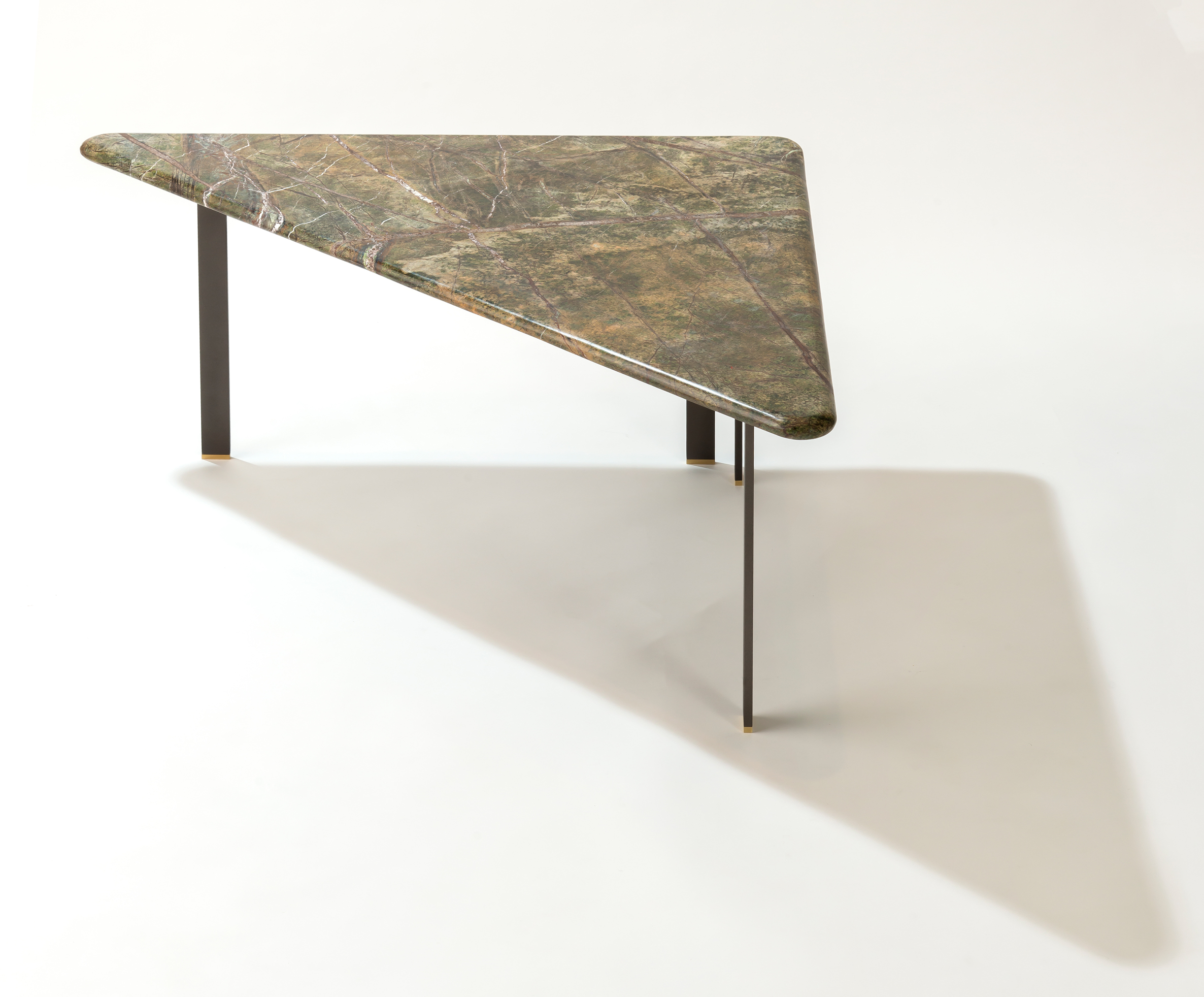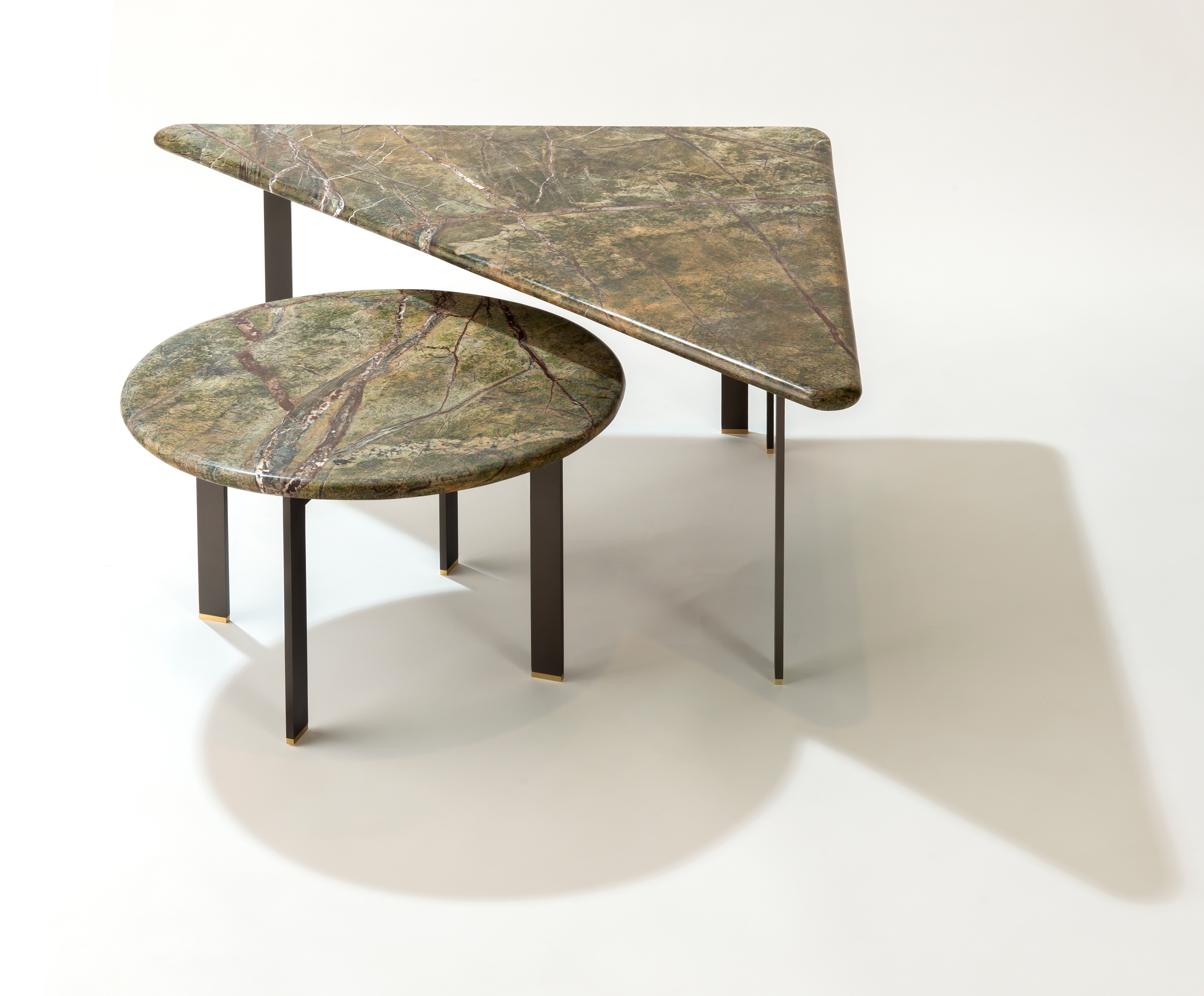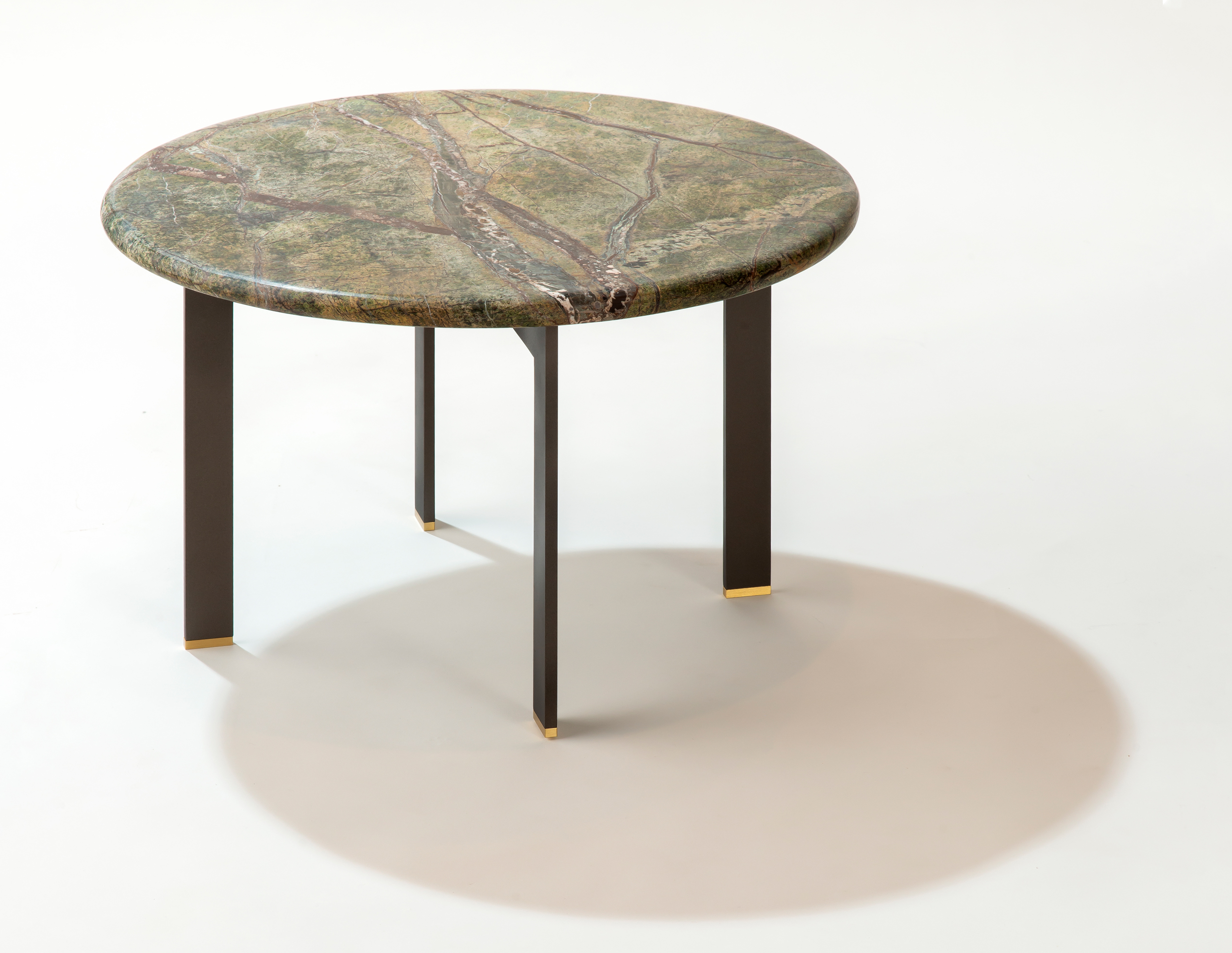 Mesas produzidas com pedras naturais verdes ou brancas, sua estrutura é feita em aço com sapatas em latão maciço.