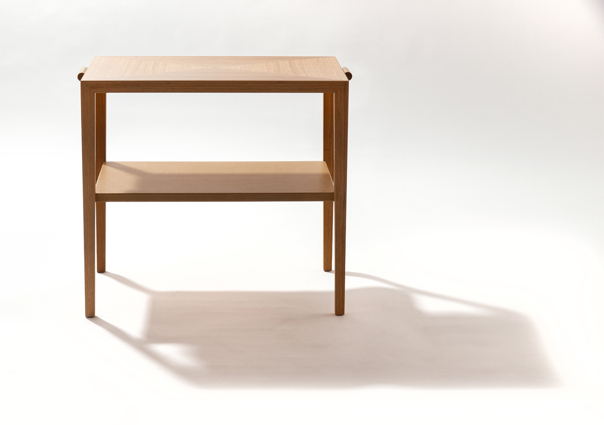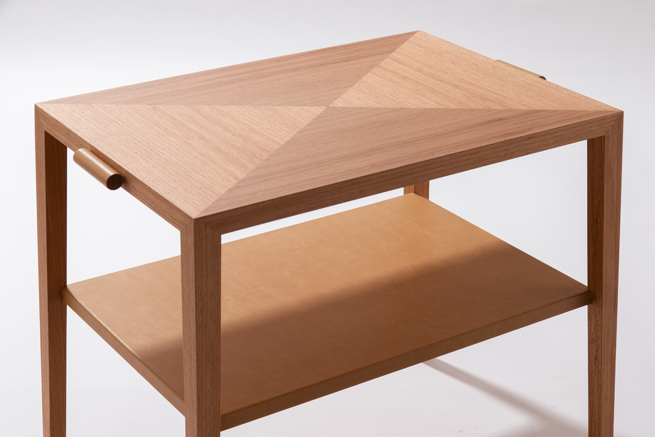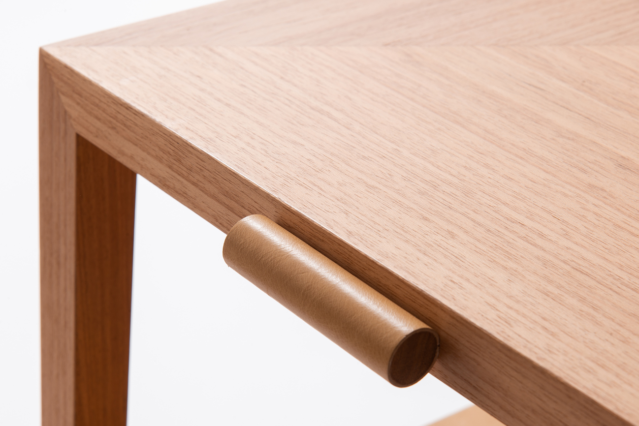 Mesa lateral com desenho delicado. Há possibilidade de revestir o tampo inferior e os detalhes laterais em couro, tampo com delicado casamento de folhas. Opção de formatos retangular e quadrado.
