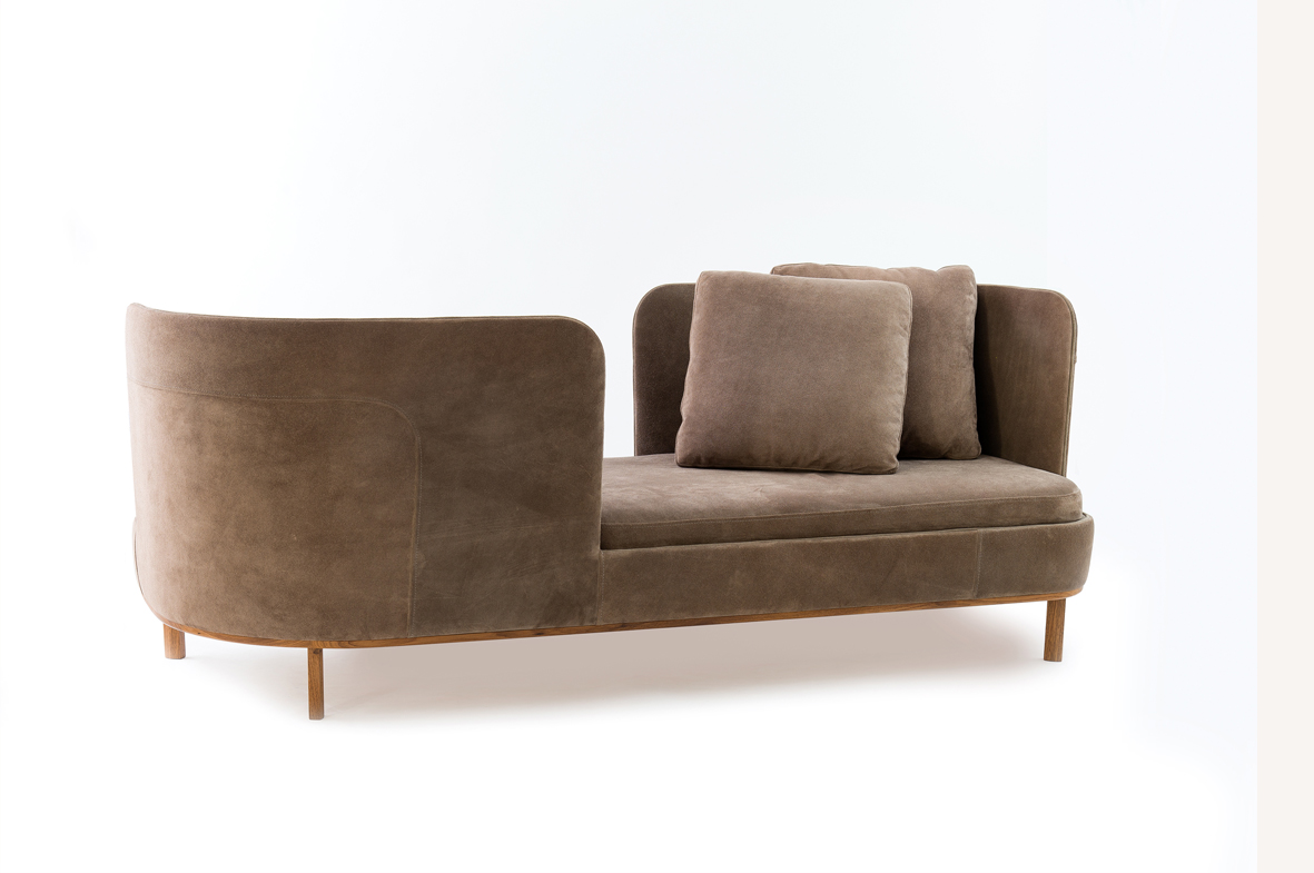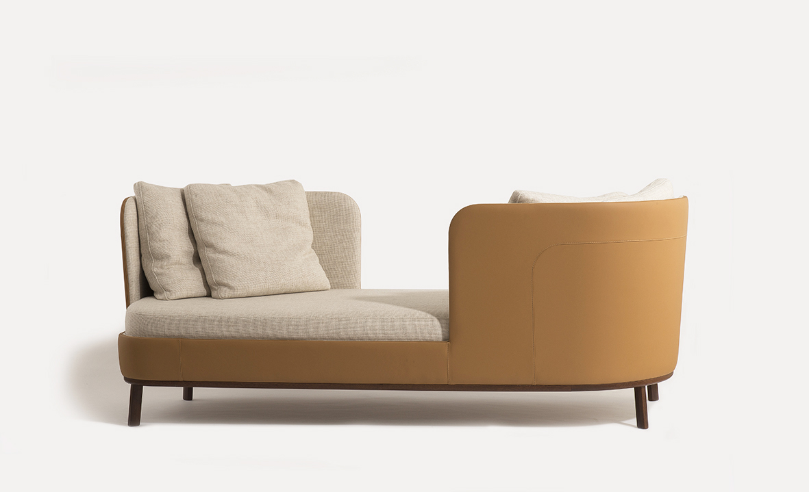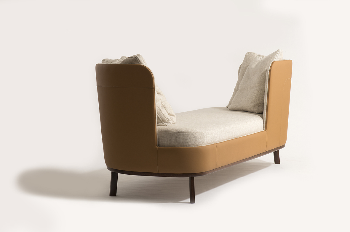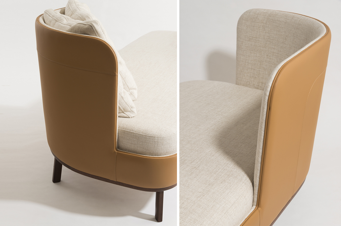 Namoradeira Rimini resgata referencias clássicas e traz para contemporaneidade, levando em destaque sua fina estrutura de encosto relacionando o couro com linho. Possui assento com molas ensacadas e seus pés podem ser em madeira Sucupira ou Freijó.