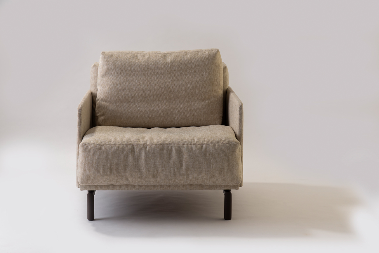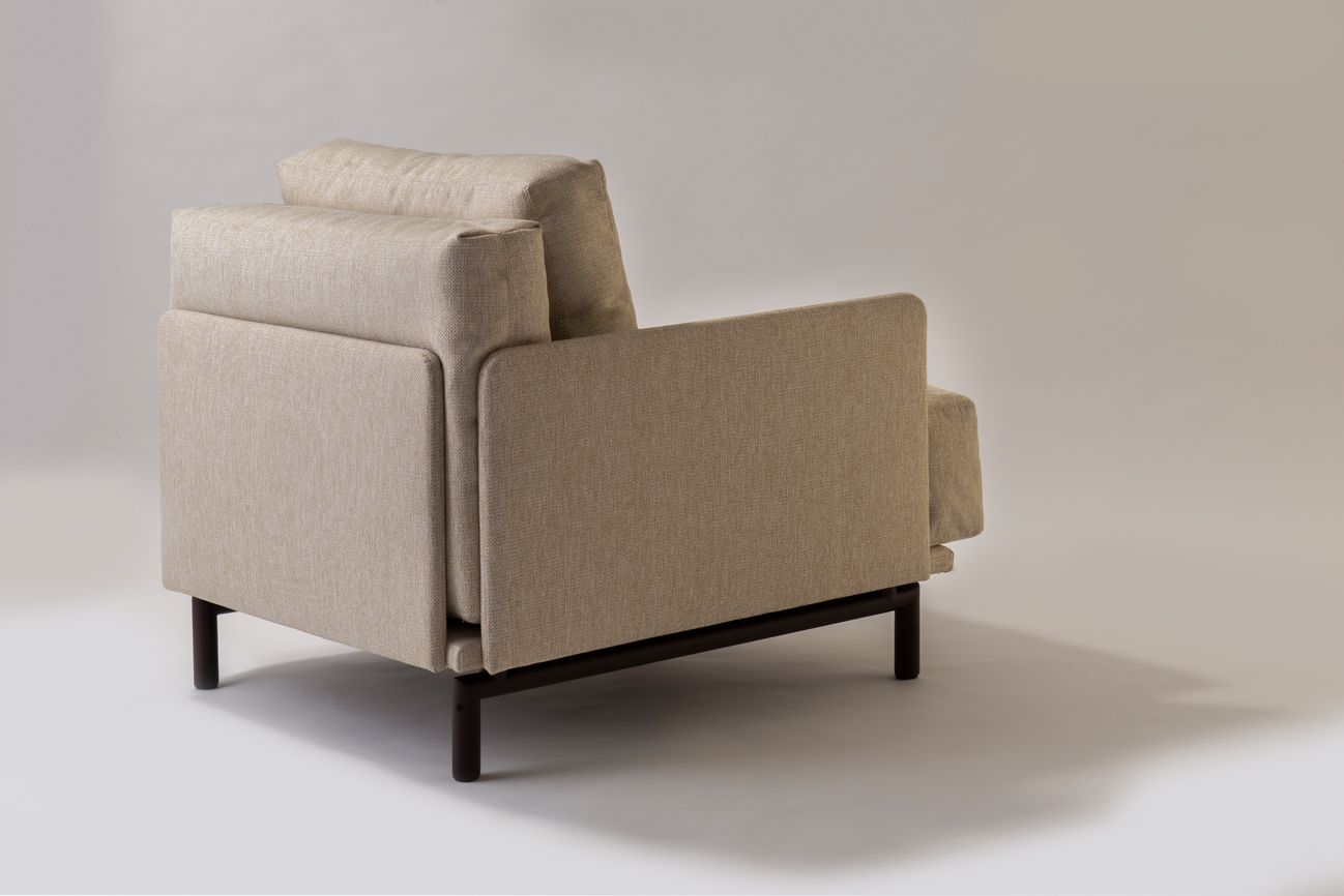 Poltrona com almofadas de pluma e pés de metal com acabamento corten.