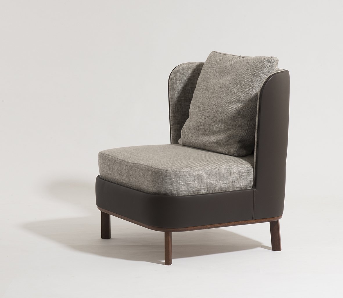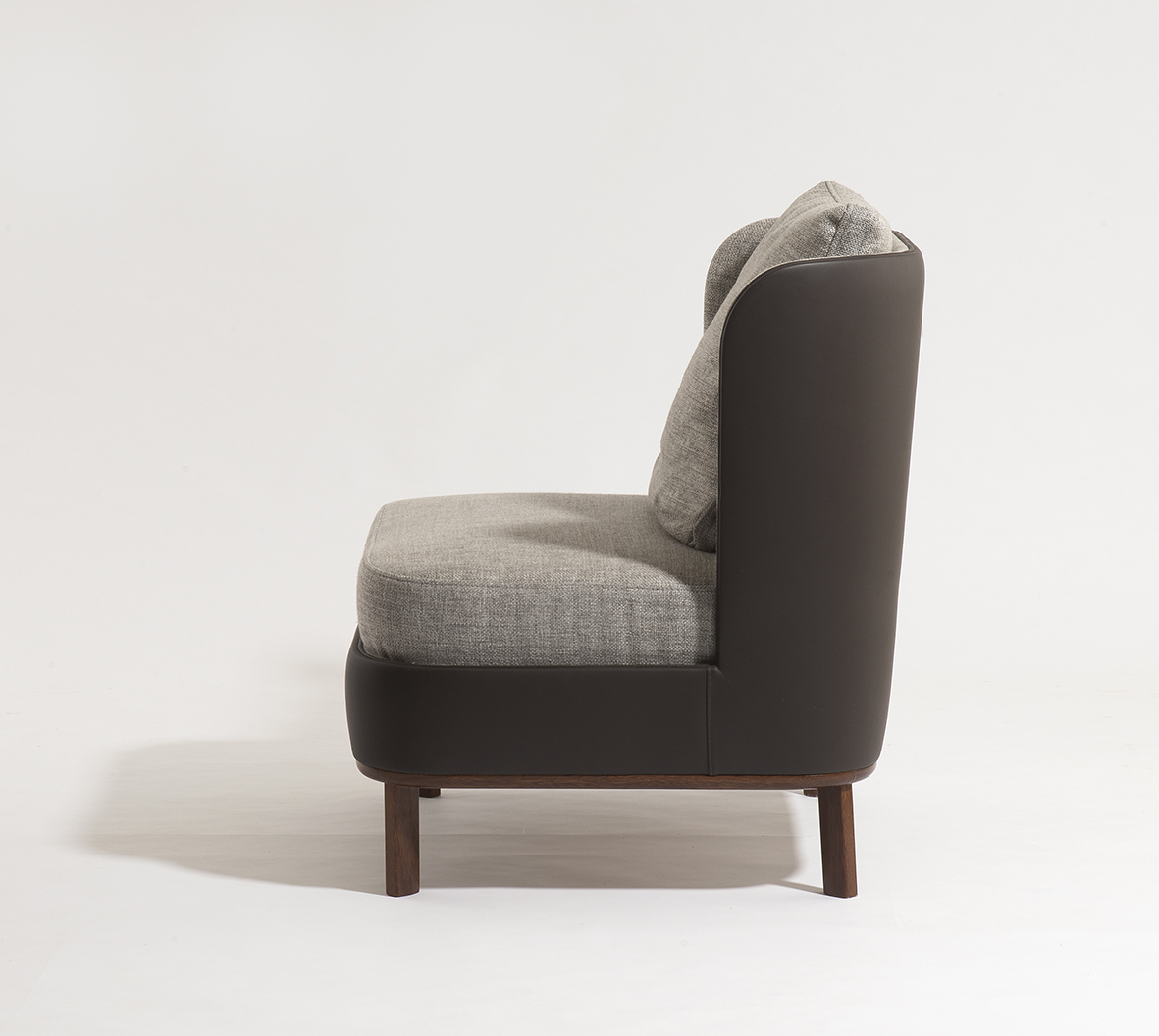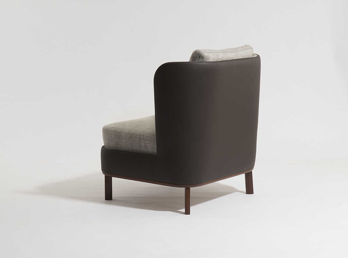 Poltrona Rimini, possui assento em molas espiral ensacadas e almofadas de encosto de pluma. pode ser produzida com o acabamento externo em couro ou tecido e o acabamento interno em tecido, seus pés e bases podem ser em sucupira, sucupira lavado e freijó.