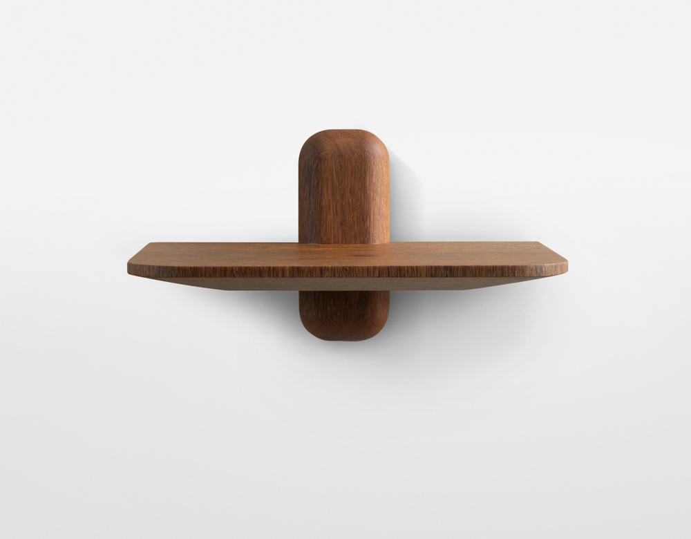 A prateleira Tokyo é uma peça suspensa e possui seu eixo em madeira maciça.