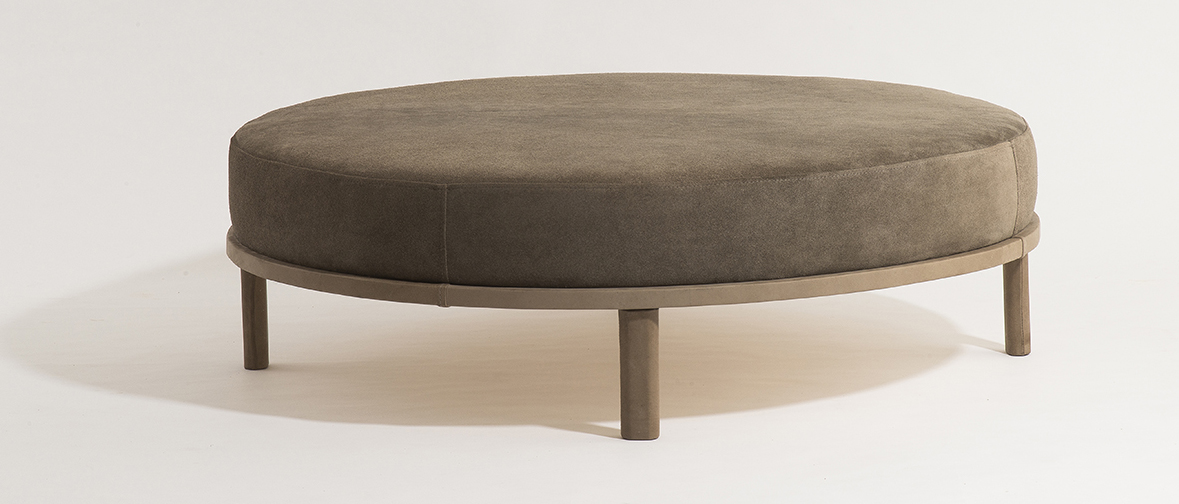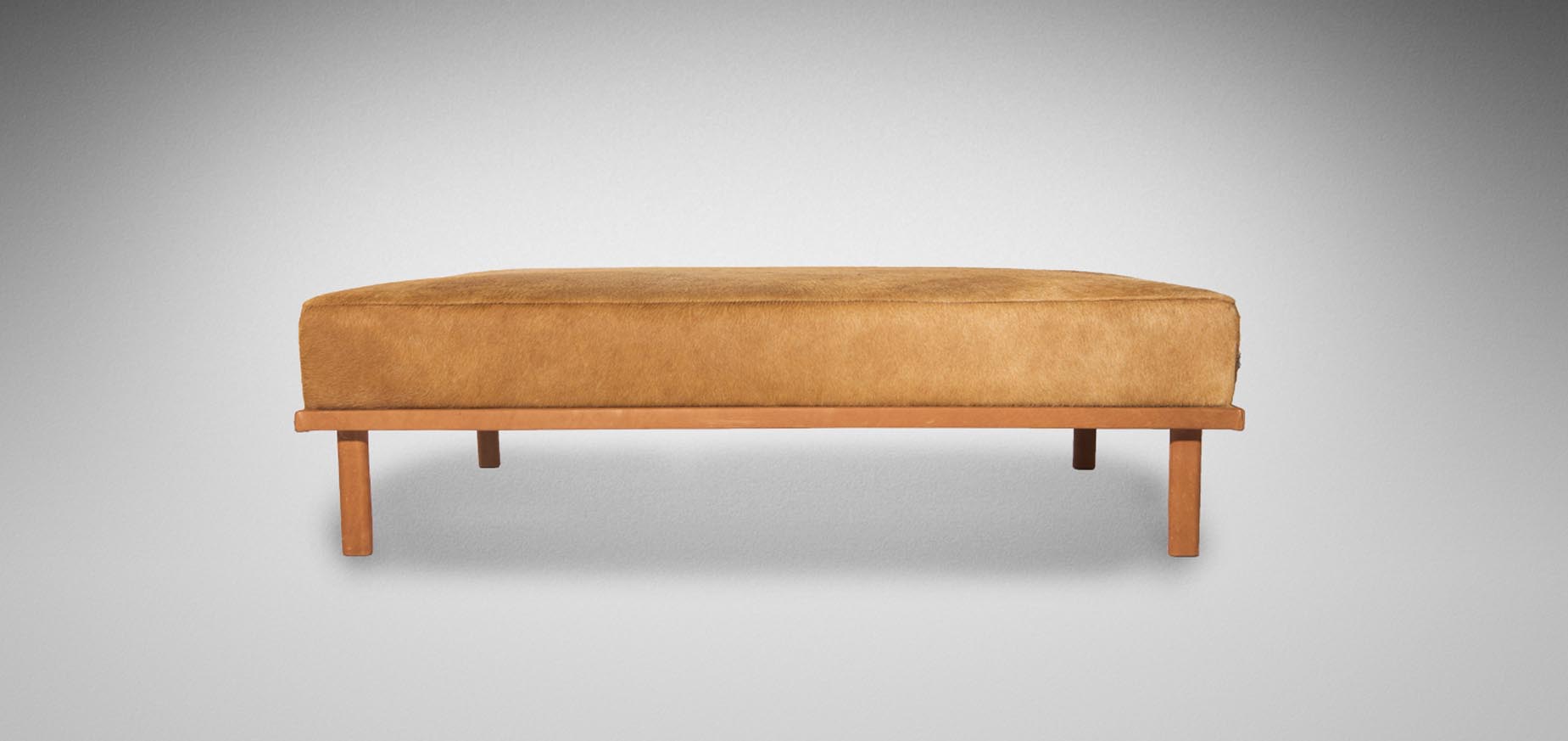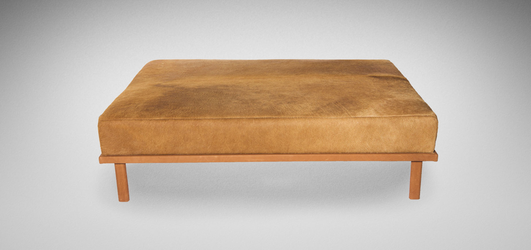 Puff com estrutura revestida em camurça, nessa foto recebeu pele natural de boi com pelos.