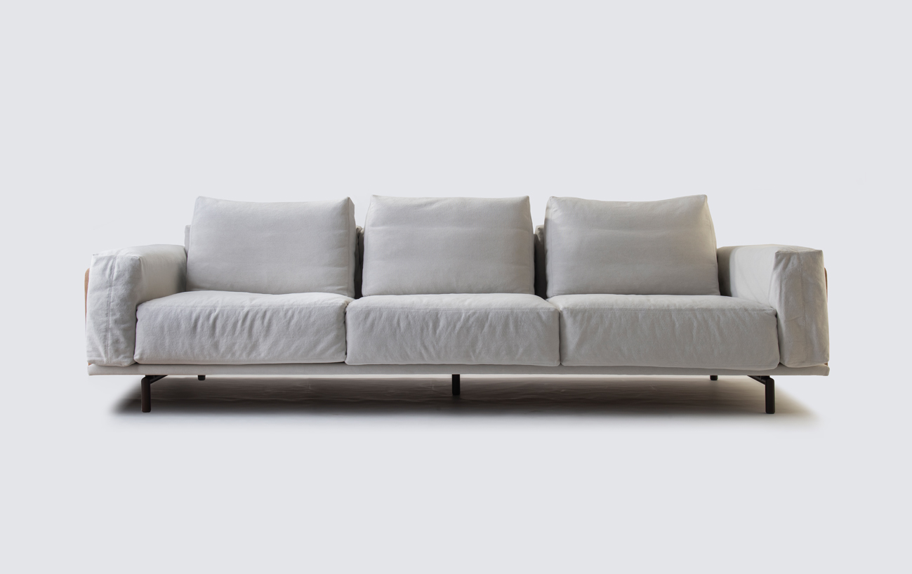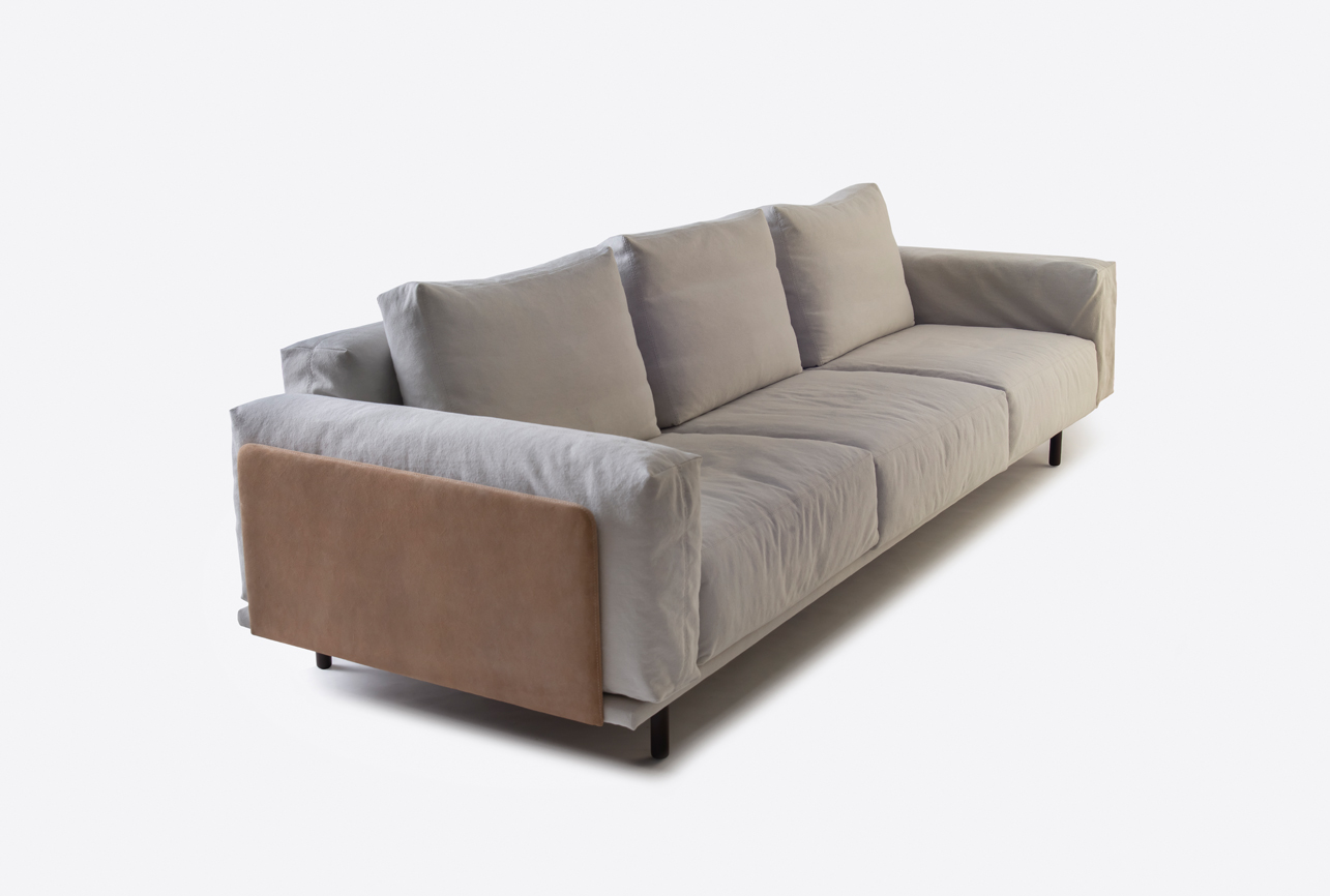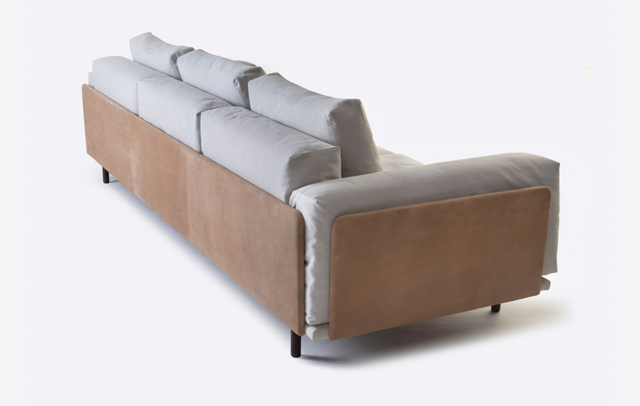 Sofá com almofadas de pluma e pés de metal com acabamento corten.