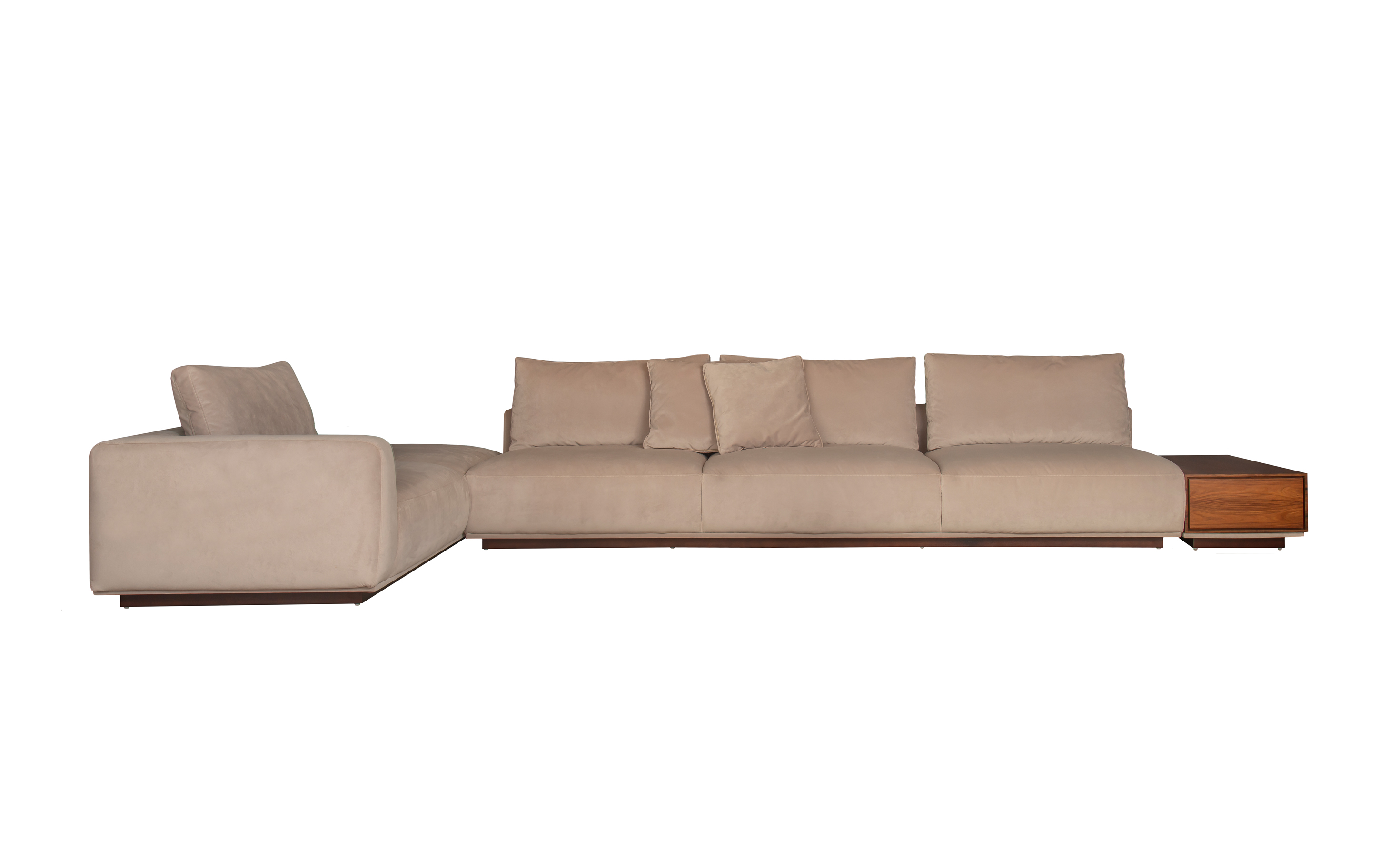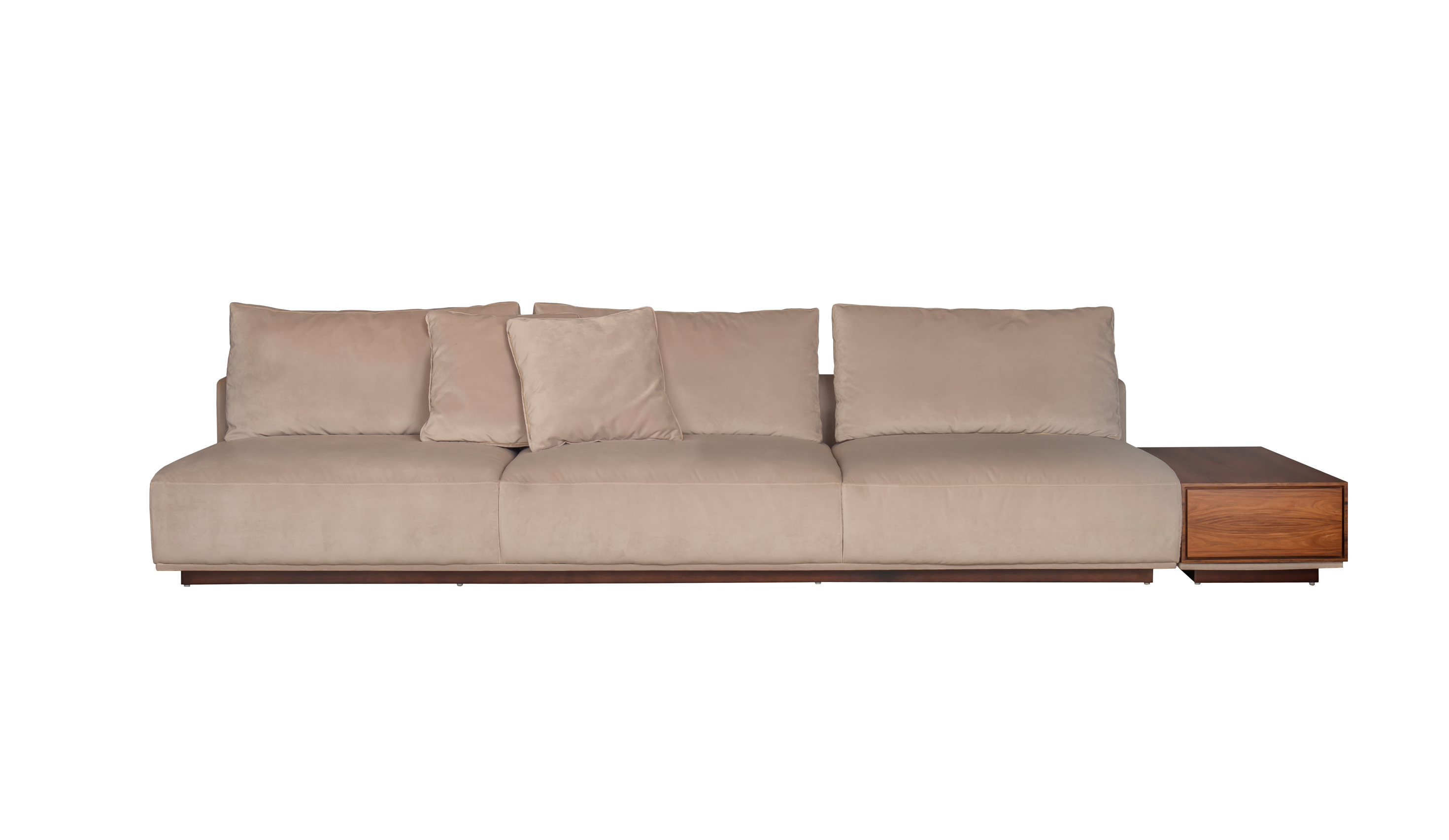 Sofá componível com base recuada em madeira e mesa lateral com gaveta.