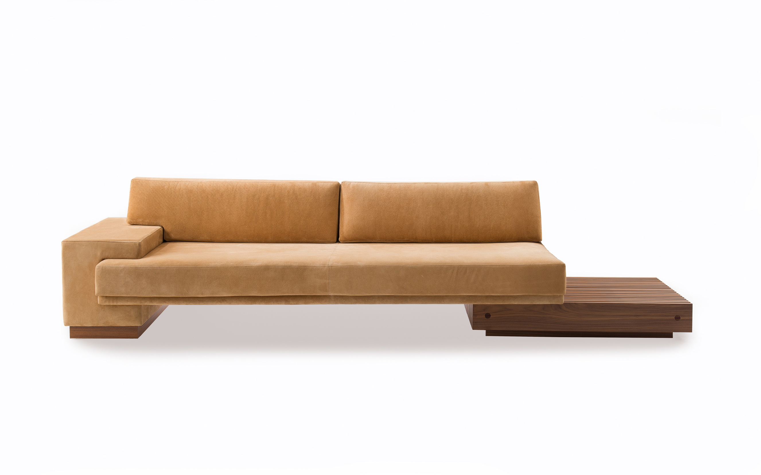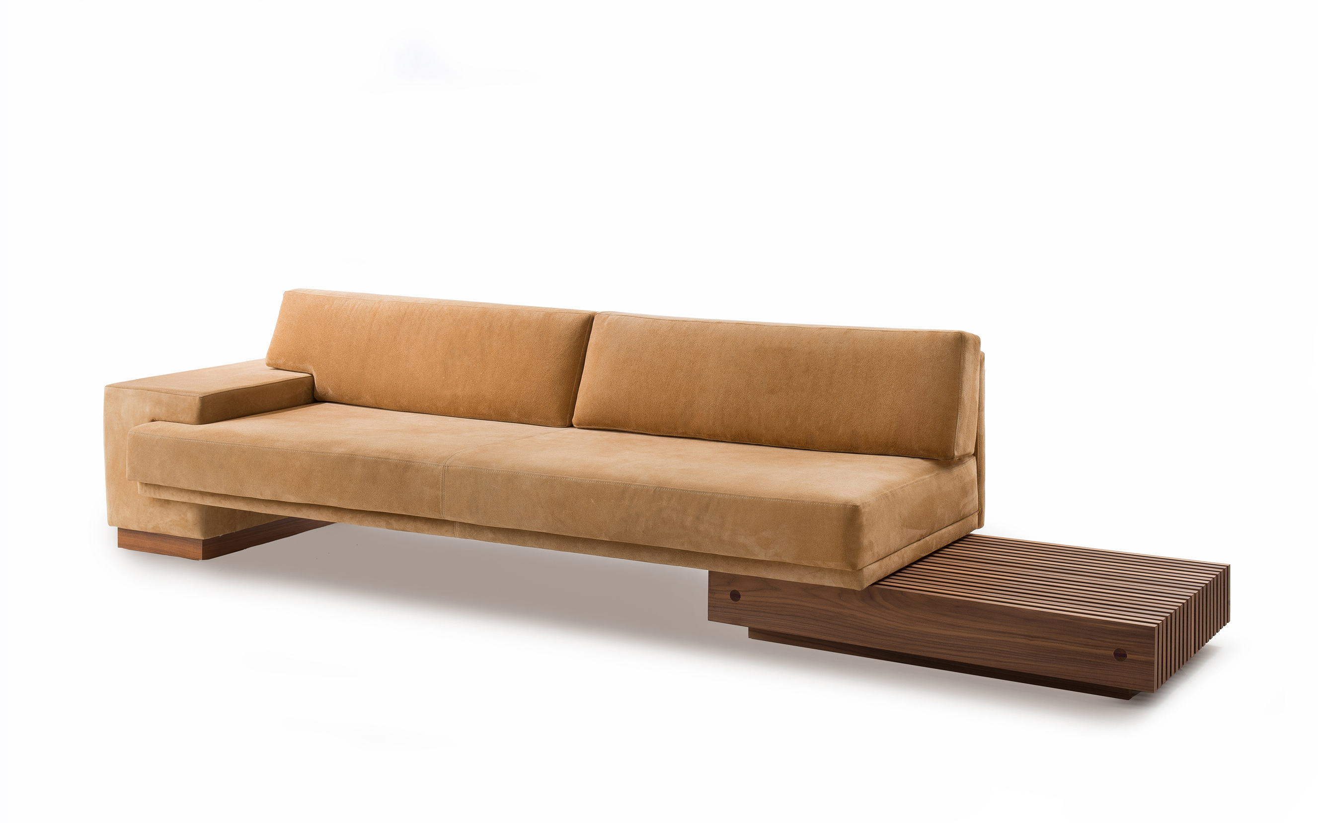 Sofá Rocco foi pensado para ser um sofá baixo e com ótimo conforto, ele possui de um lado braço e do outro uma mesa em pergolado que invade o sofá dando apoio junto a um pé oculto, a mesa pode ser ajustável no seu posicionamento.